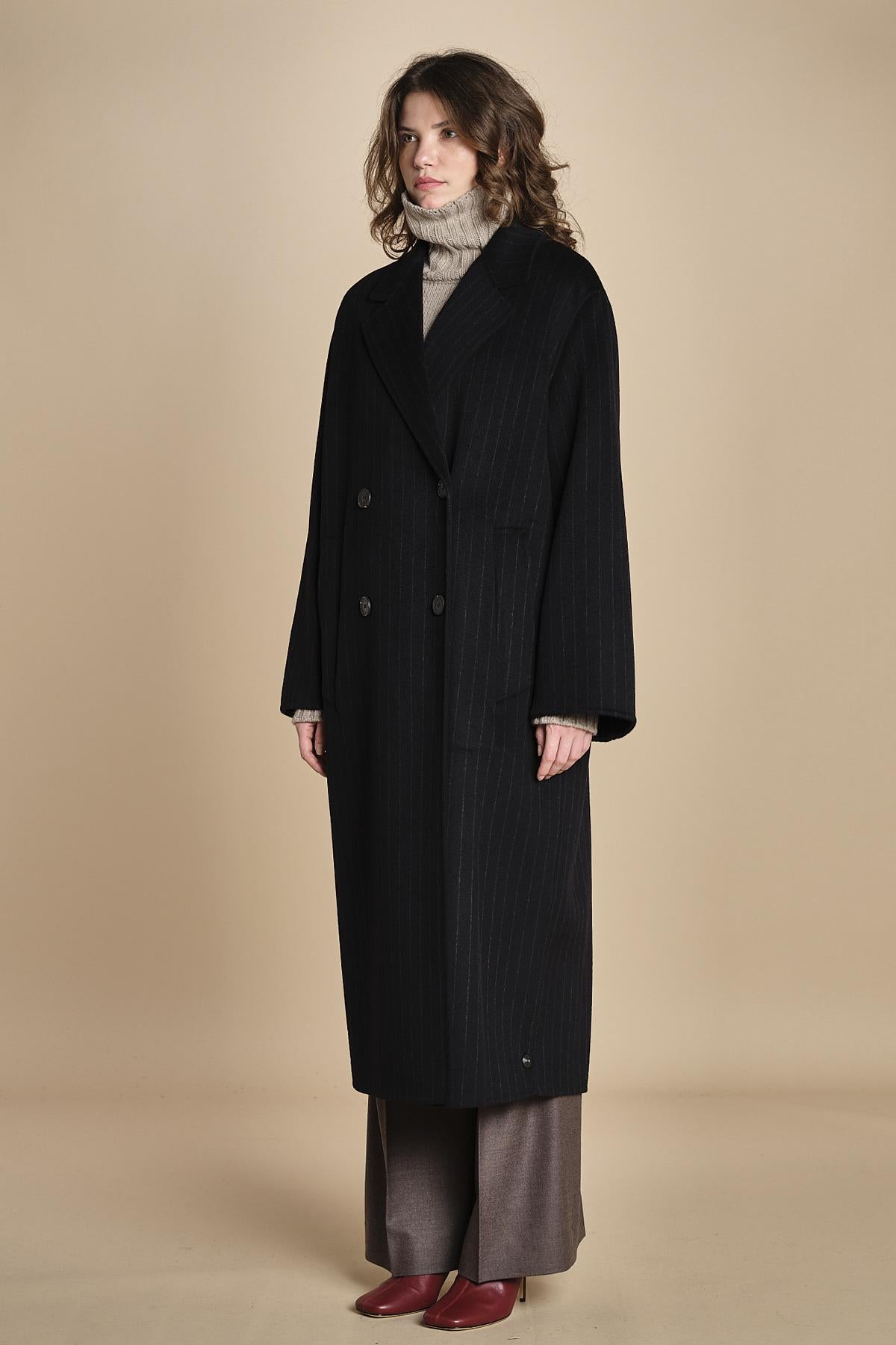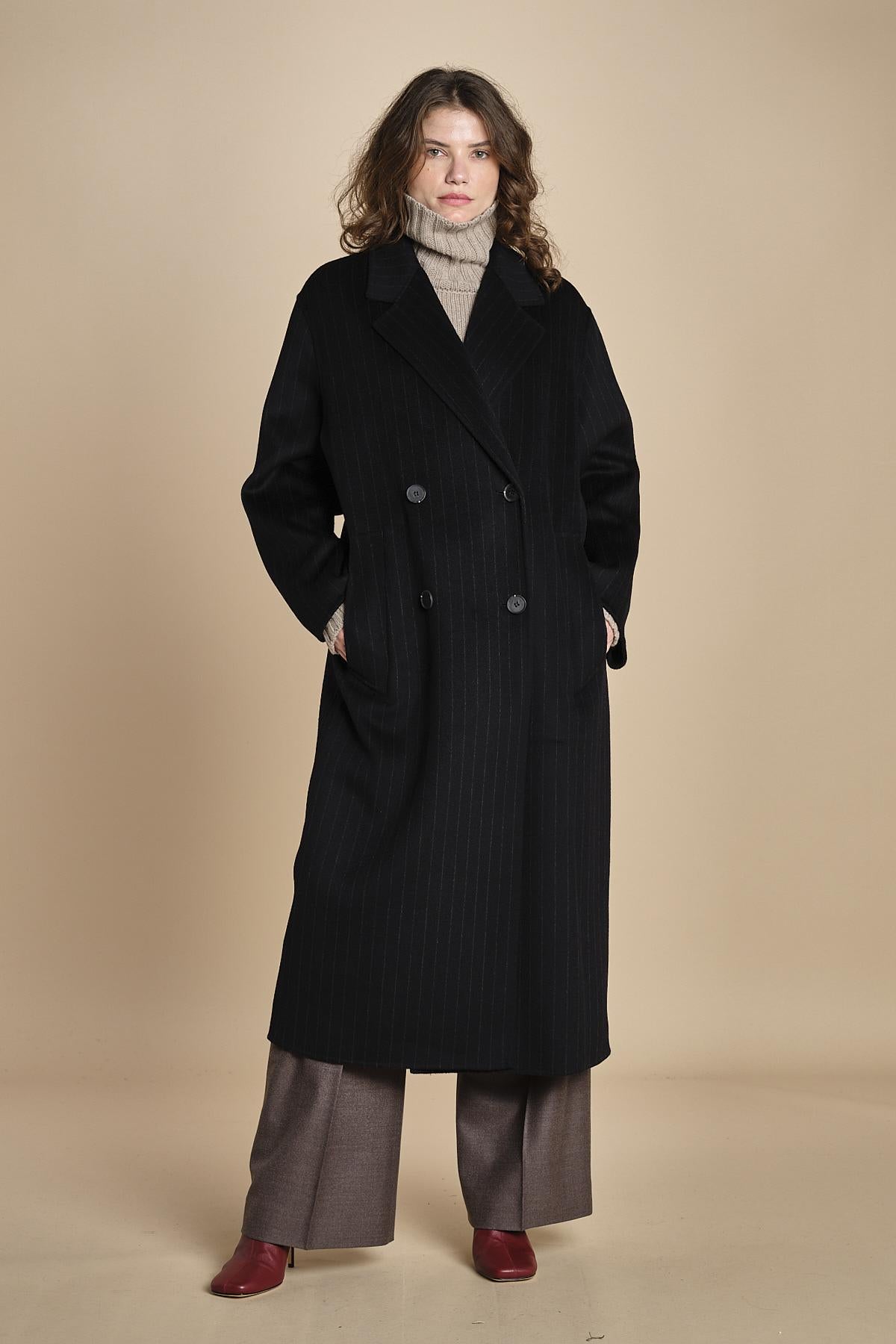 cappotto doppiopetto. La modella è alta 176 cm e indossa una taglia 38. 100% LANA