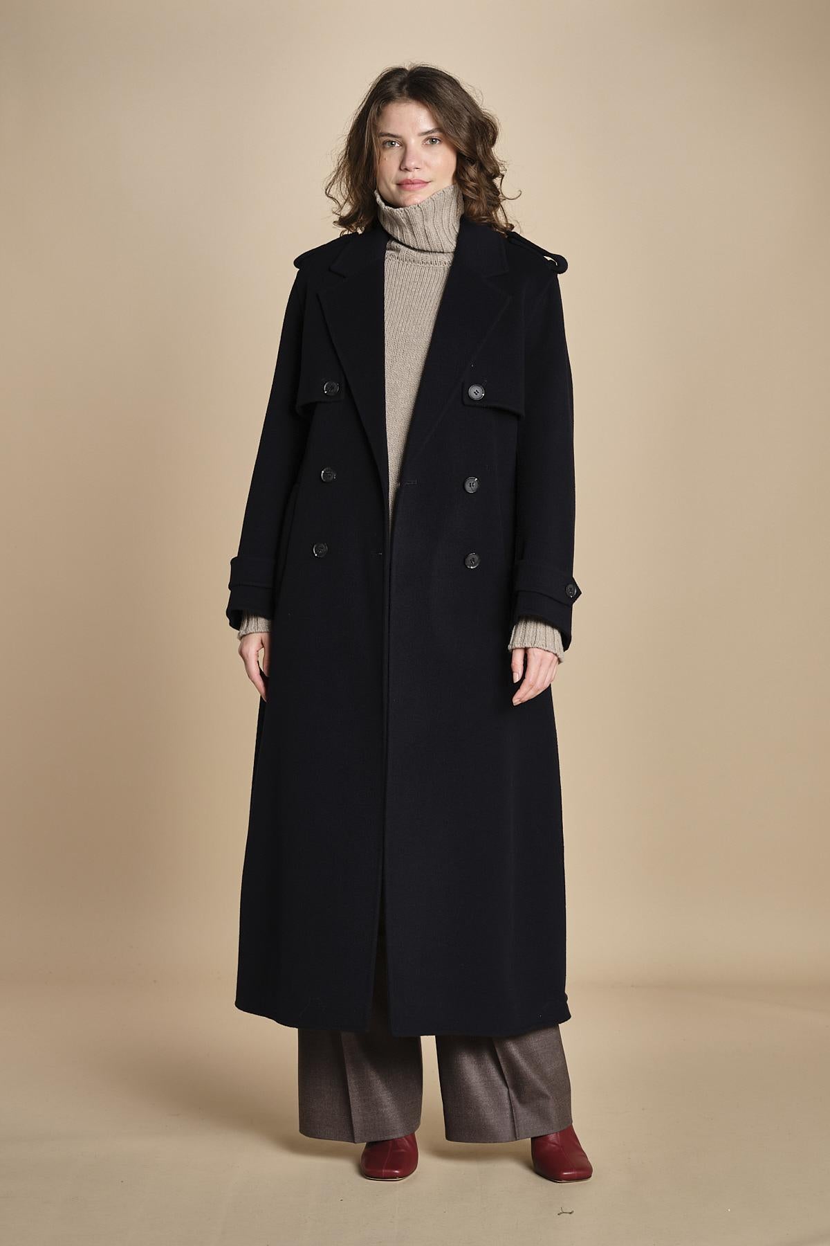 trench double lungo over. La modella è alta 176 cm e indossa una taglia 38. 100% LANA