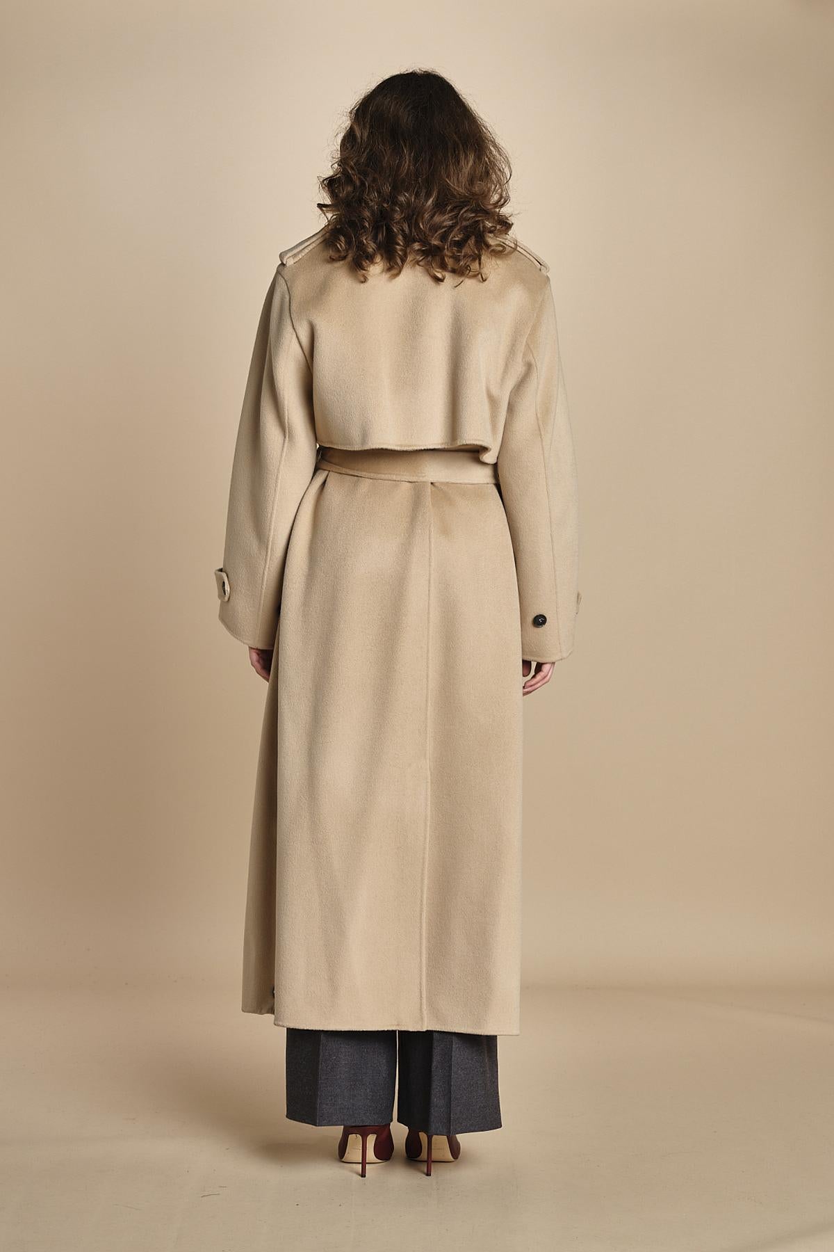 trench double lungo over. La modella è alta 176 cm e indossa una taglia 38. 100% LANA