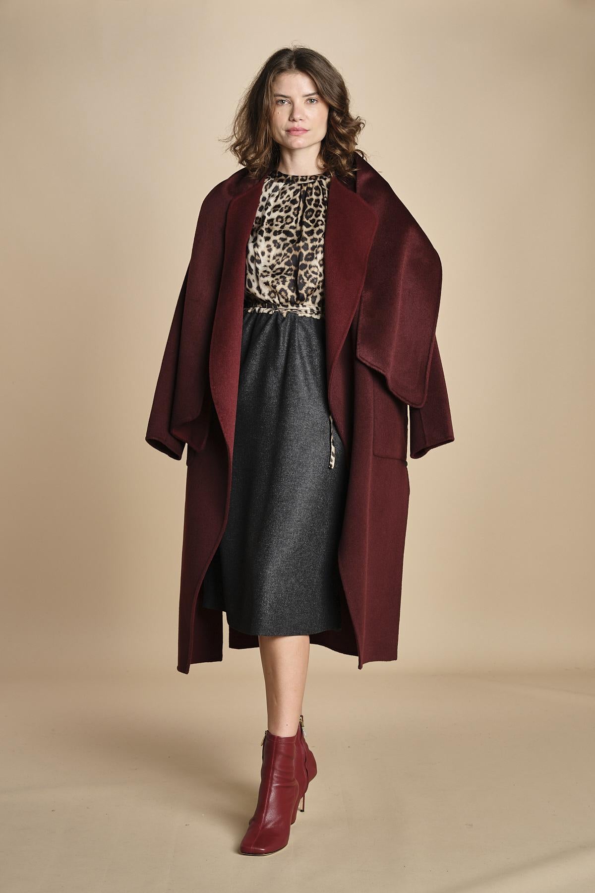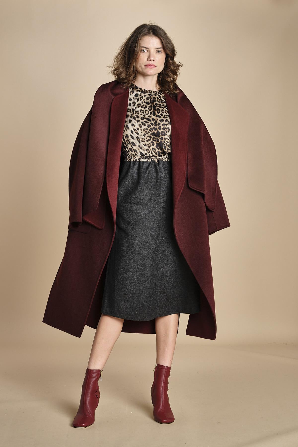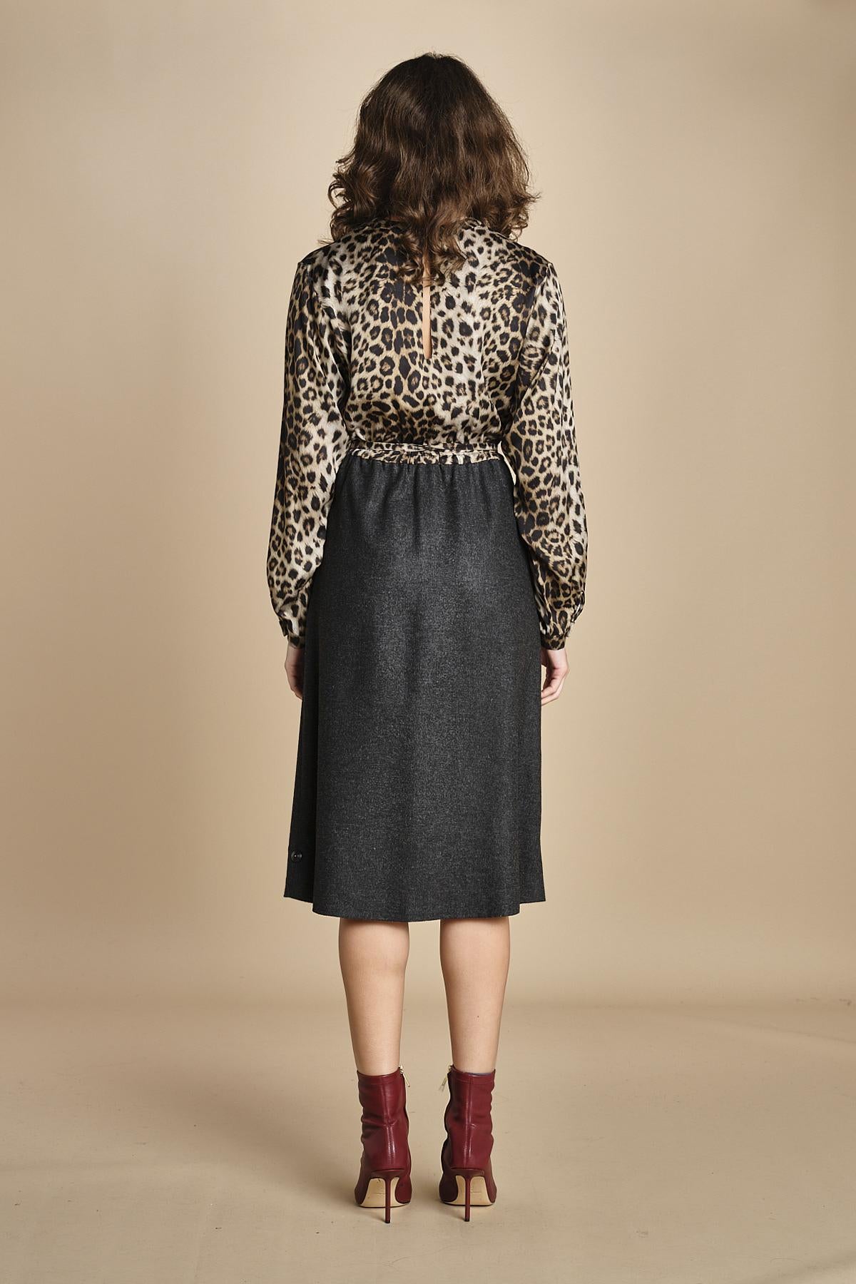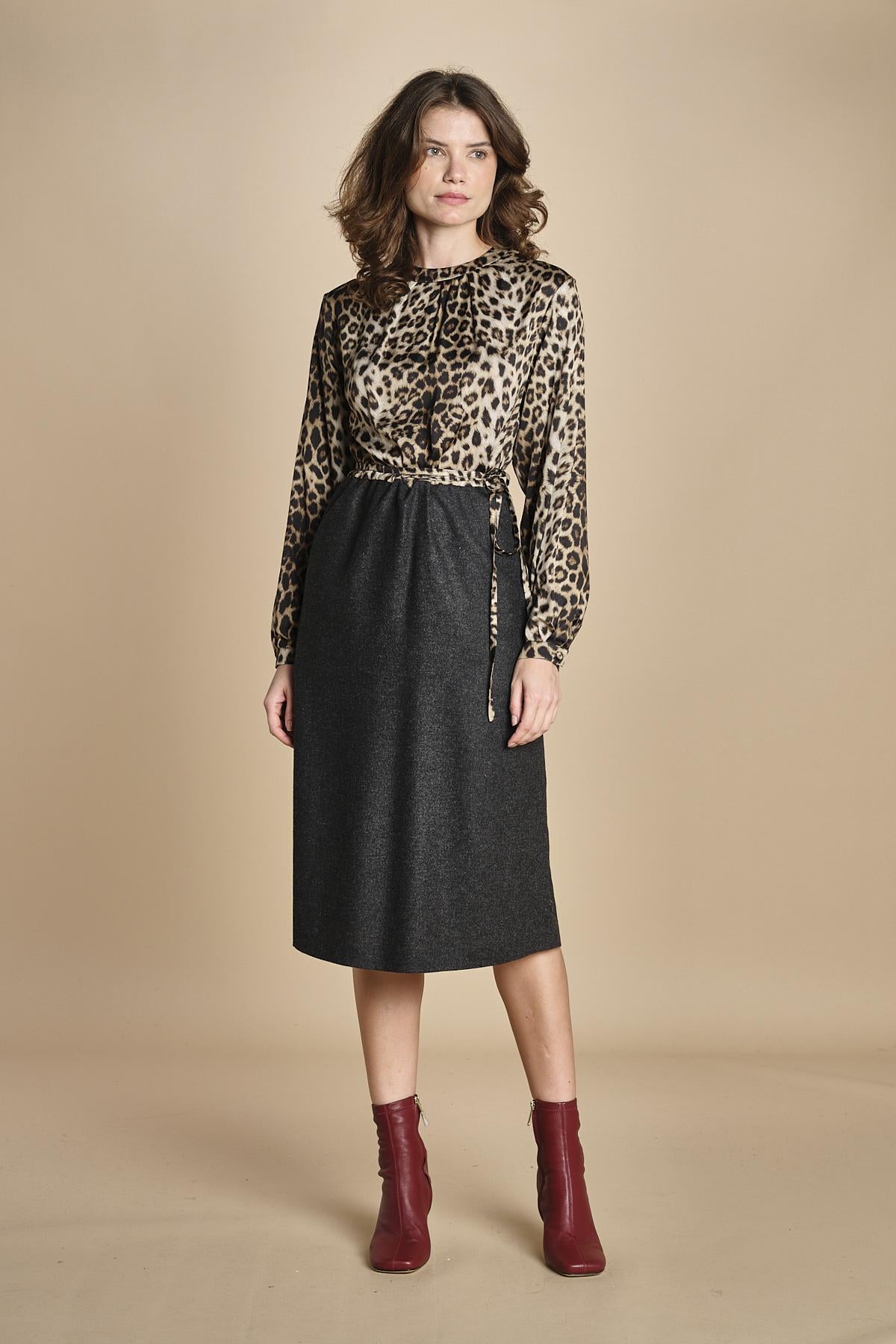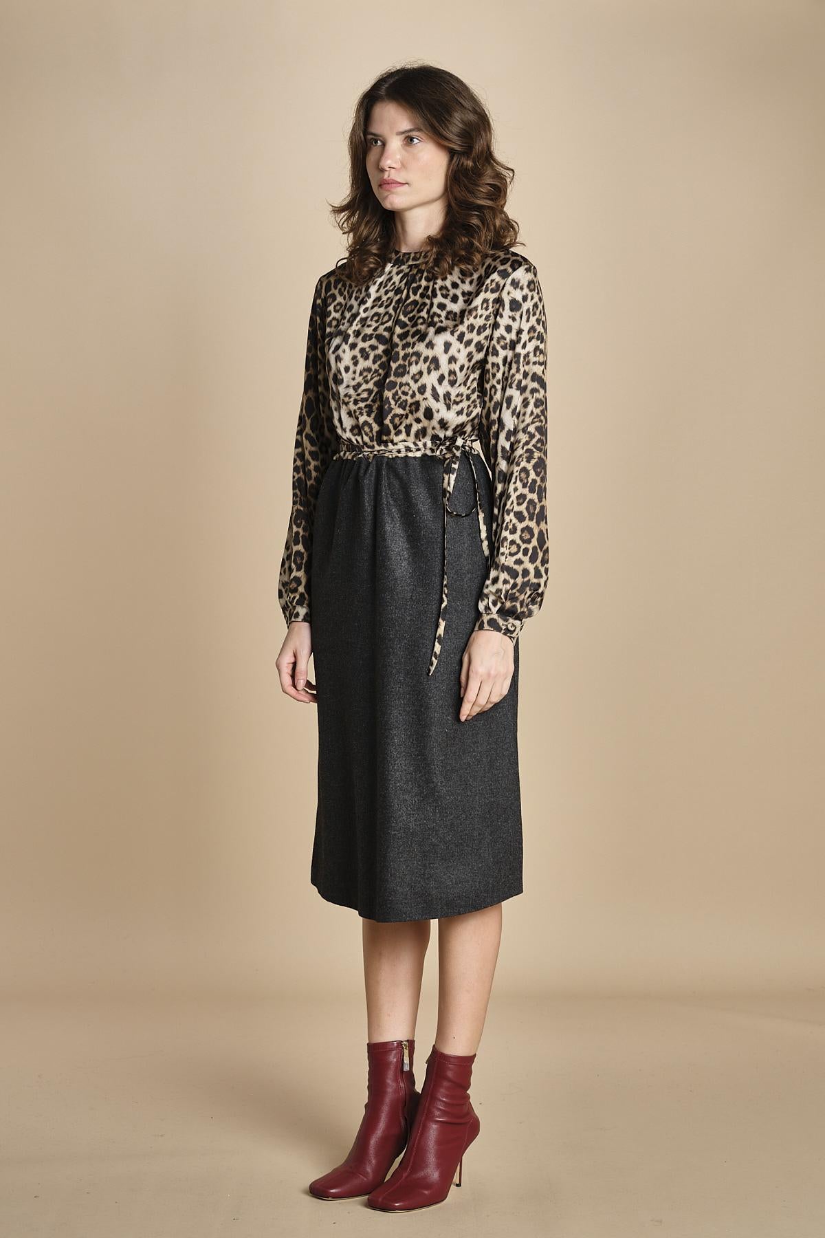 abitomidi con top maculato. La modella è alta 176 cm e indossa una taglia 0. 70% VISCOSA 30% LANA
