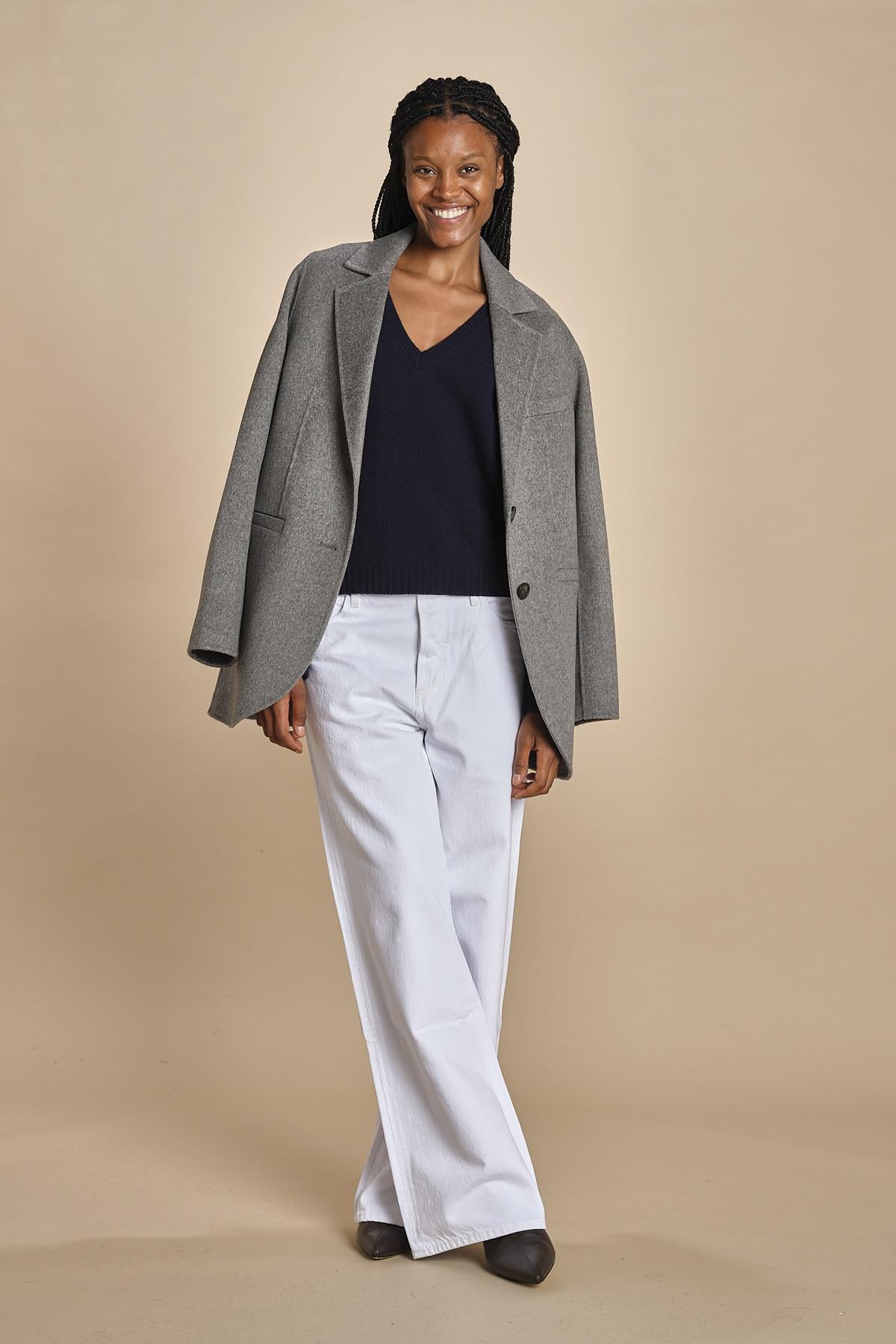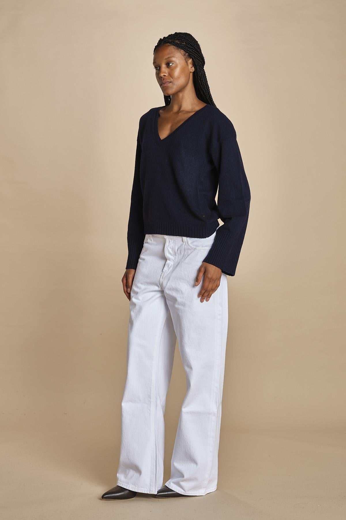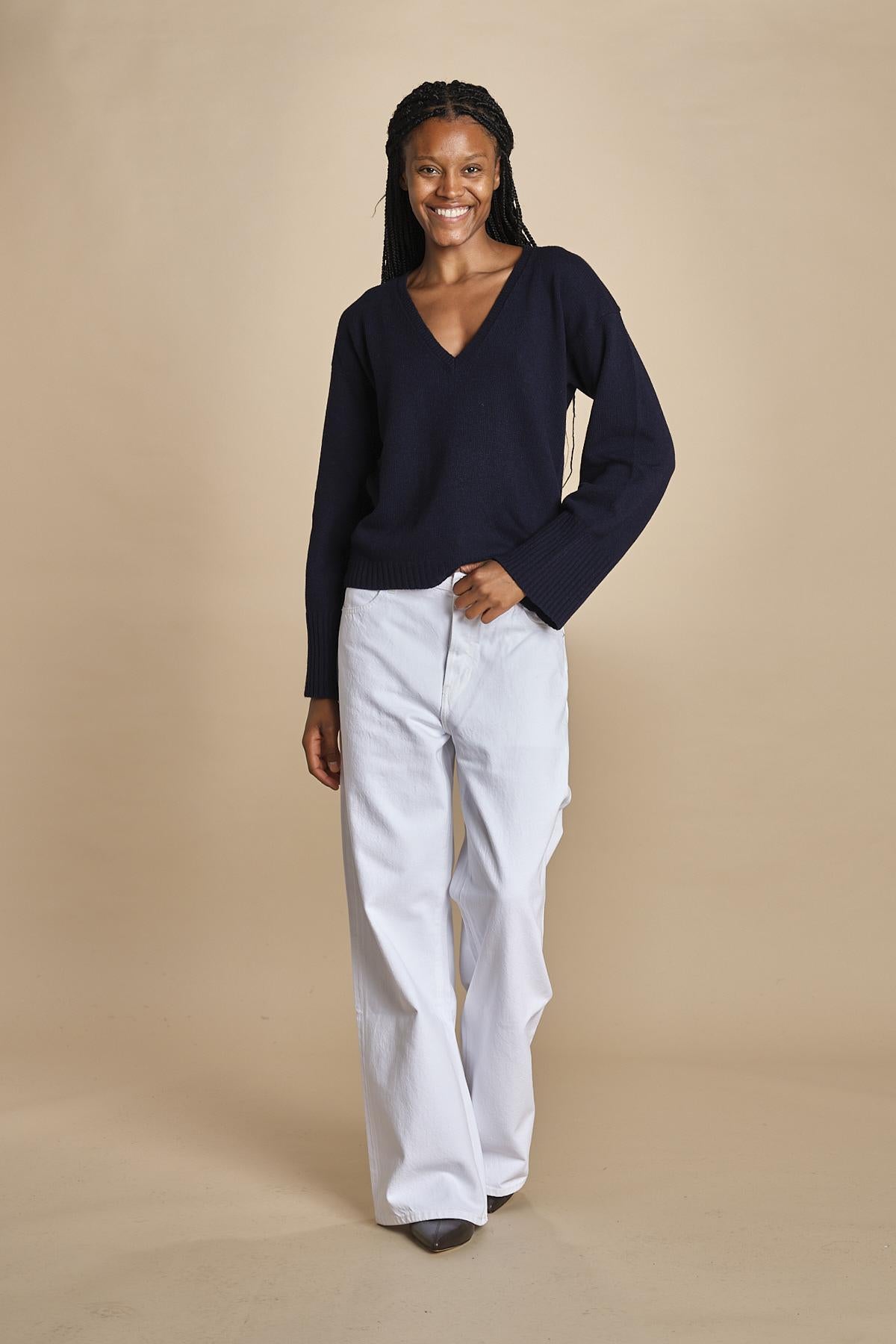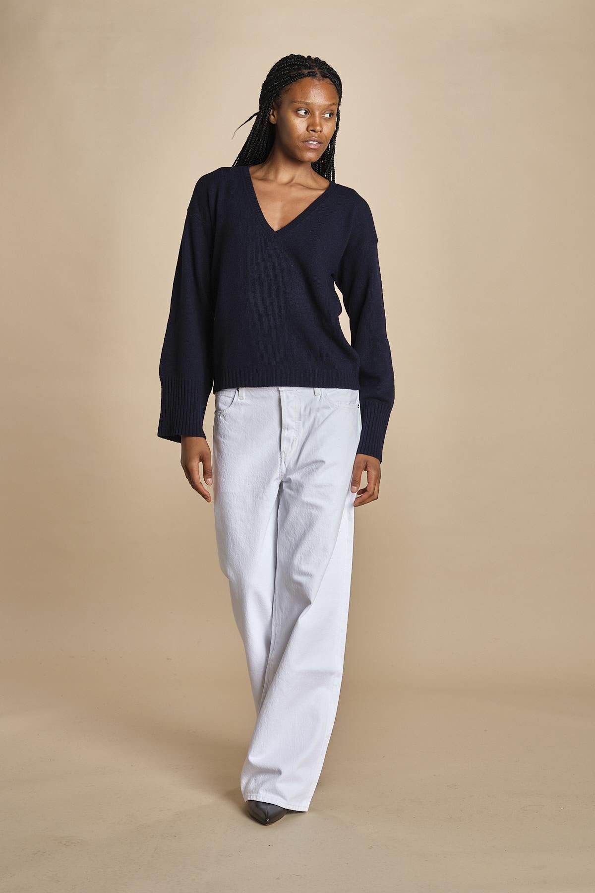 maglia con scollo a v e manica a campana by milaura. La modella è alta 174 cm e indossa una taglia S. Composizione: 40%lana, 30% viscosa, 20% polliammide, 10% cashmere.