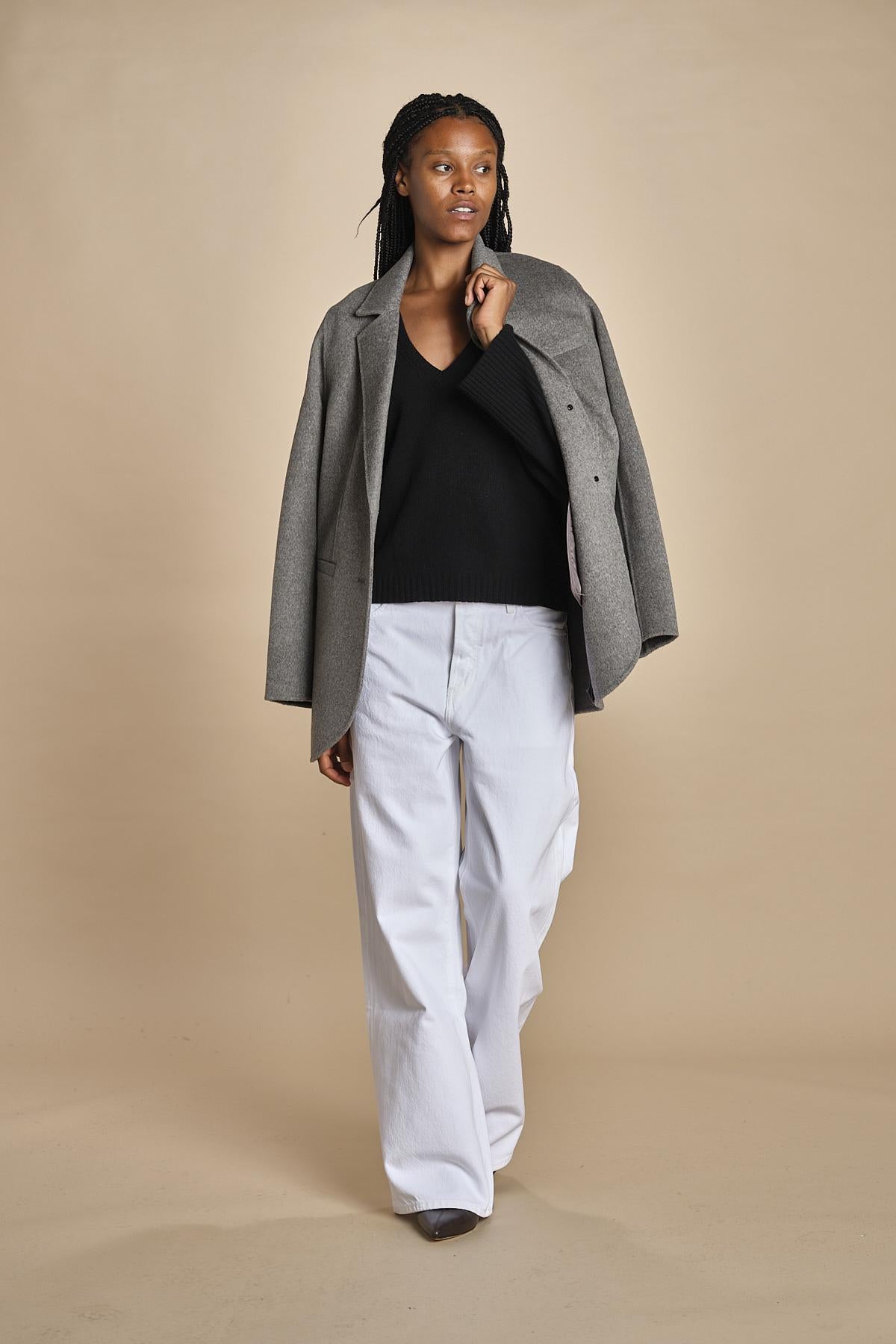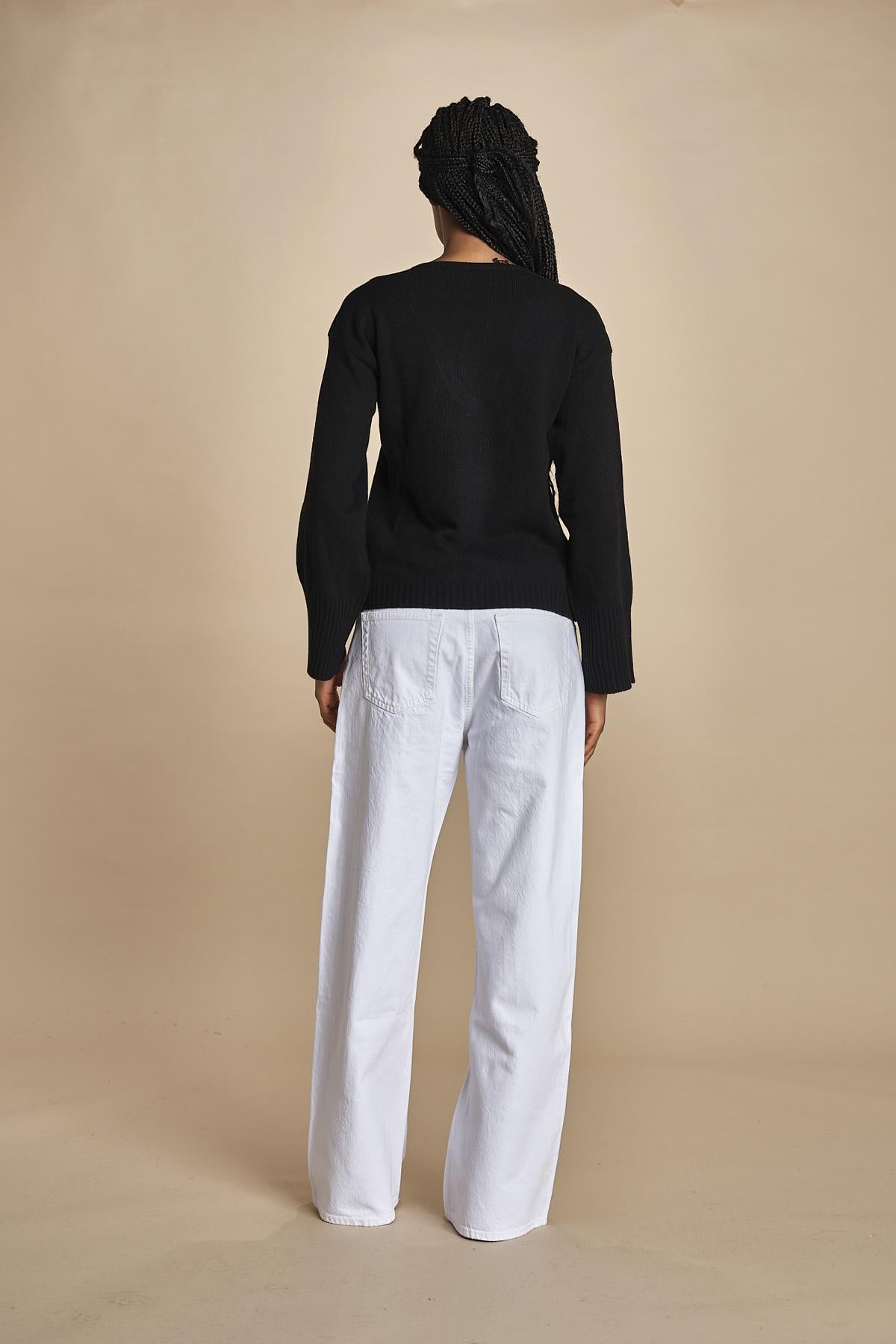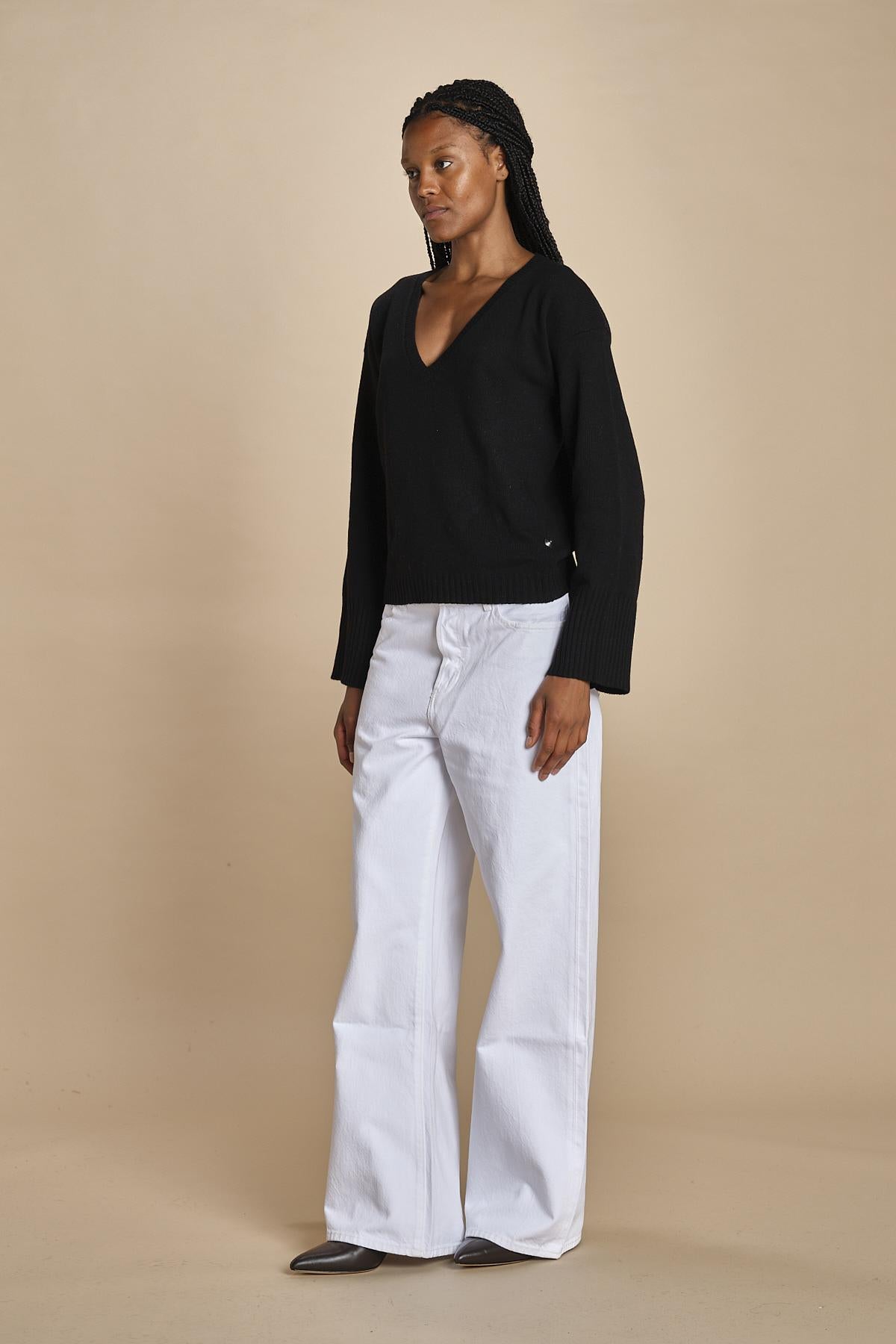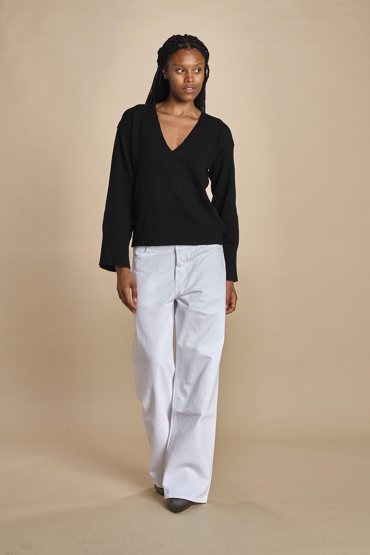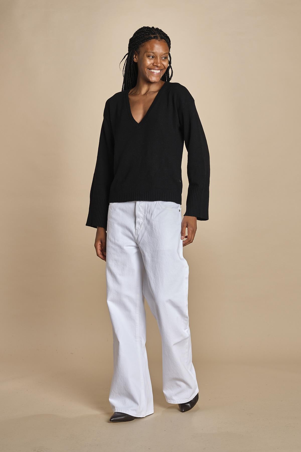 maglia con scollo a v e manica a campana by milaura. La modella è alta 174 cm e indossa una taglia S. Composizione: 40%lana, 30% viscosa, 20% polliammide, 10% cashmere.