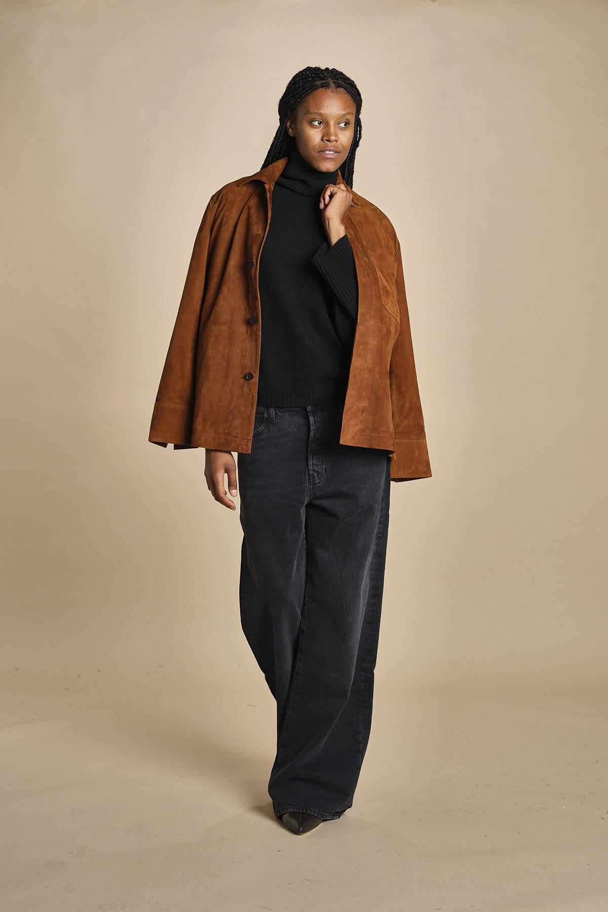 dolcevita con manica a campana by milaura. La modella è alta 174 cm e indossa una taglia S. Composizione: 40%lana, 30% viscosa, 20% polliammide, 10% cashmere.
