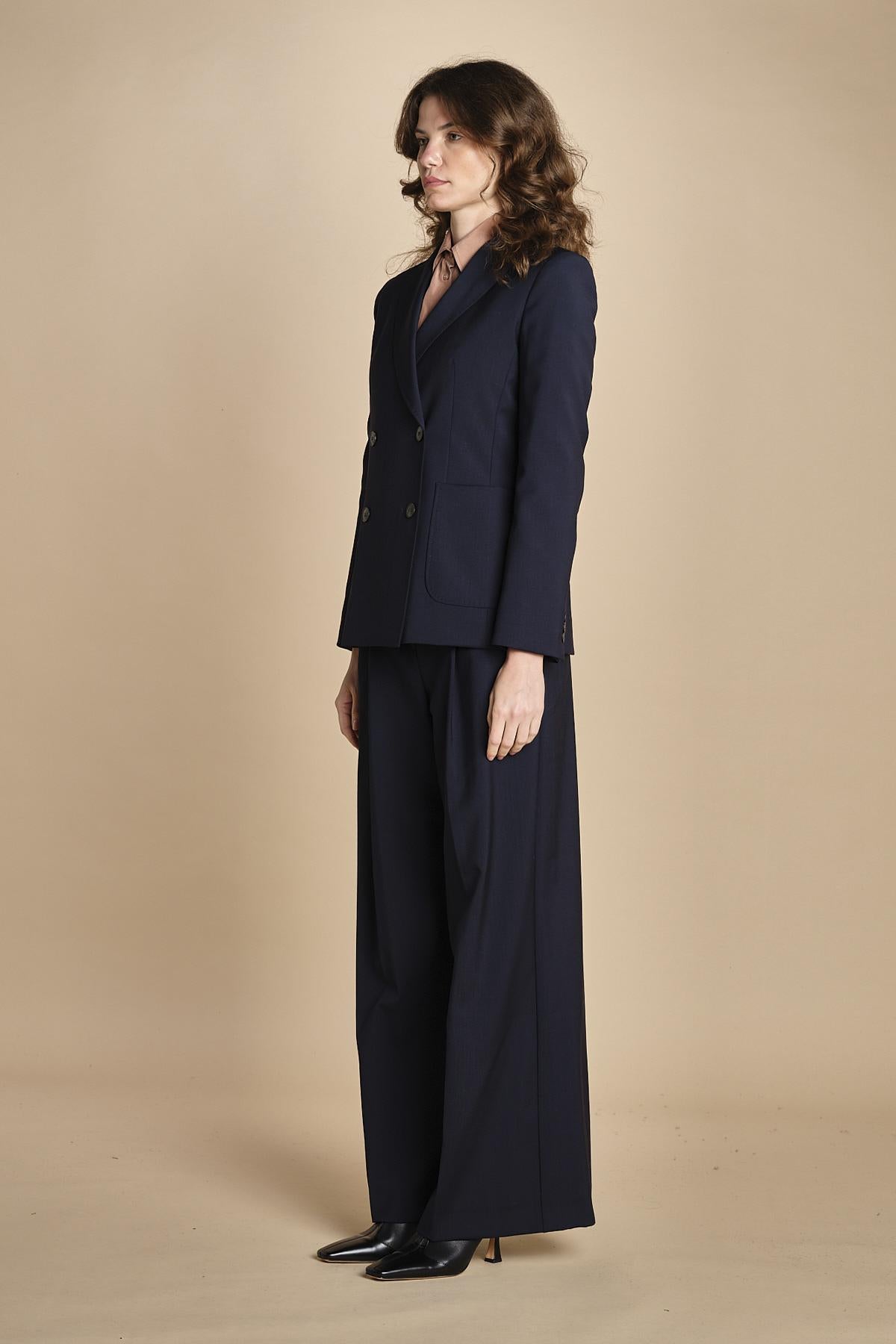 doppiopetto tela lana. La modella è alta 176 cm e indossa una taglia 40. 100% lana