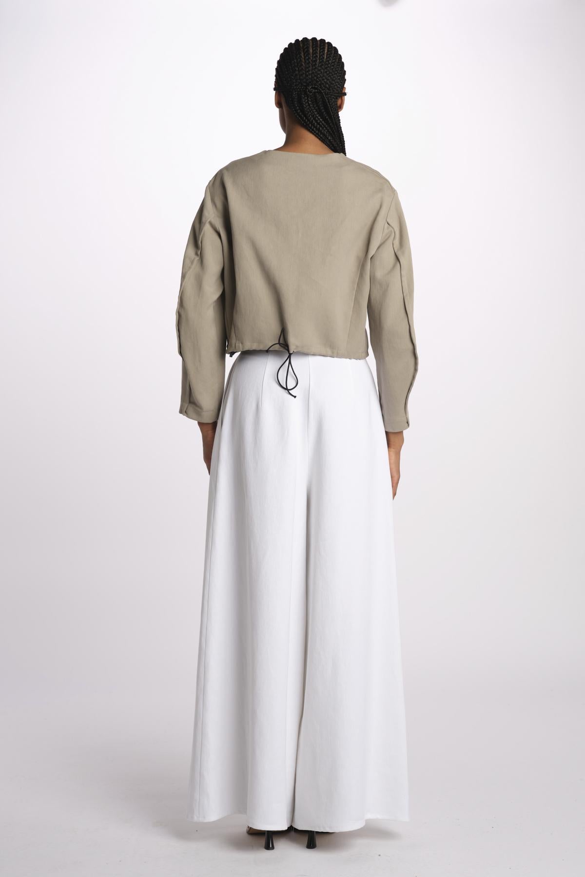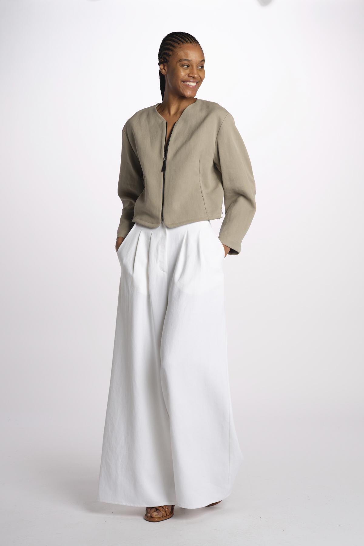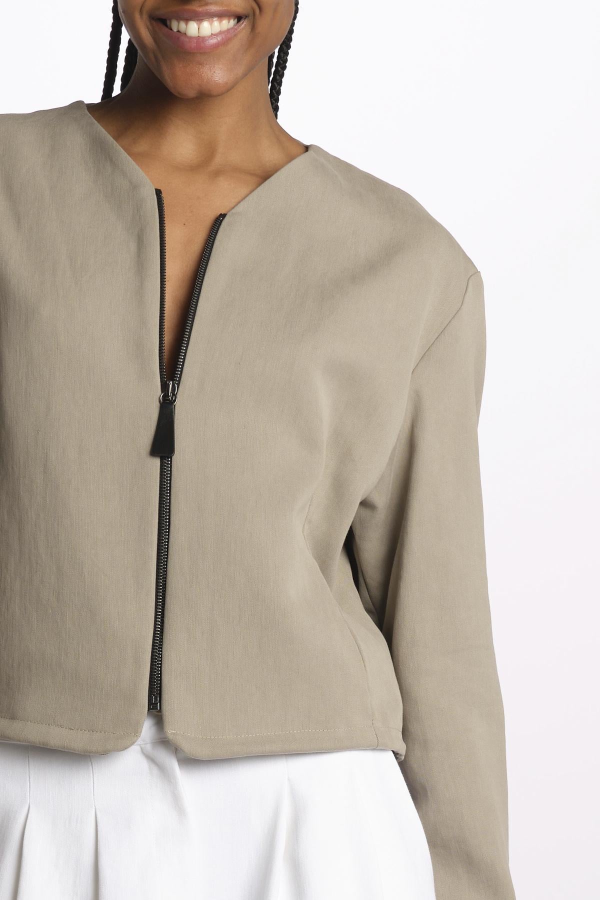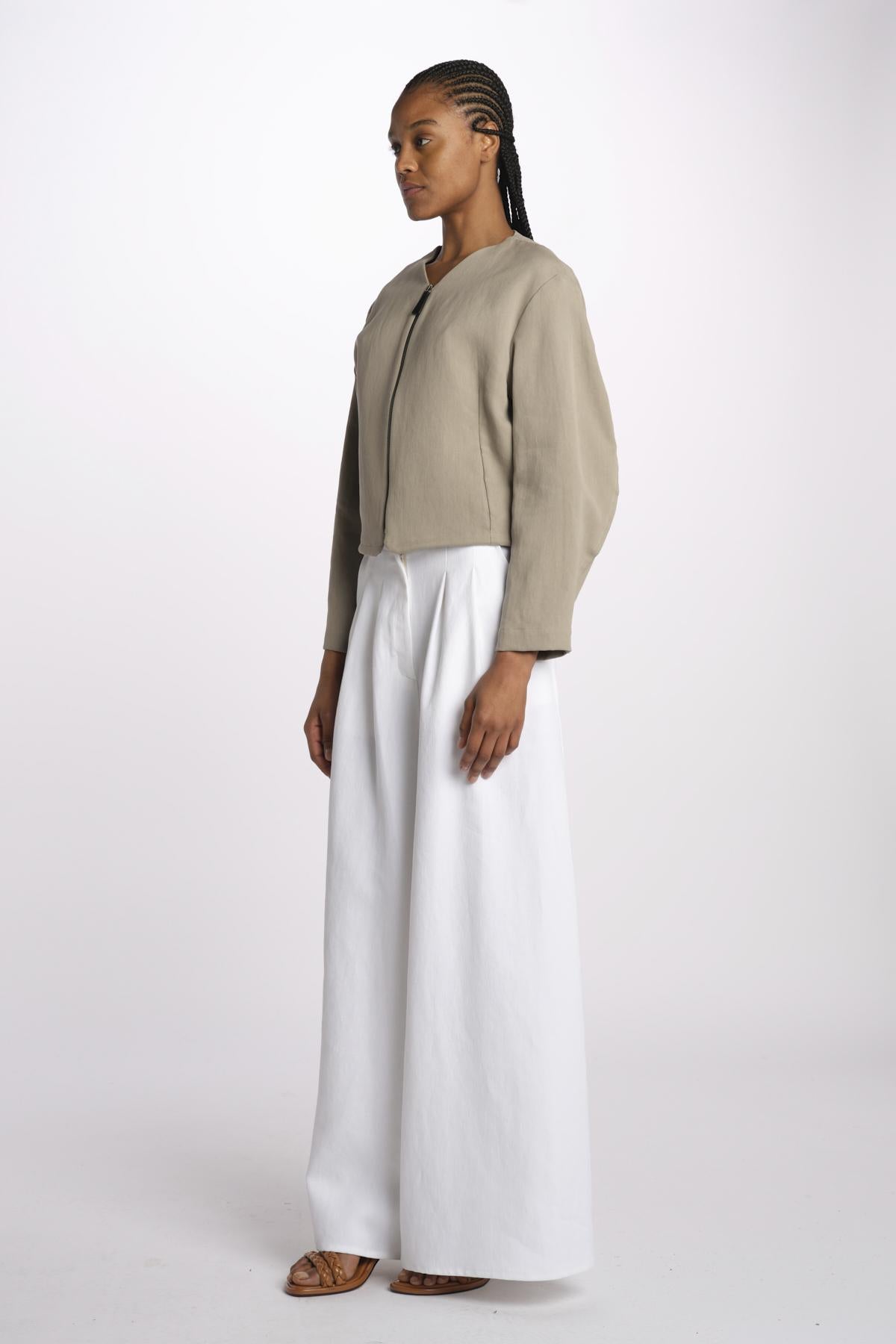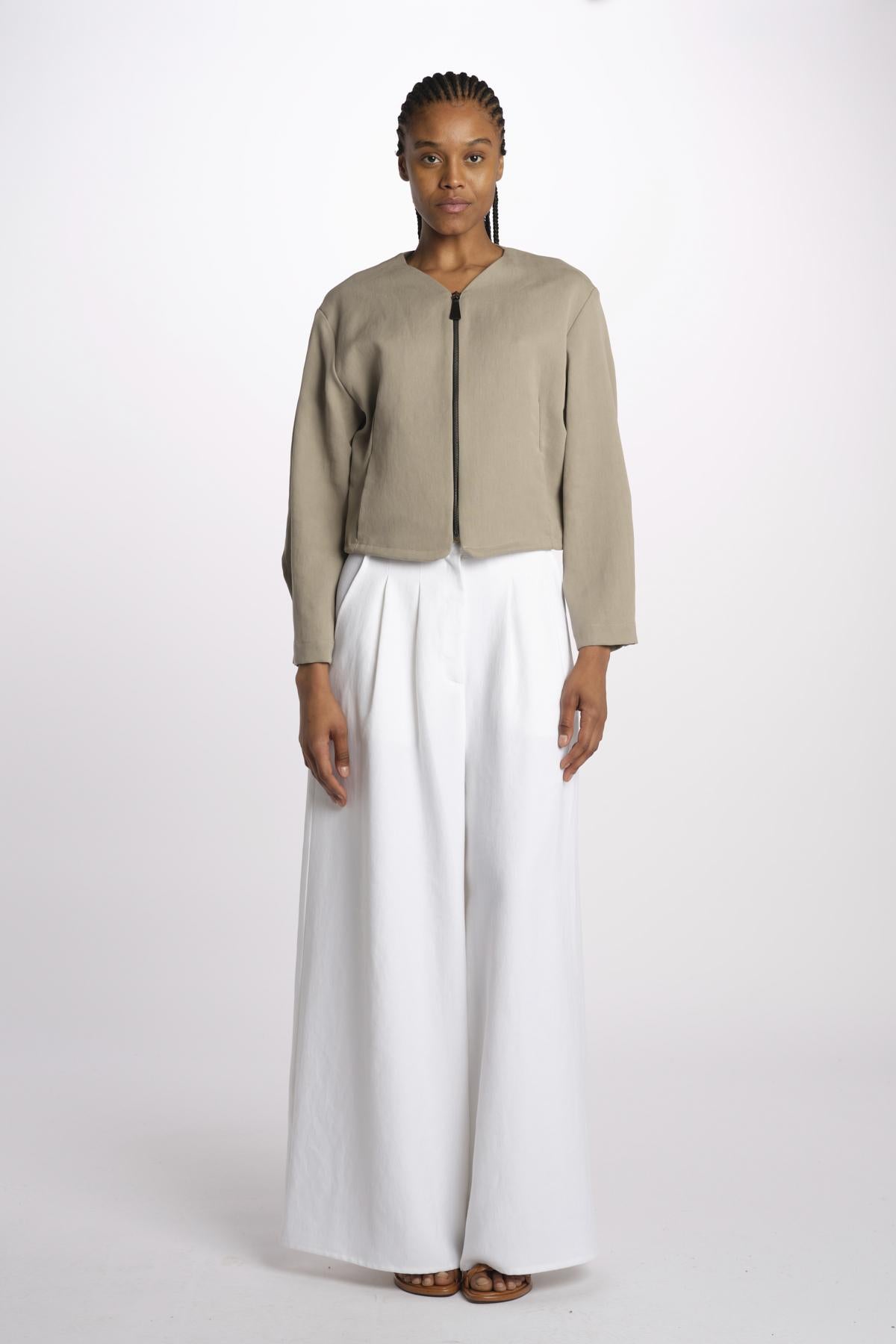 1333 bomber lino enzimato by dusan. La modella è alta 174 cm e indossa una S. Composizione: 100% lino.