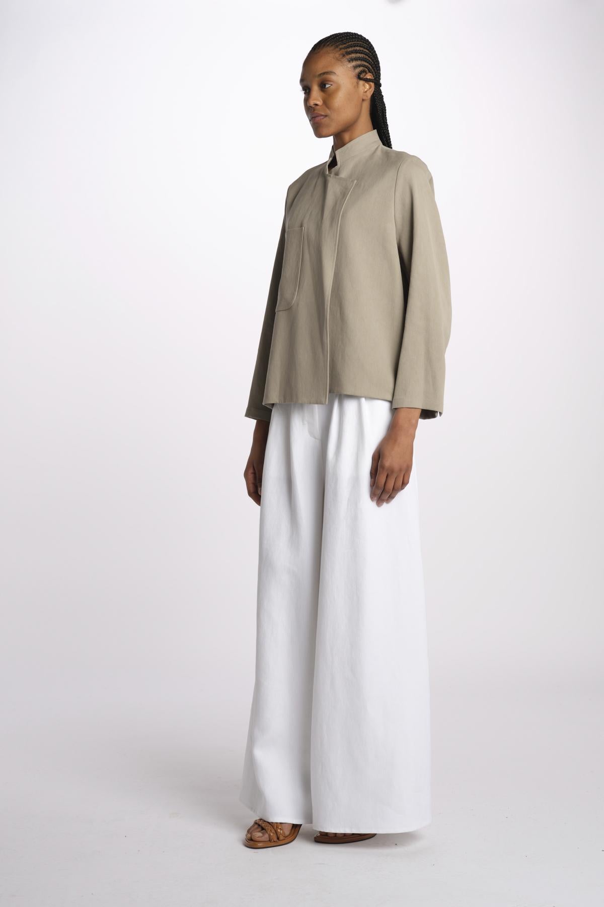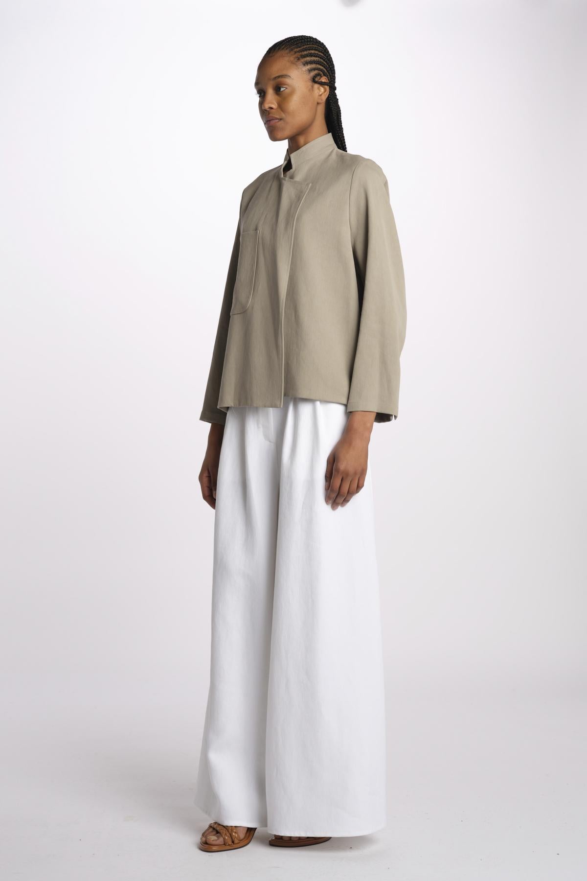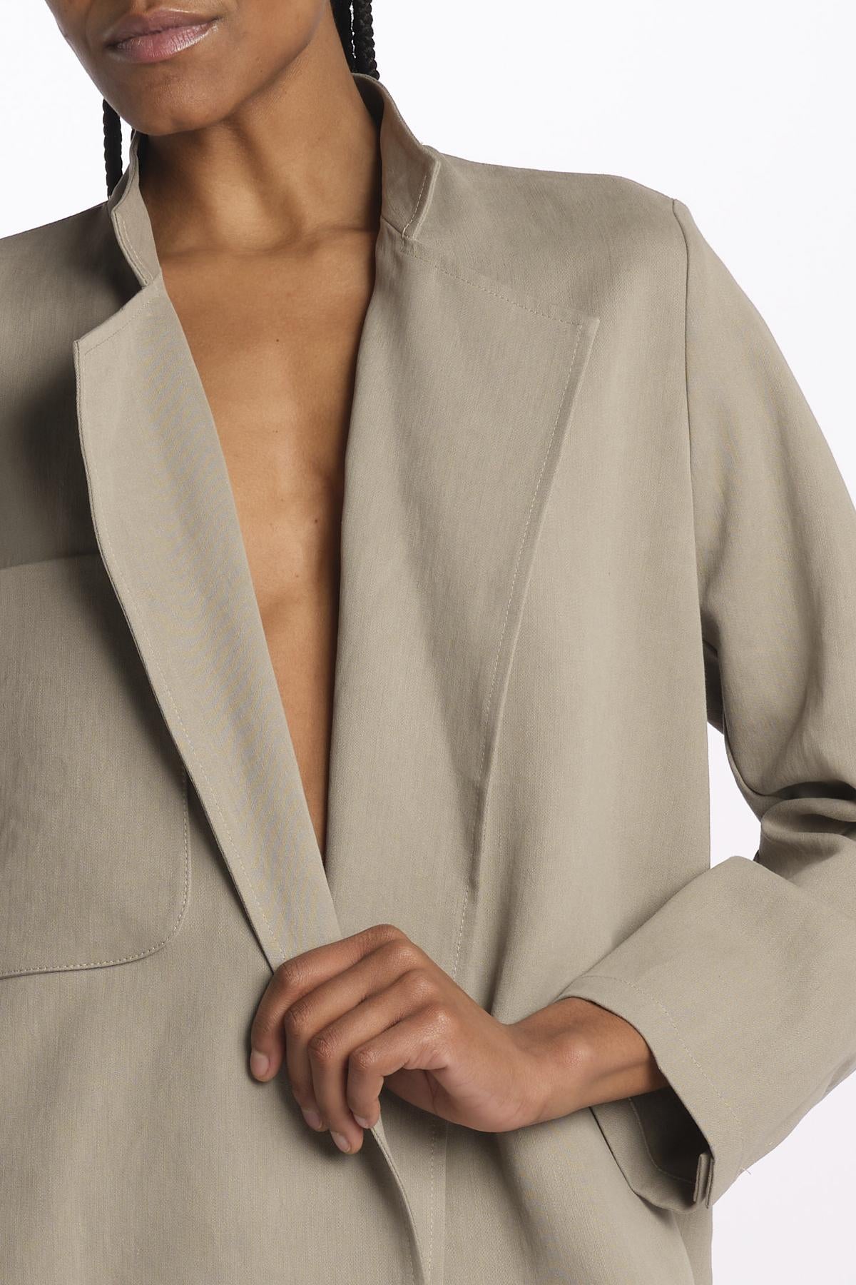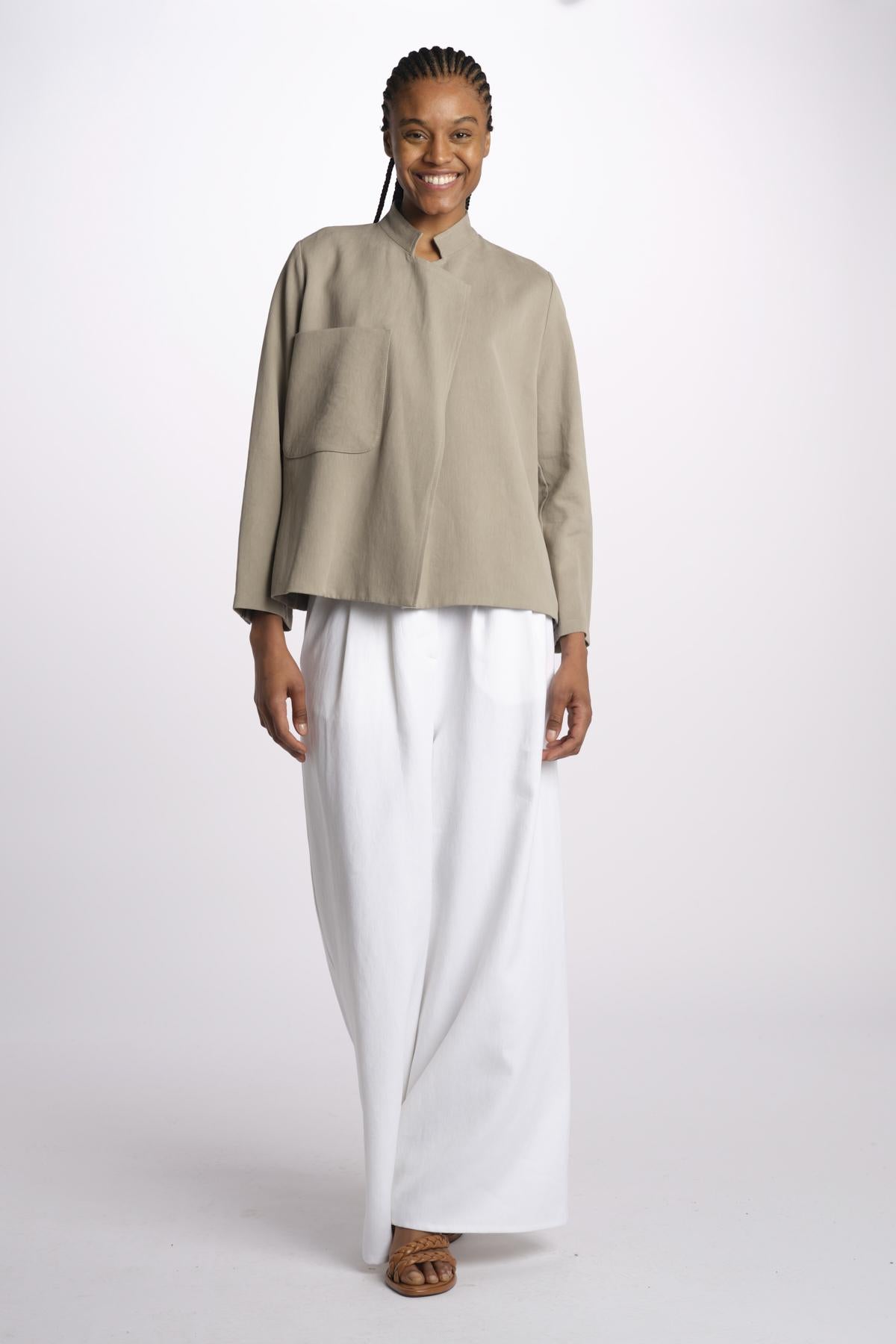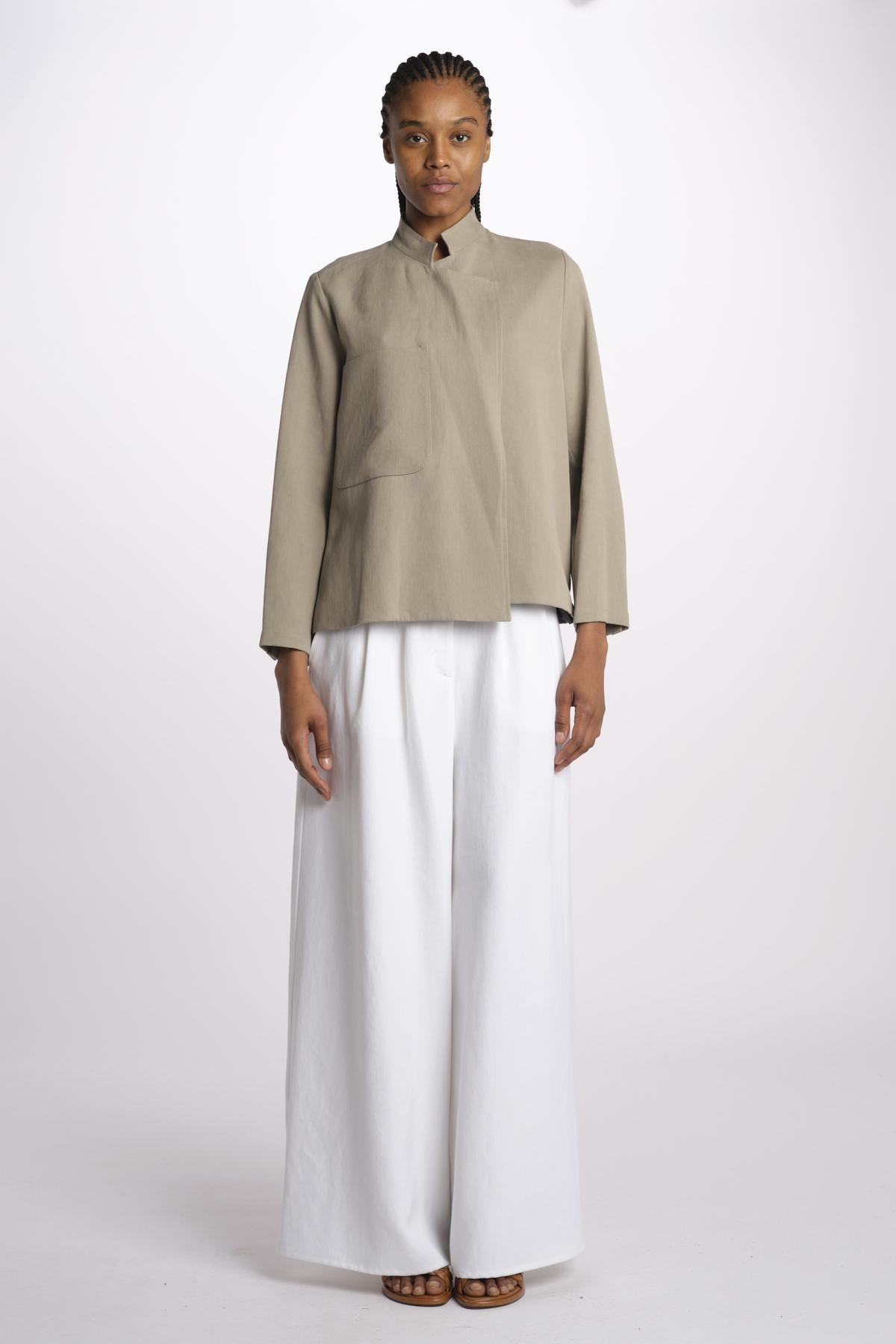 1340 giacca con tasca lino enzimato by dusan. La modella è alta 174 cm e indossa una taglia unica. Composizione: 100% lino.