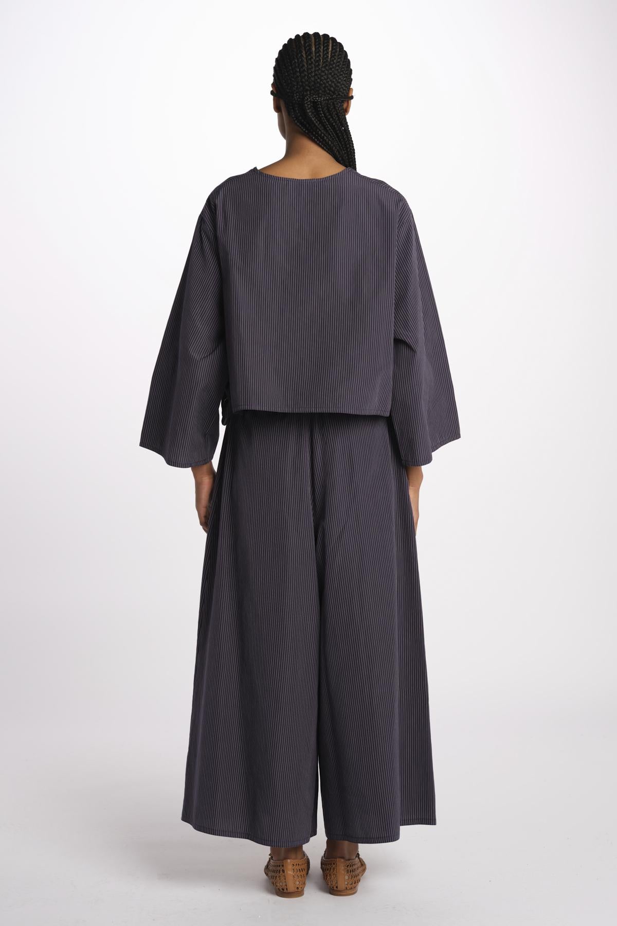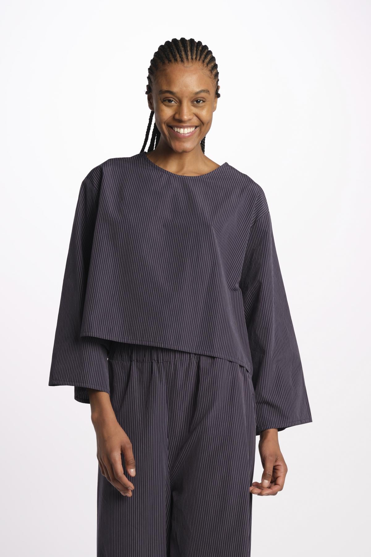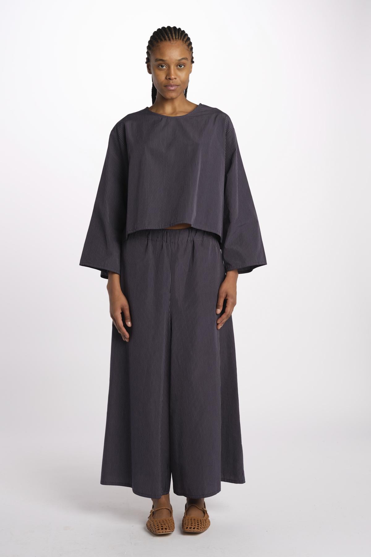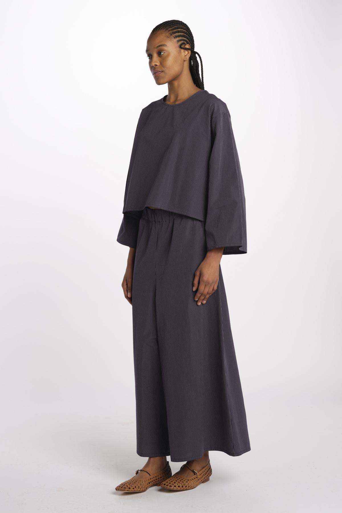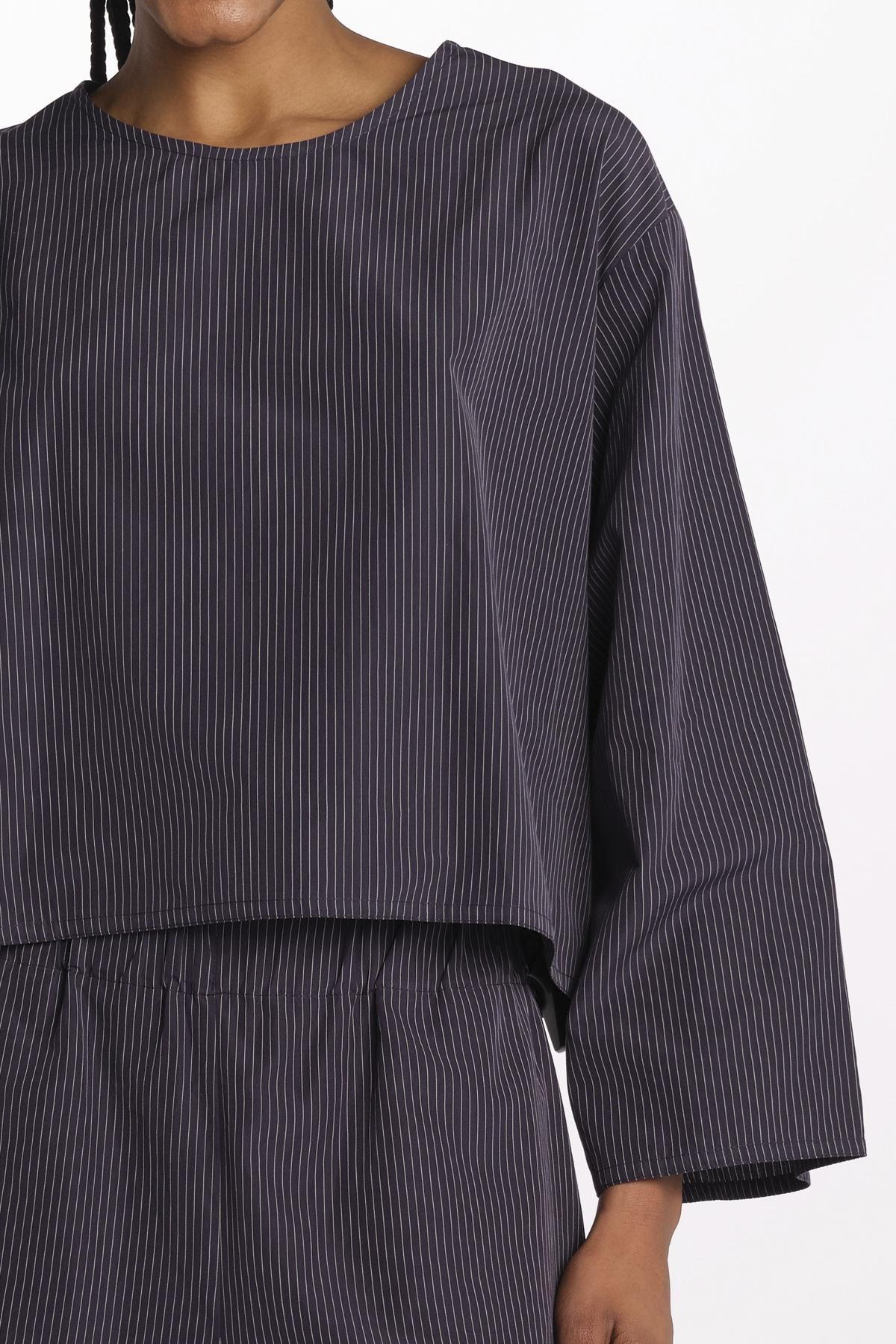 2062 camicia a righine by dusan. La modella è alta 174 cm e indossa una taglia unica. Composizione: 100% cotone.