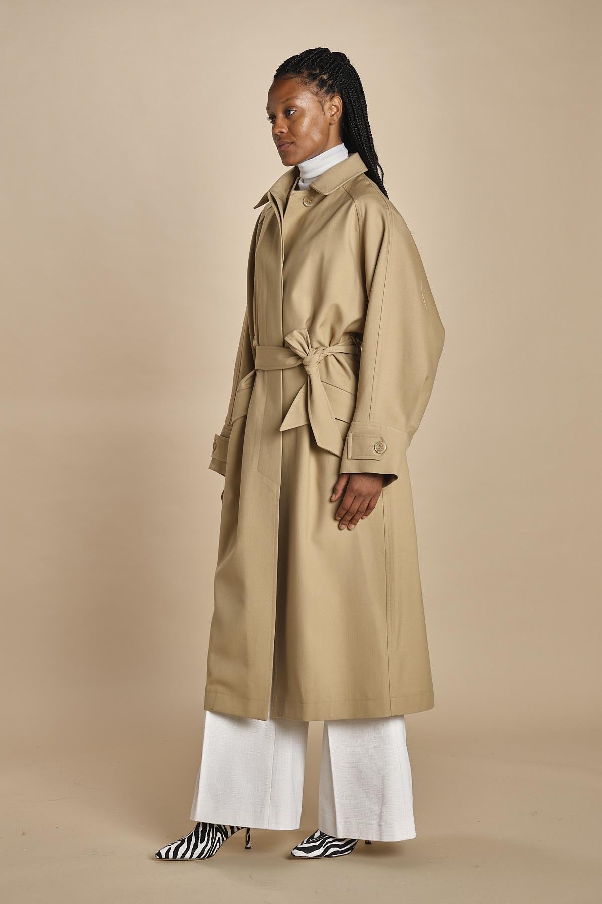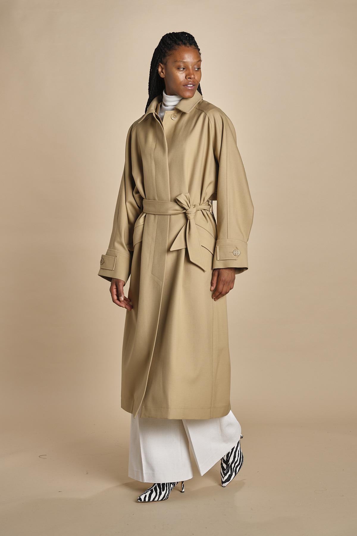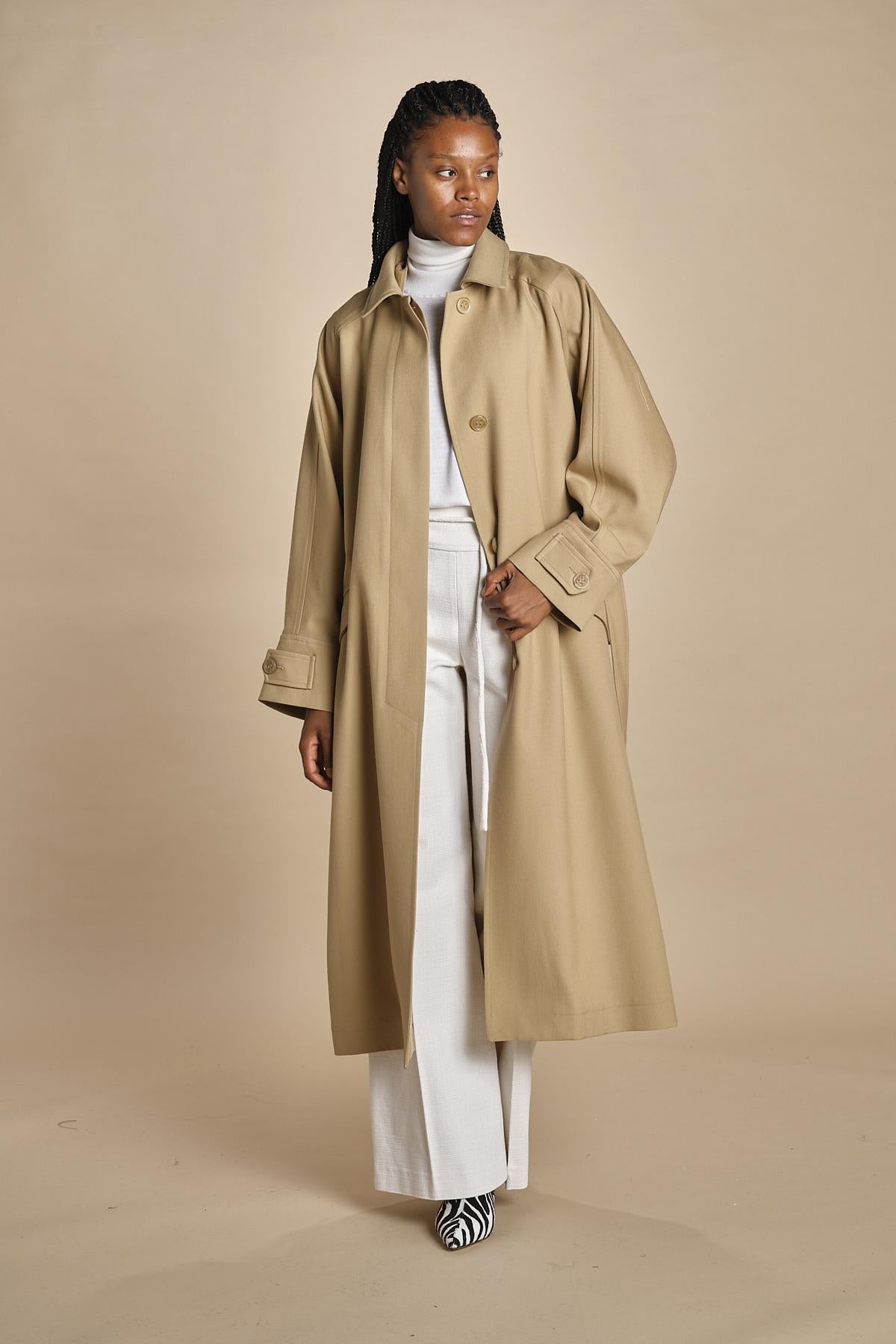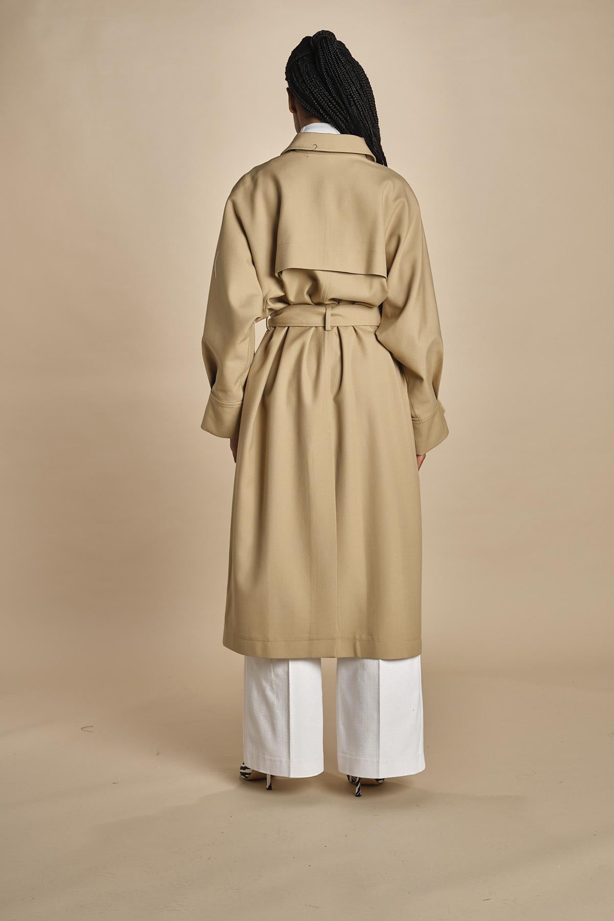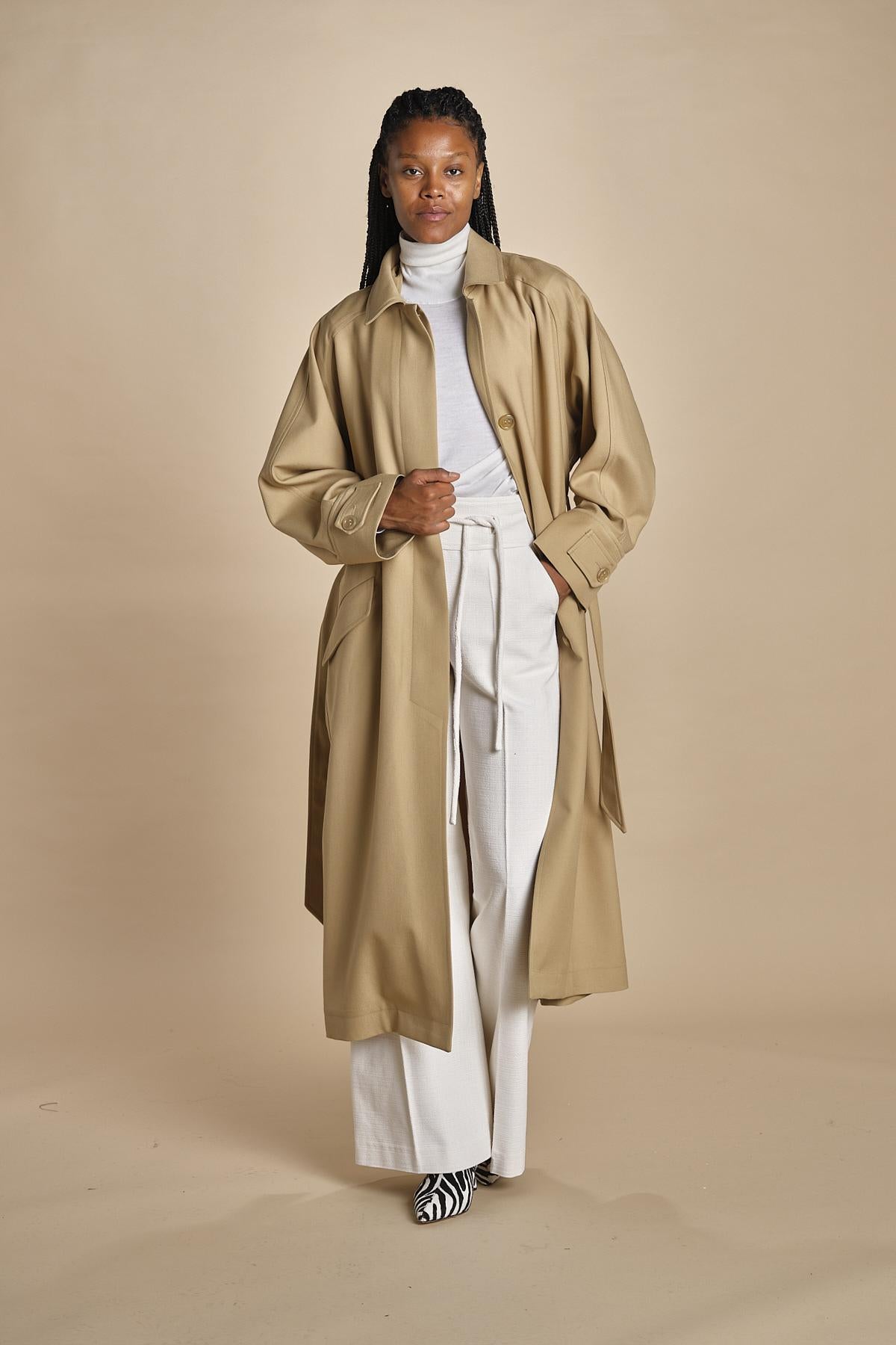 trench oversize con tasche. La modella è alta 174cm e indossa una taglia S.