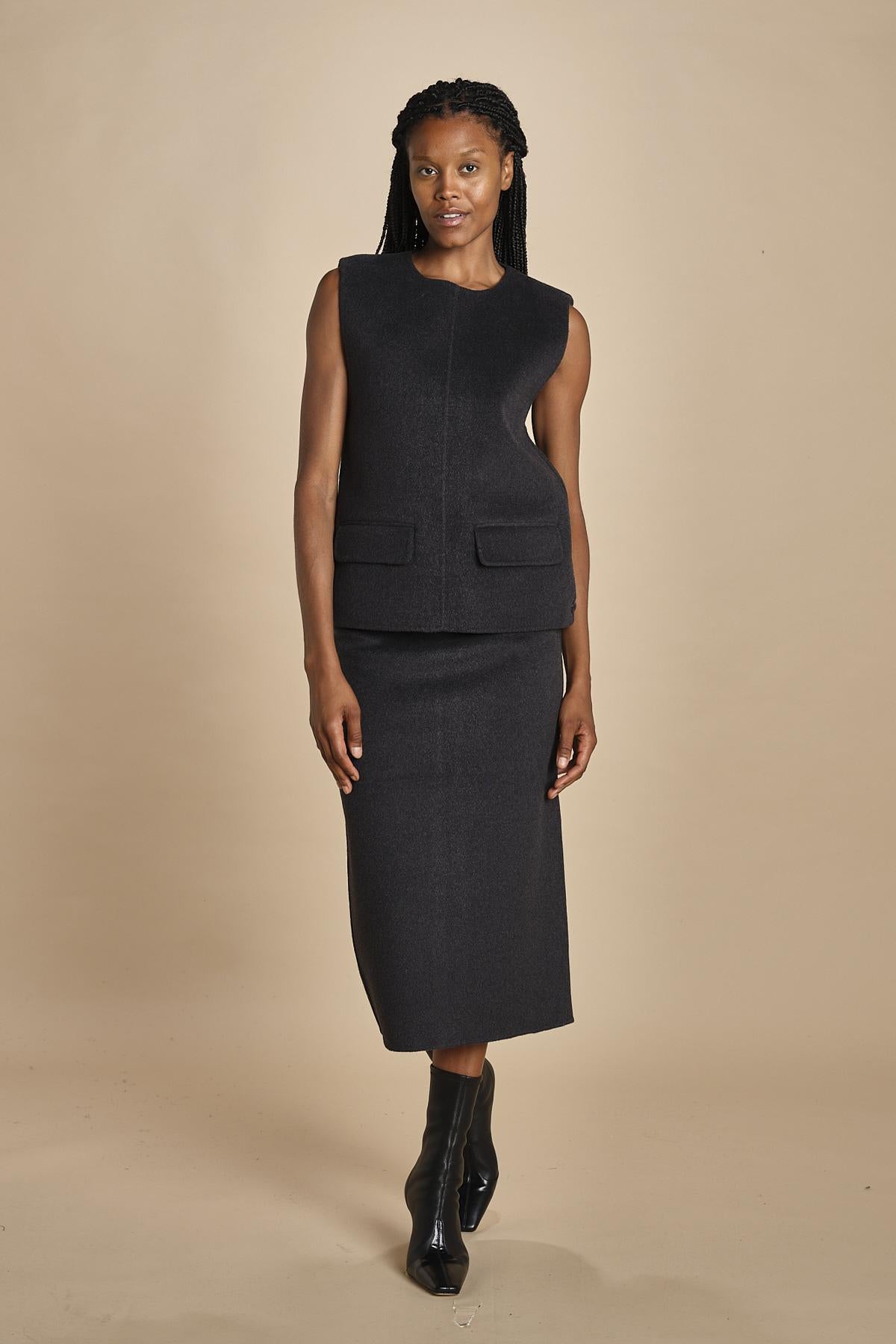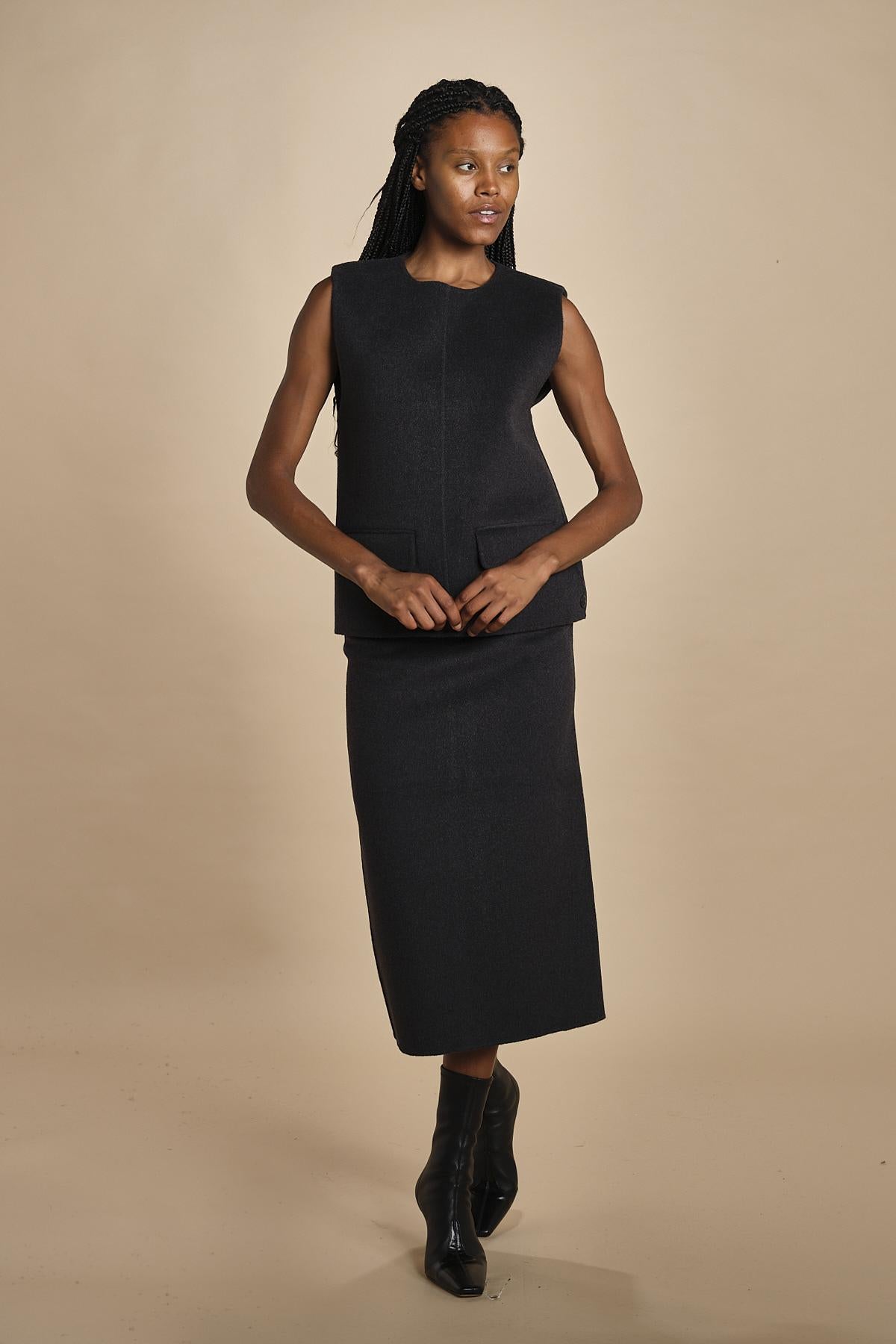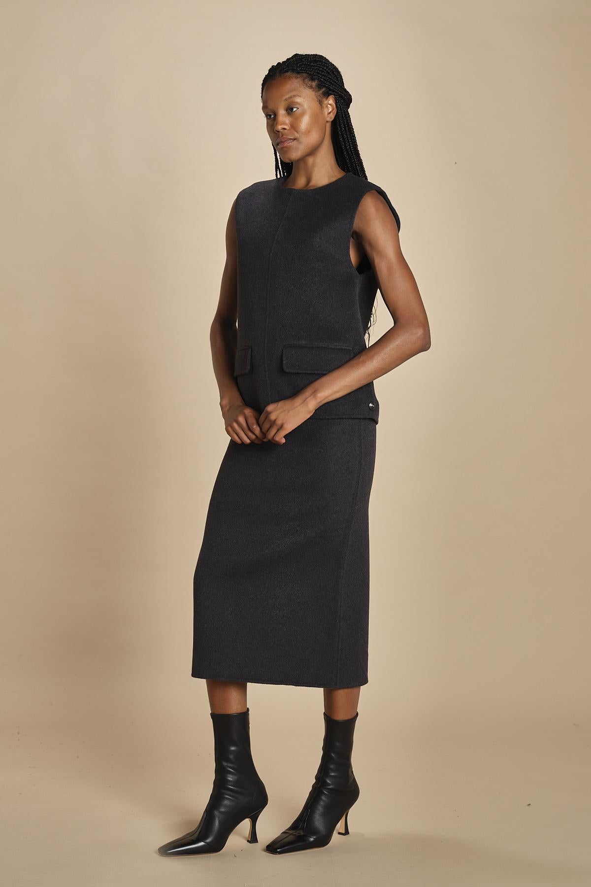 gilet double. La modella è alta 174 cm e indossa una taglia 34.