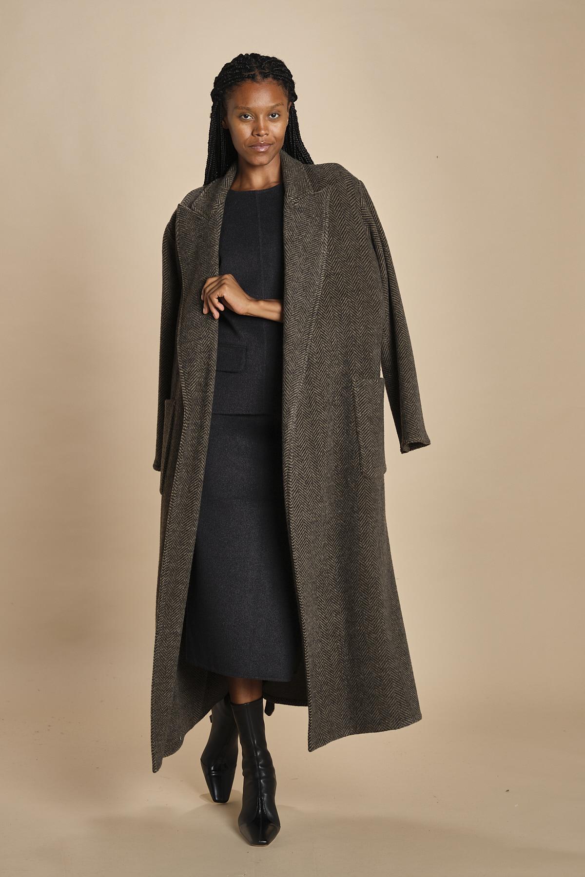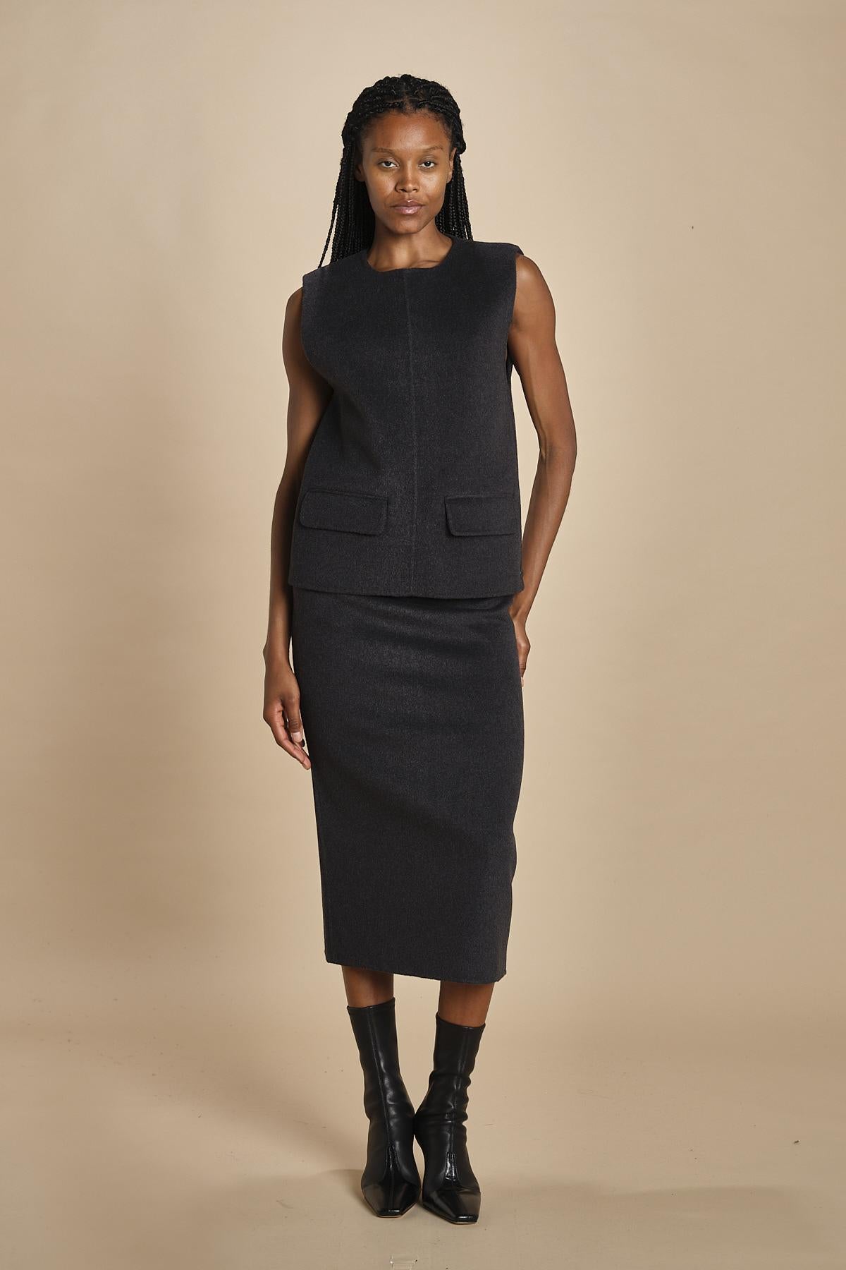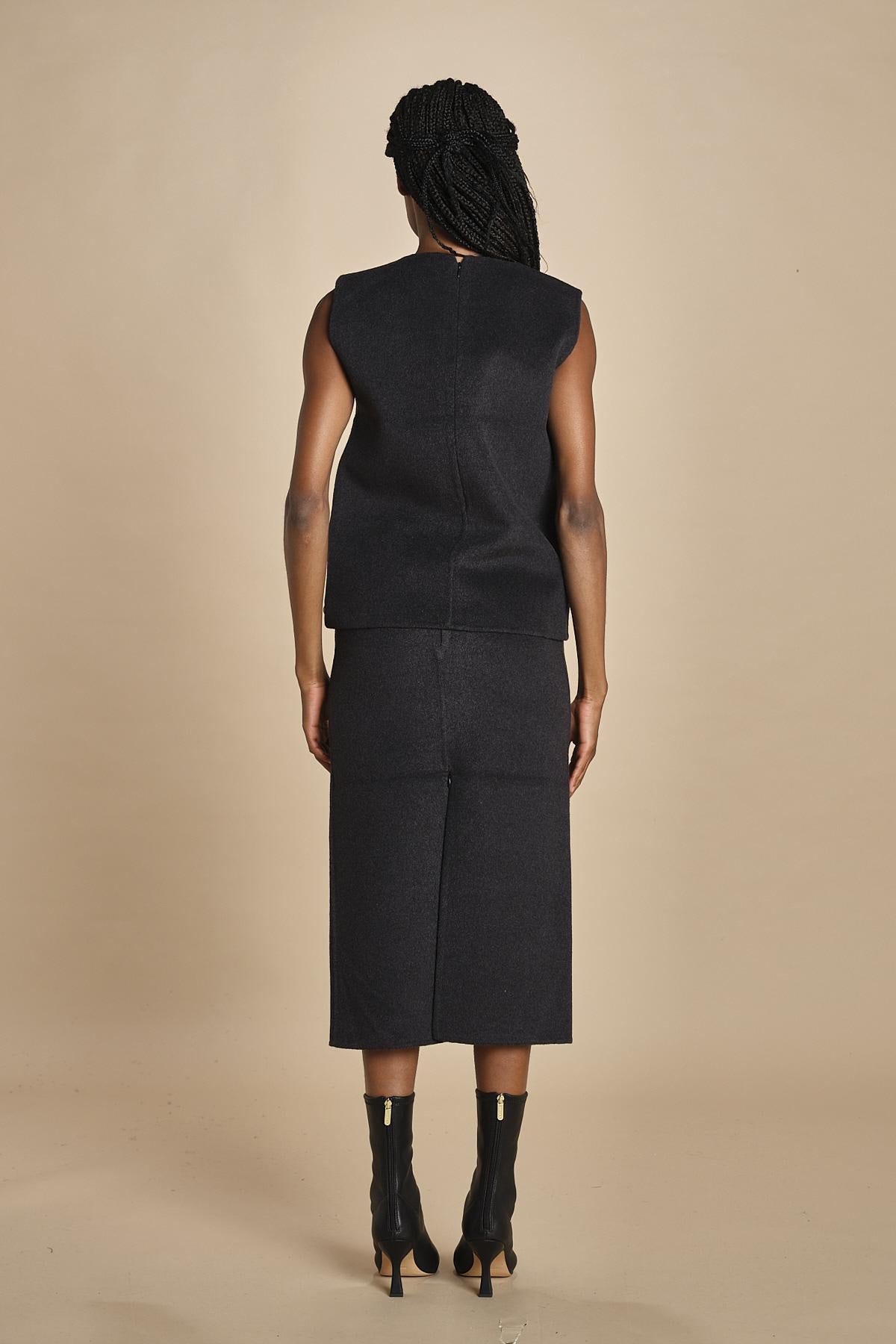 gilet double. La modella è alta 174 cm e indossa una taglia 34.
