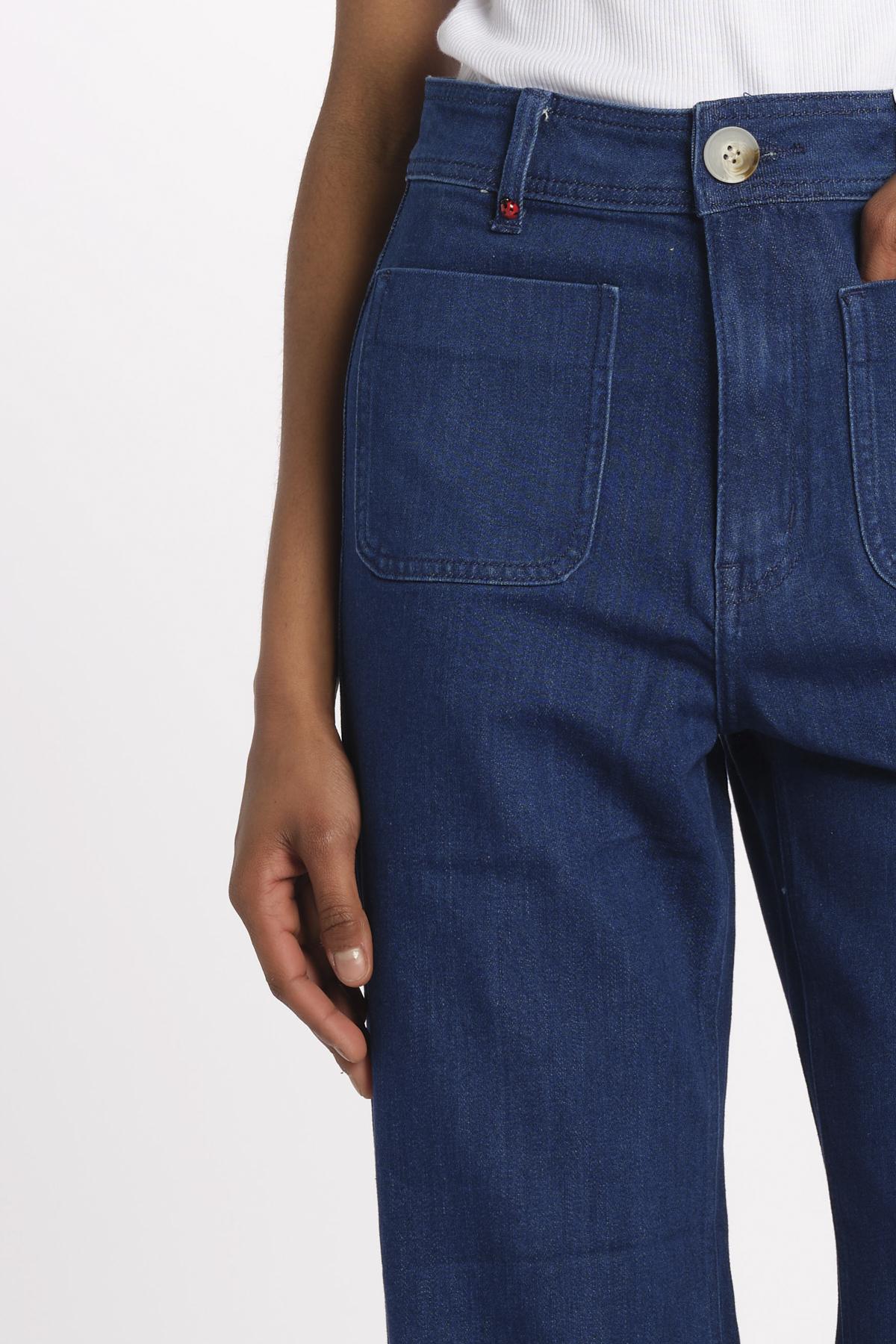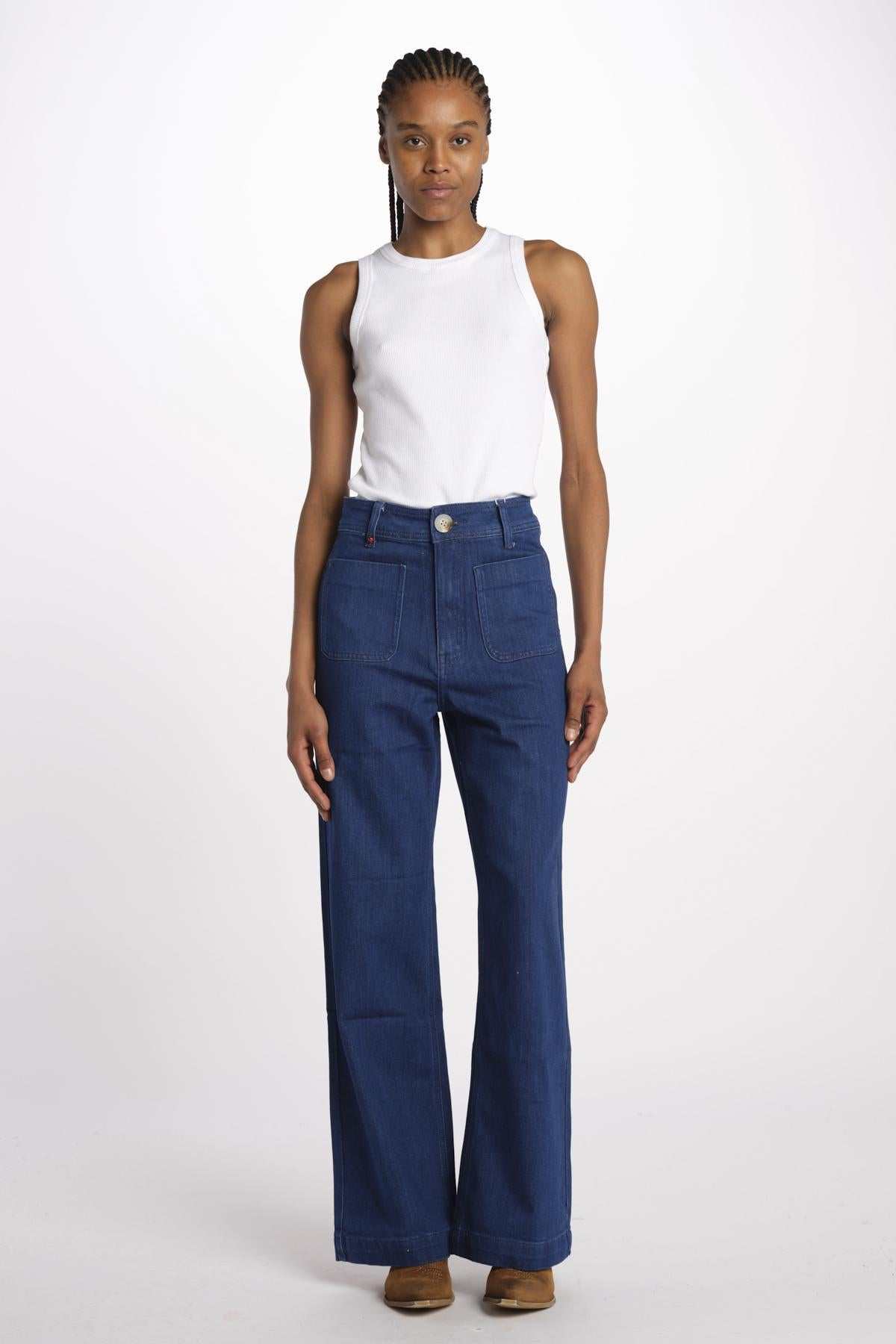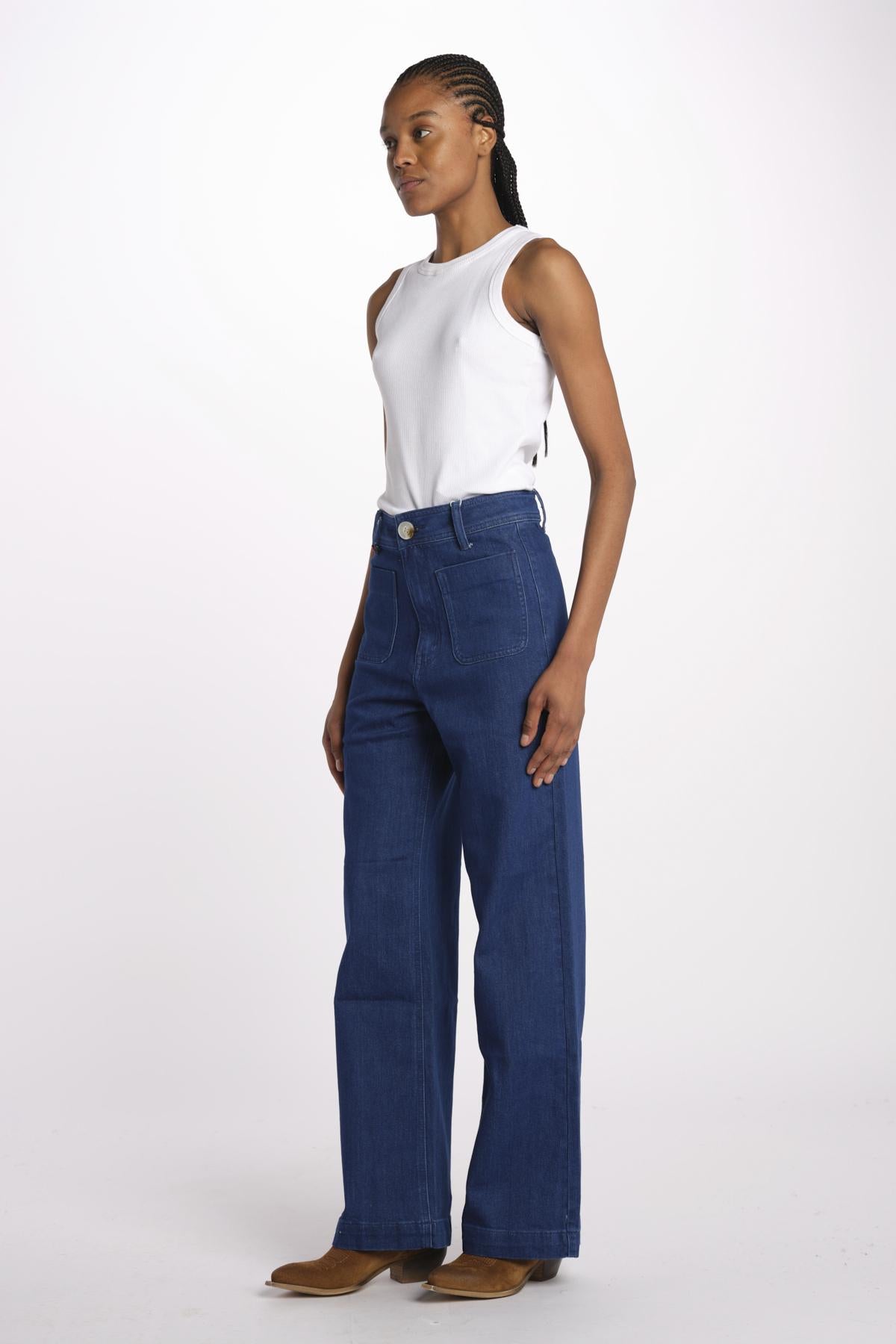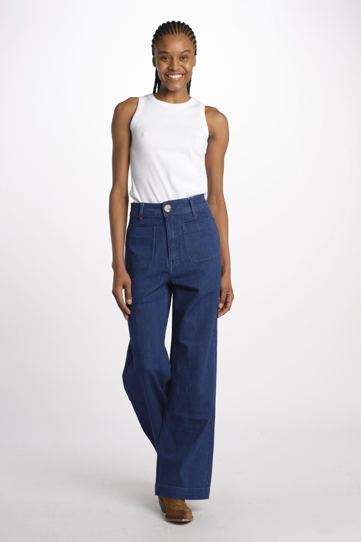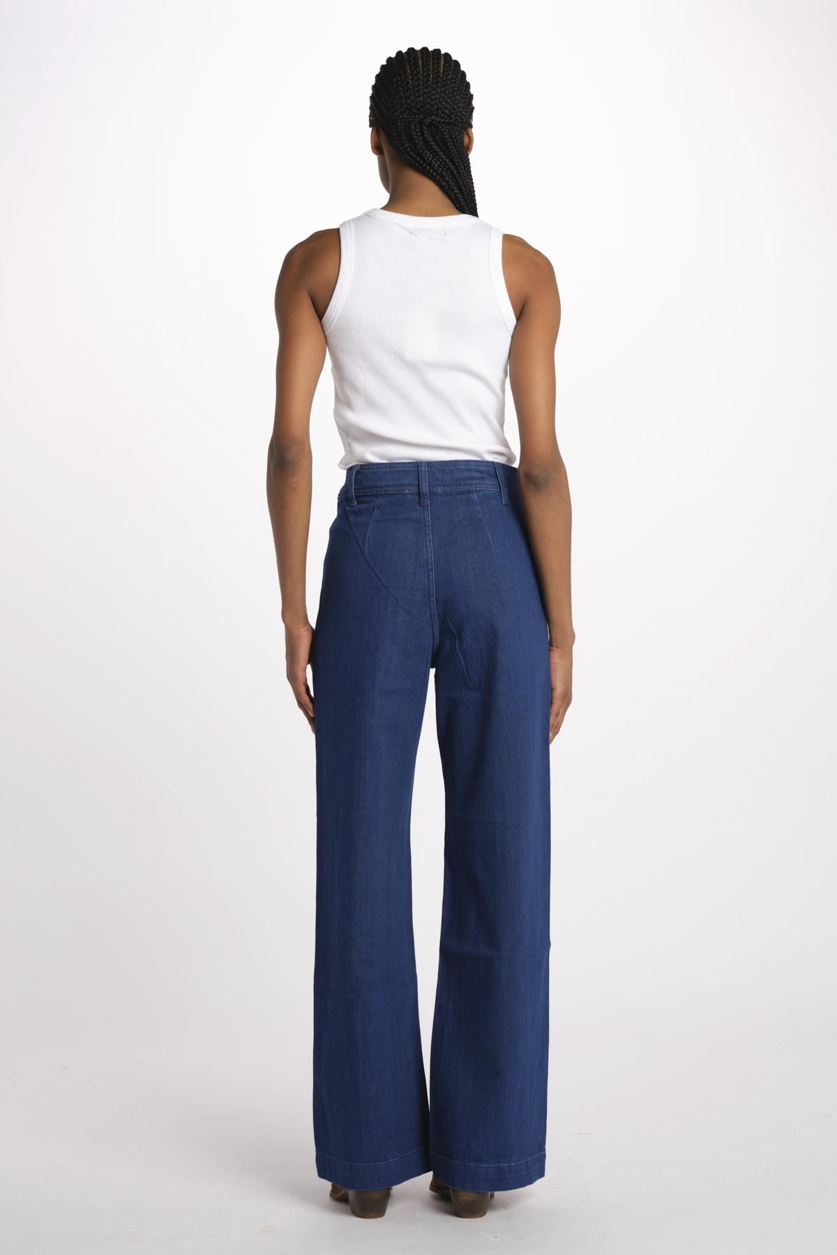 FAUVE denim fl 98 w by fam. La modella è alta 174 cm e indossa una taglia S. Composizione: 86% cotone, 13% poliestere, 2% elastane.