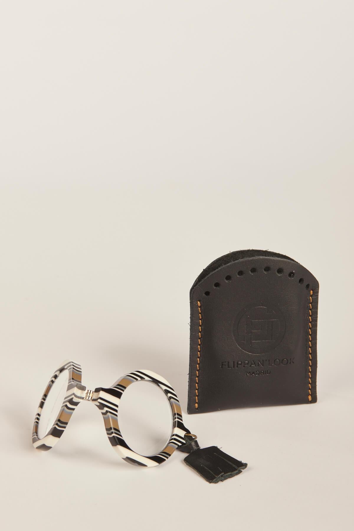Occhiali Rayas a righe di Flippan'look. Modello con pratico fodero in pelle con nappa e cordino neri. Le lenti sono graduate a potenza +2,00.