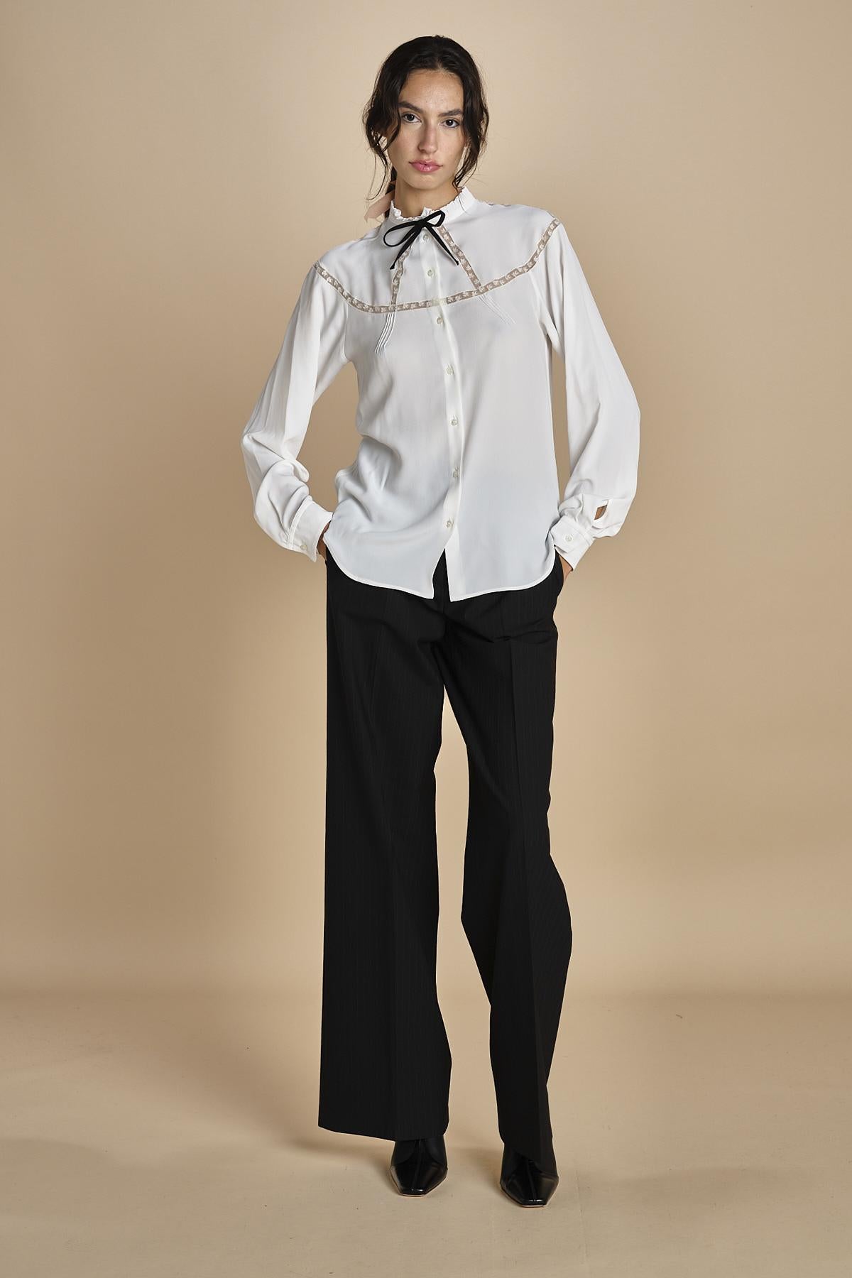 camicia con inserti in pizzo. La modella è alta 180 cm e indossa una taglia 38. 31% SETA 69% ACETATO