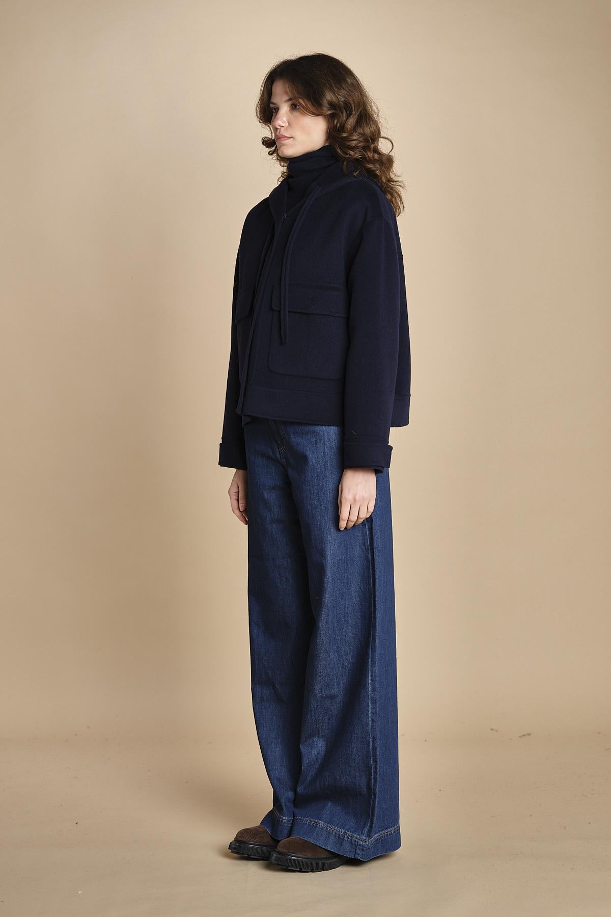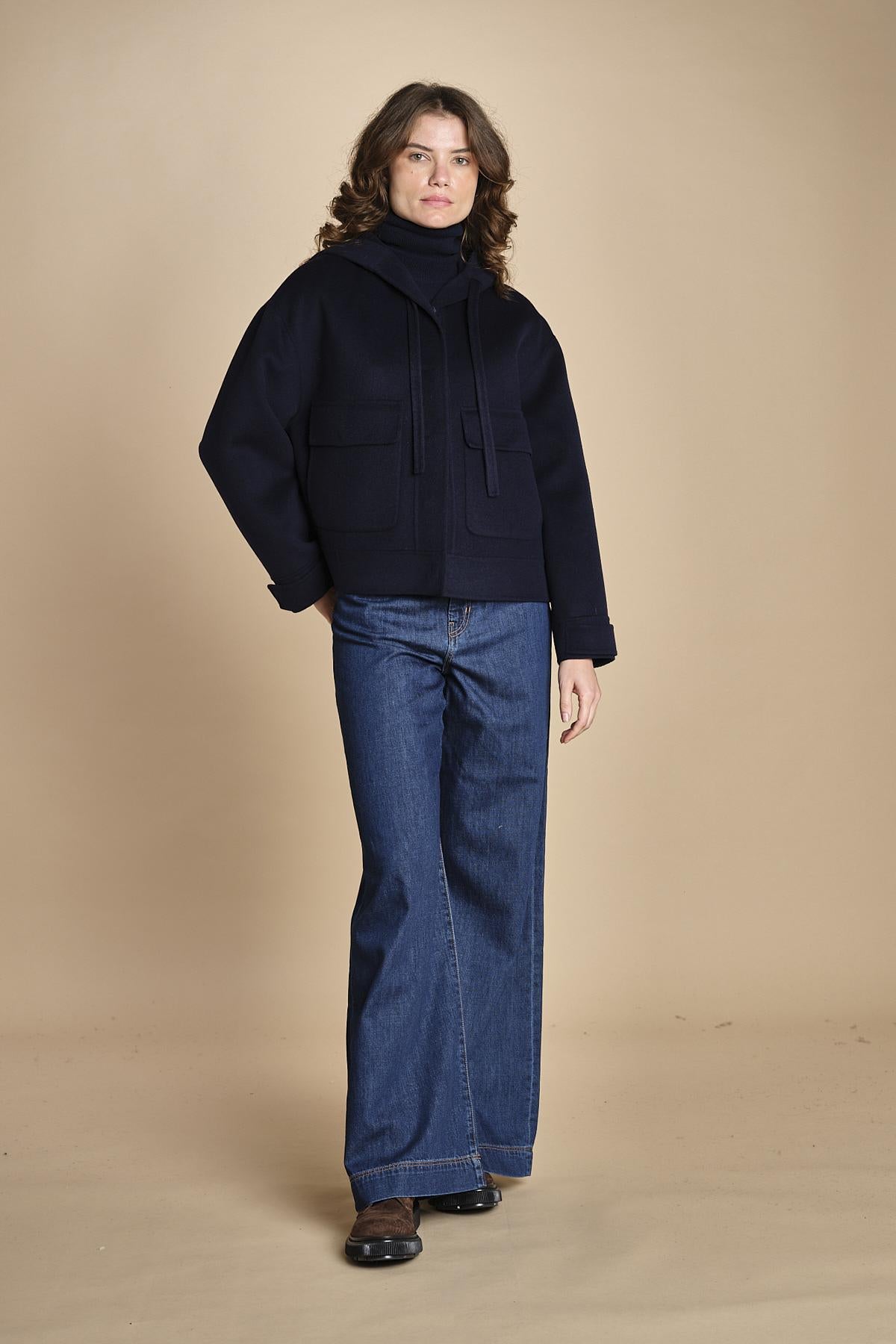 giaccone con cappuccio double. La modella è alta 176 cm e indossa una taglia 40. 90% lana 10% poliammide