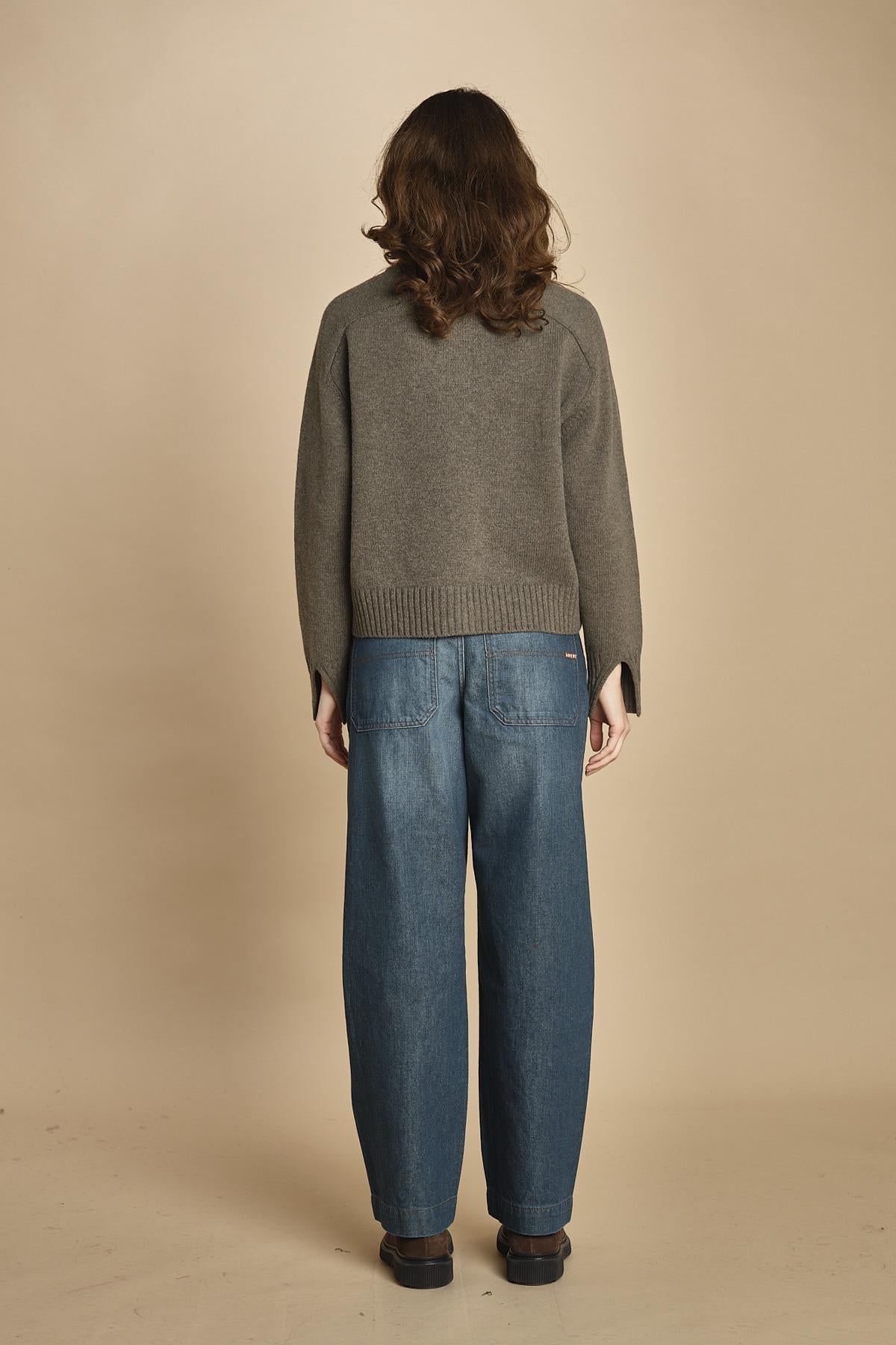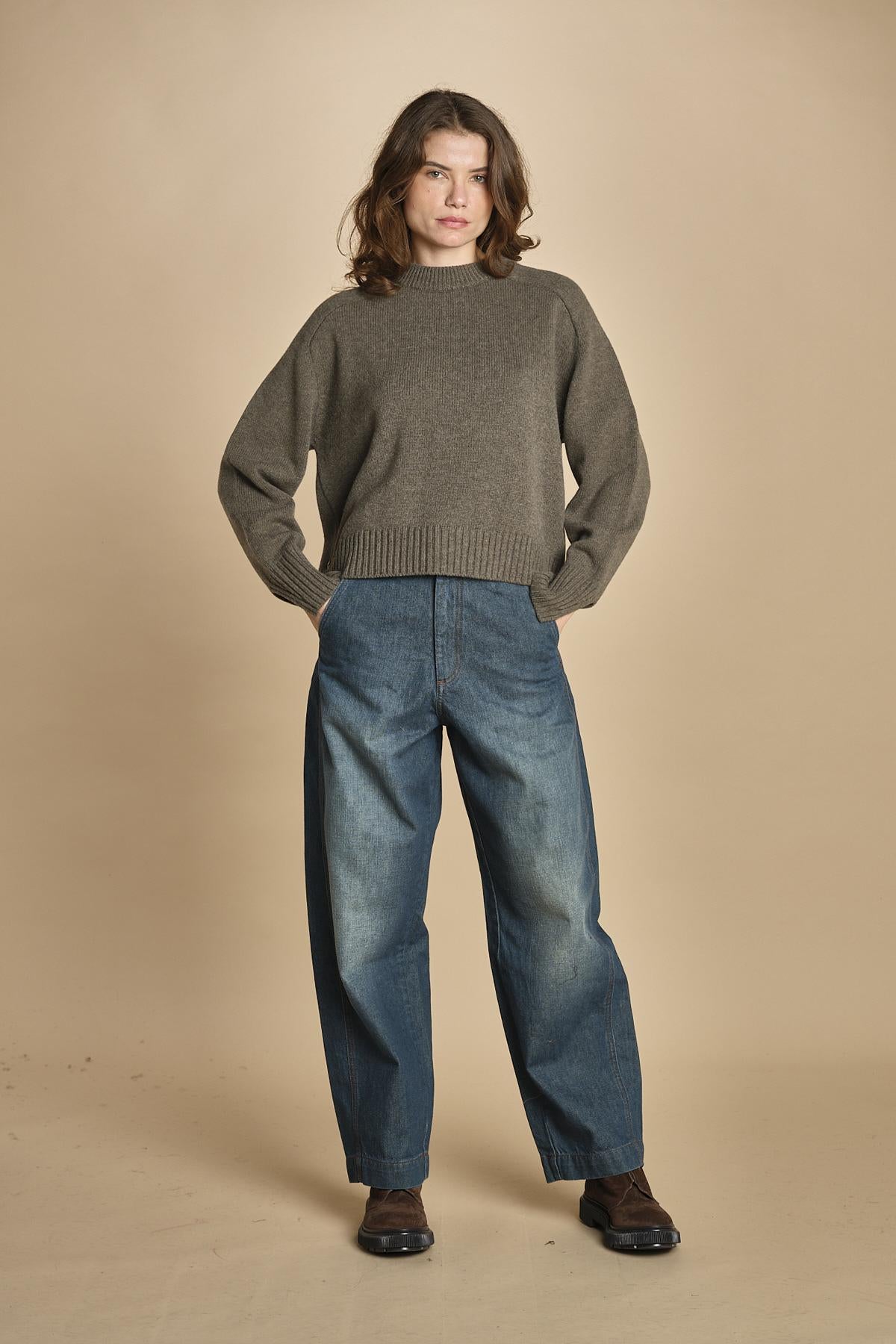 girocollo over. La modella è alta 174 cm e indossa una taglia 34. 100% lana