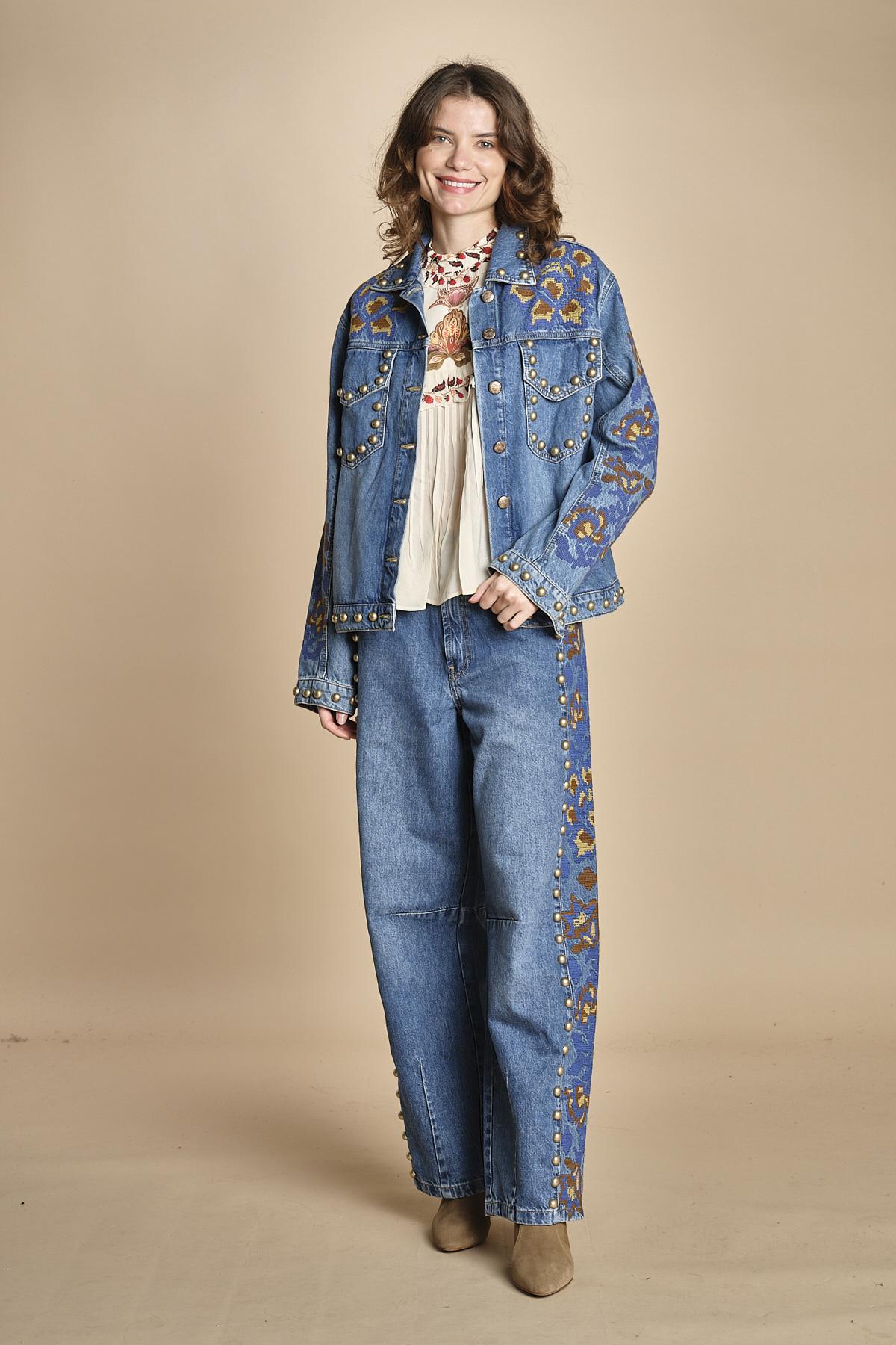 giubbino in denim con borchie. La modella è alta 176 cm e indossa una taglia S. 100% cotone