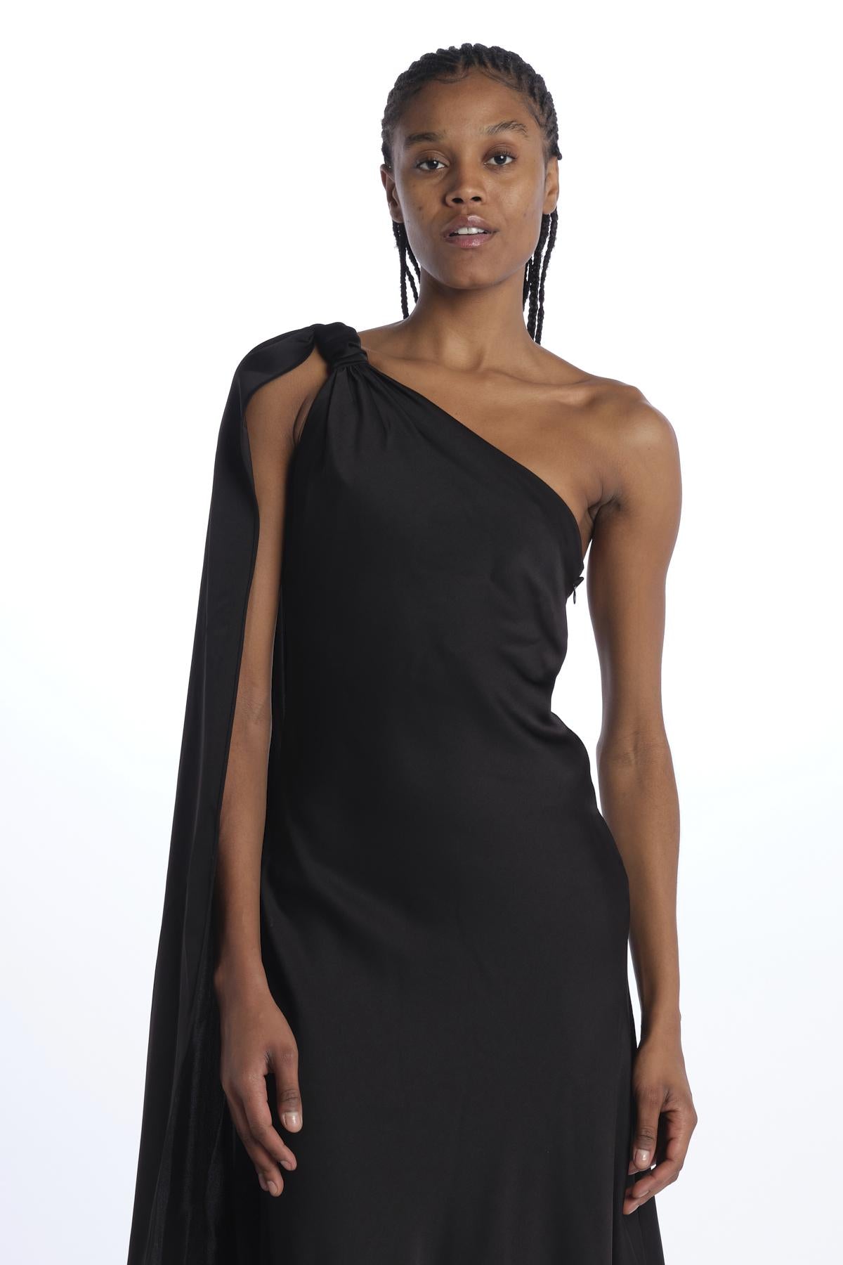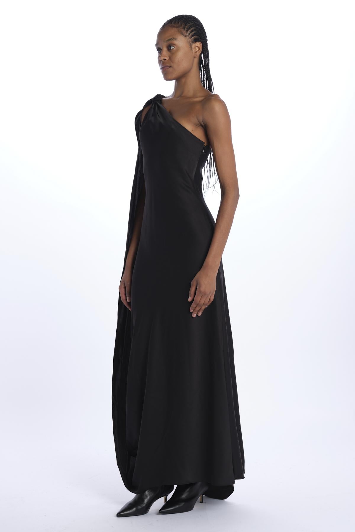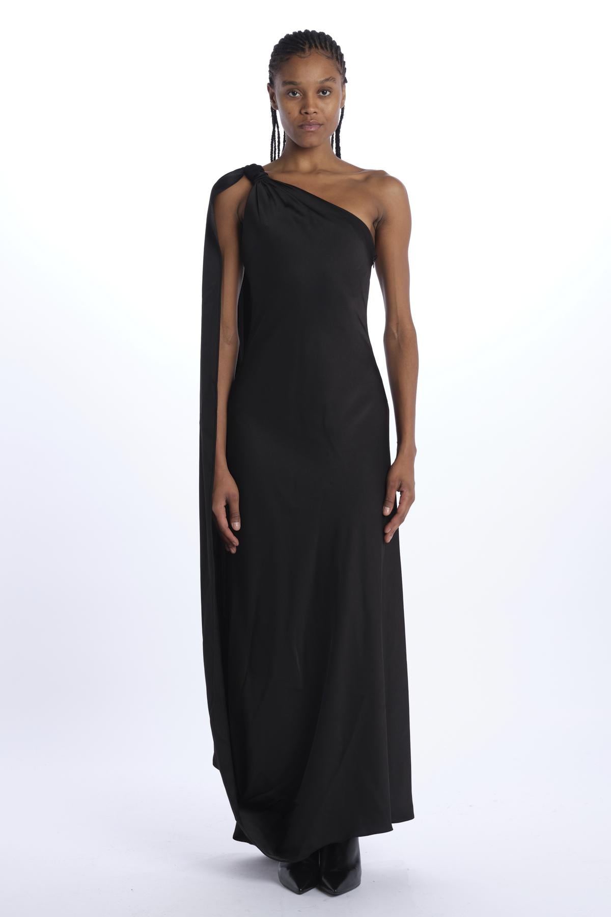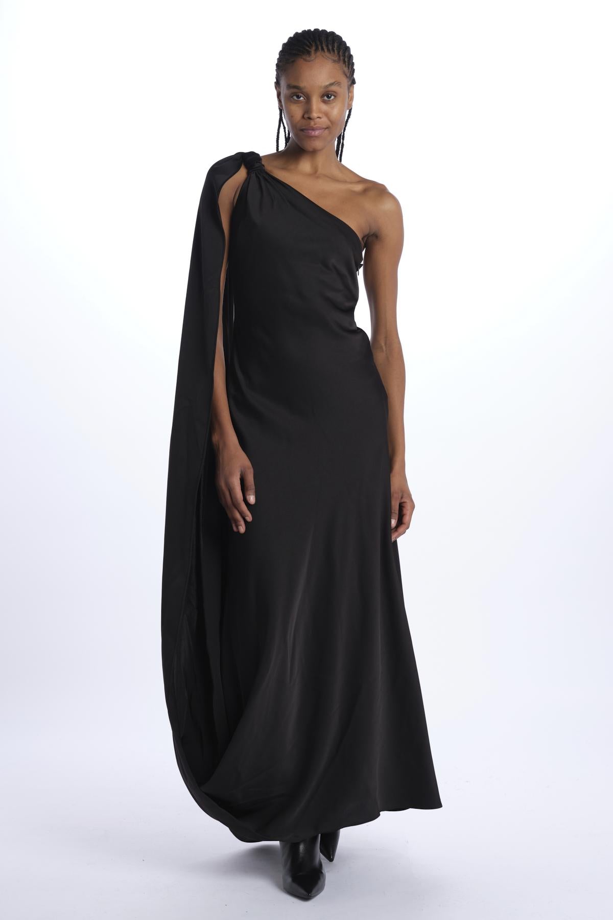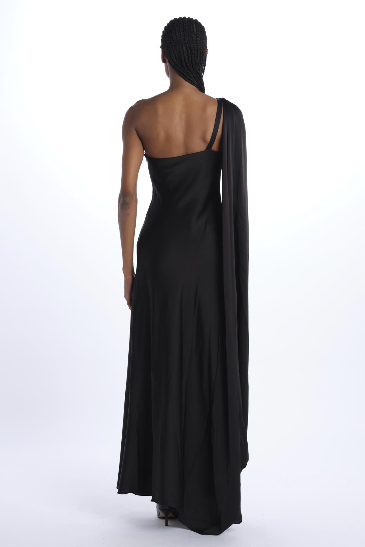 Abito AGU lungo monospalla satin by halston. La modella è alta 174 cm e indossa una taglia 1. Composizione: 100% poliestere.