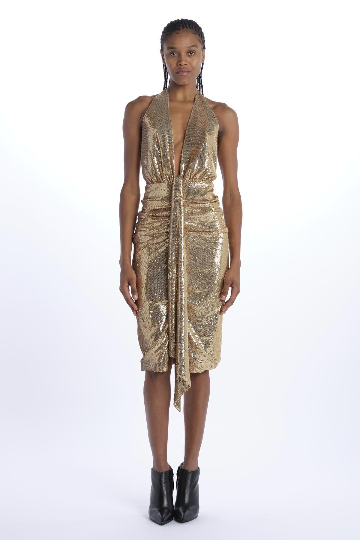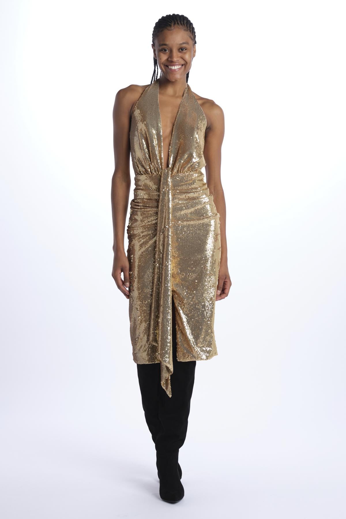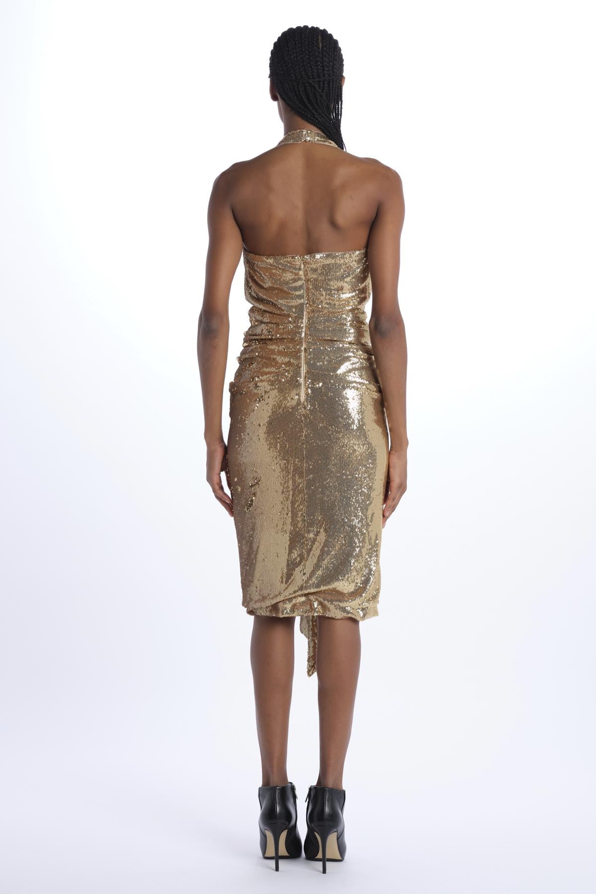 Abito SYA nudo pailettes by halston. La modella è alta 174 cm e indossa una taglia 1. Composizione: 100% nylon.