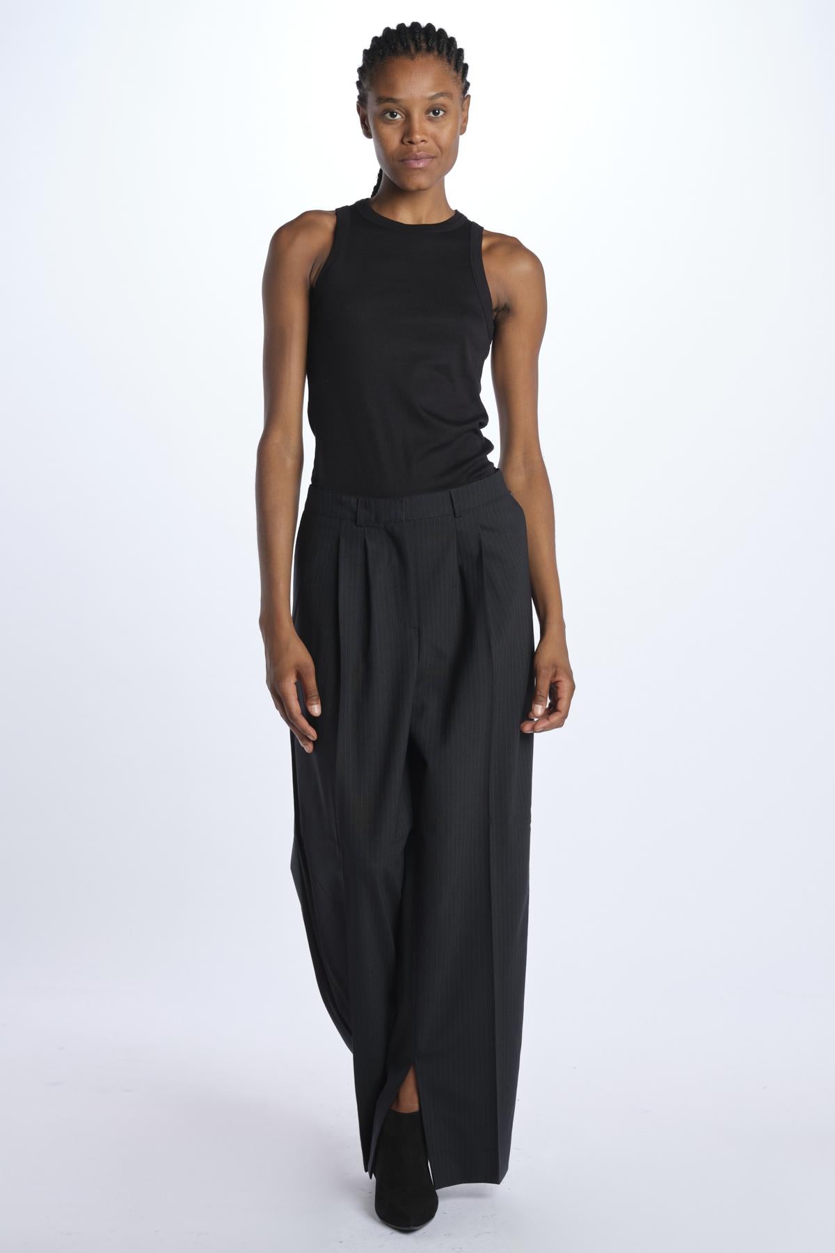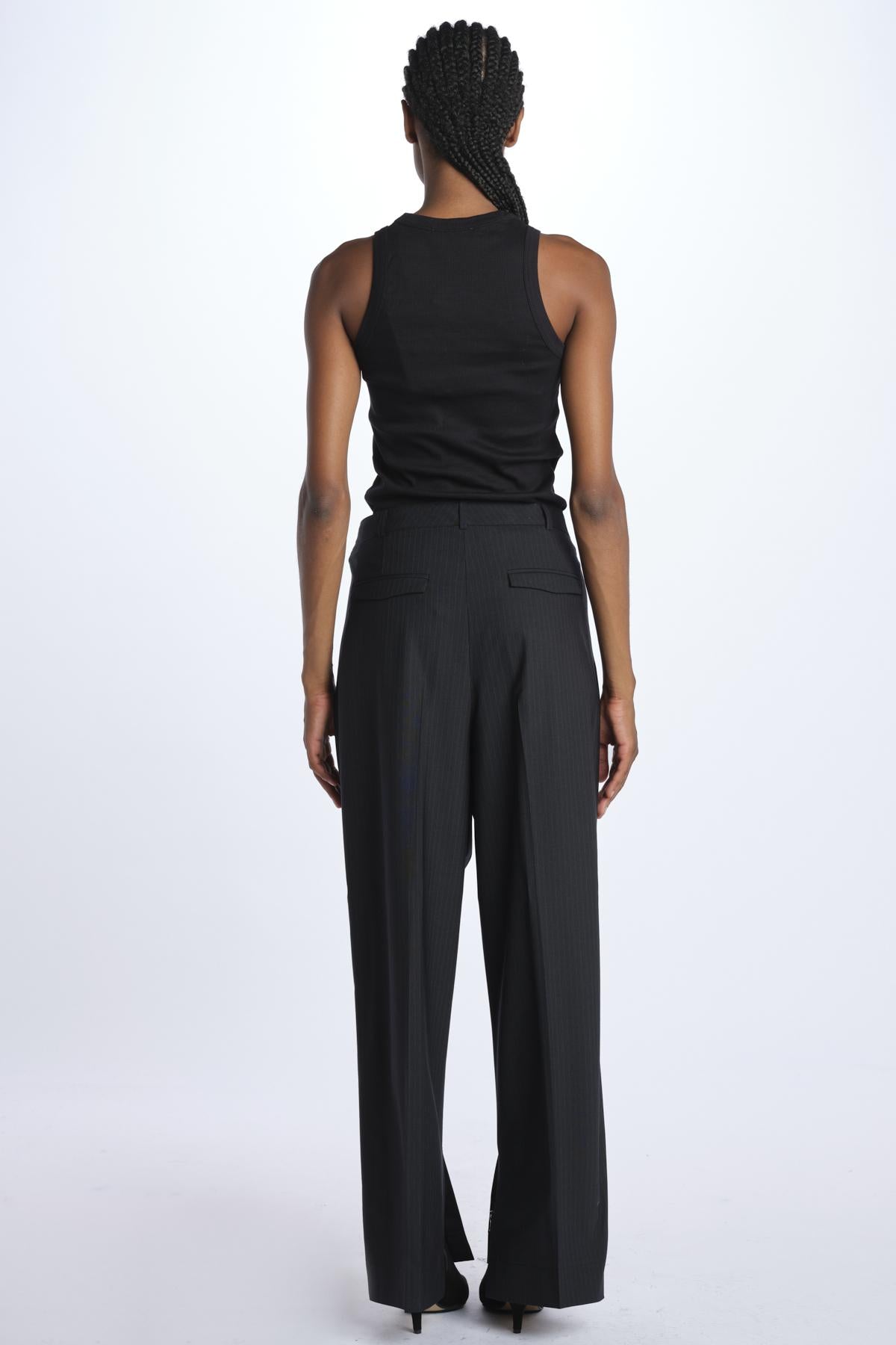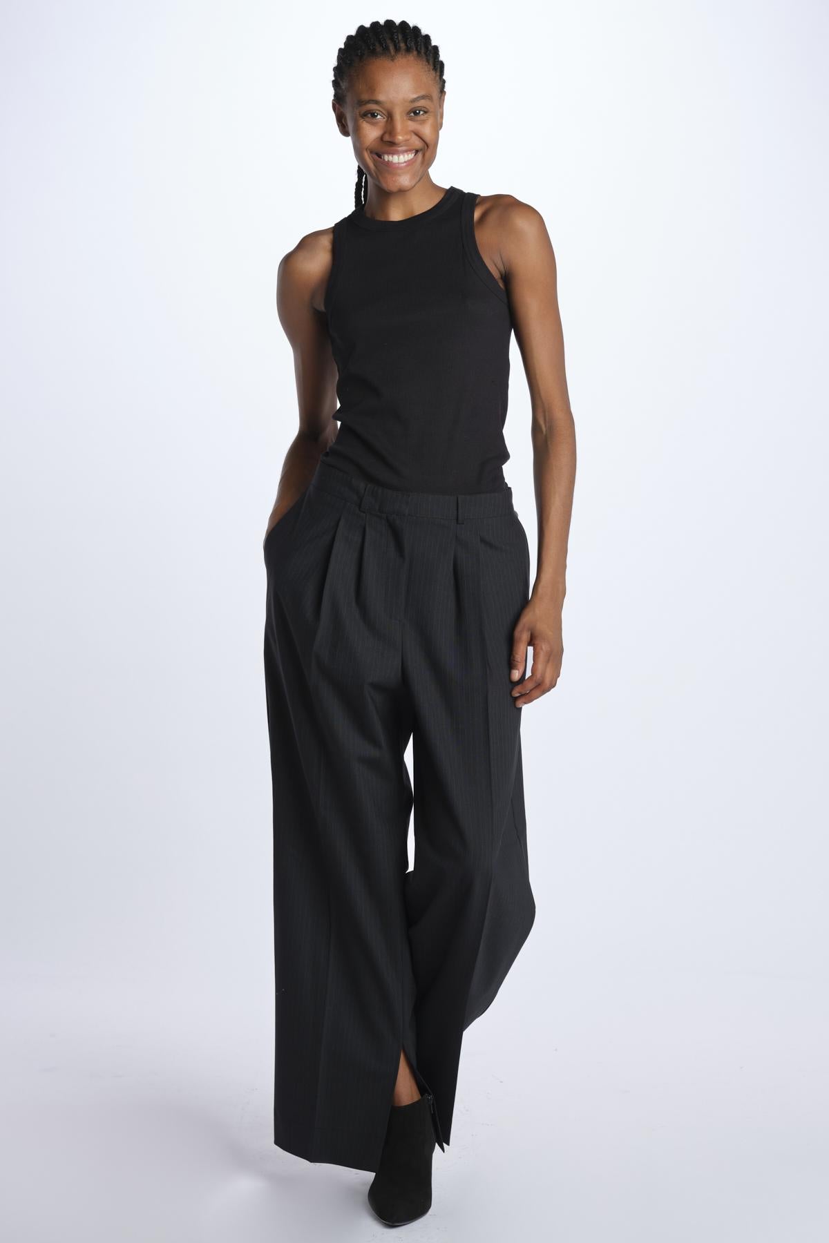 Pantalone RUPERT by Herskind gessato. La modella è alta 174 cm e indossa una 38. Composizione: 53% poliestere, 43% lana vergine, 4% elastan.