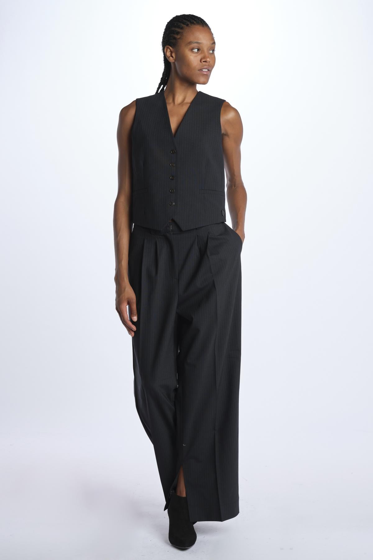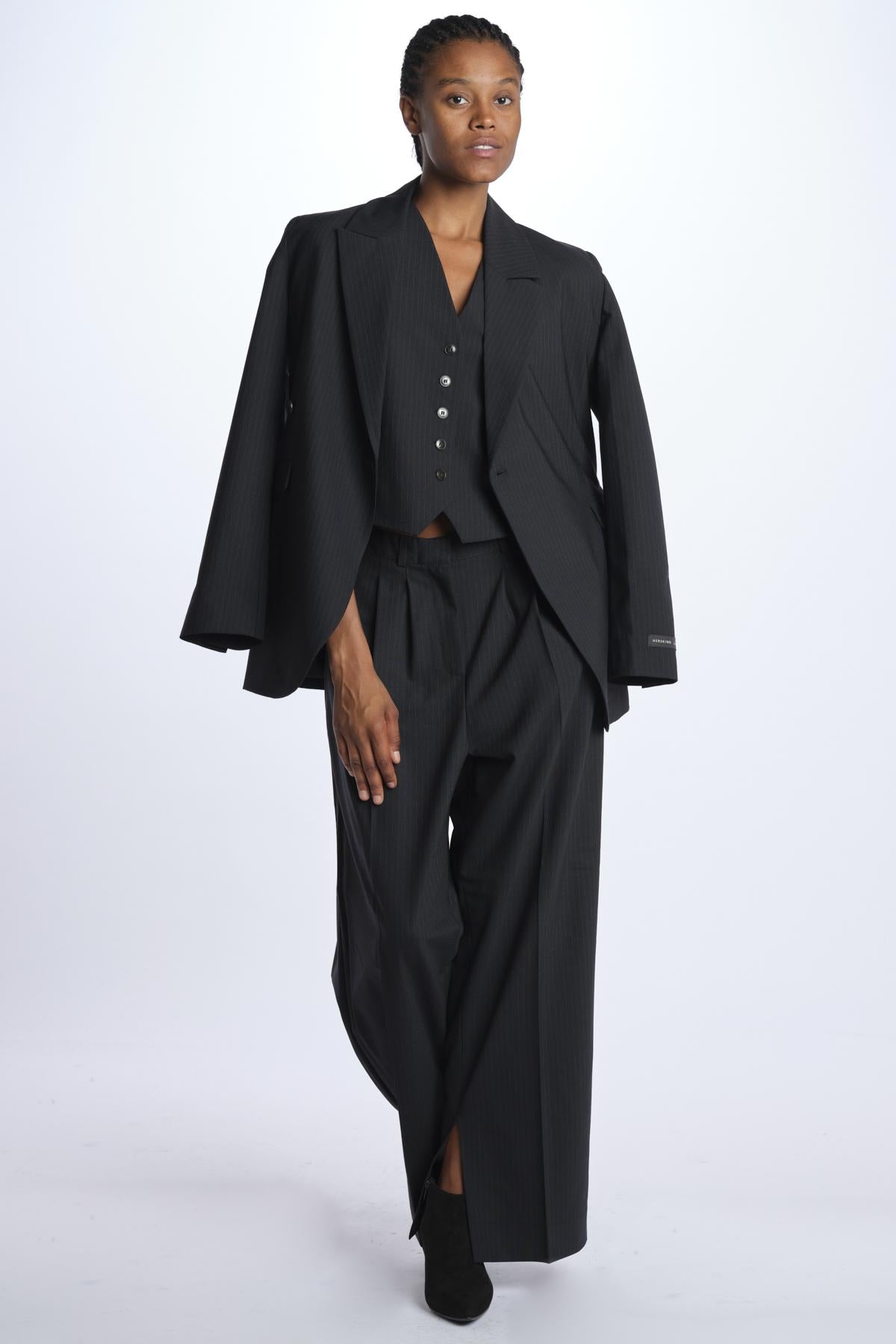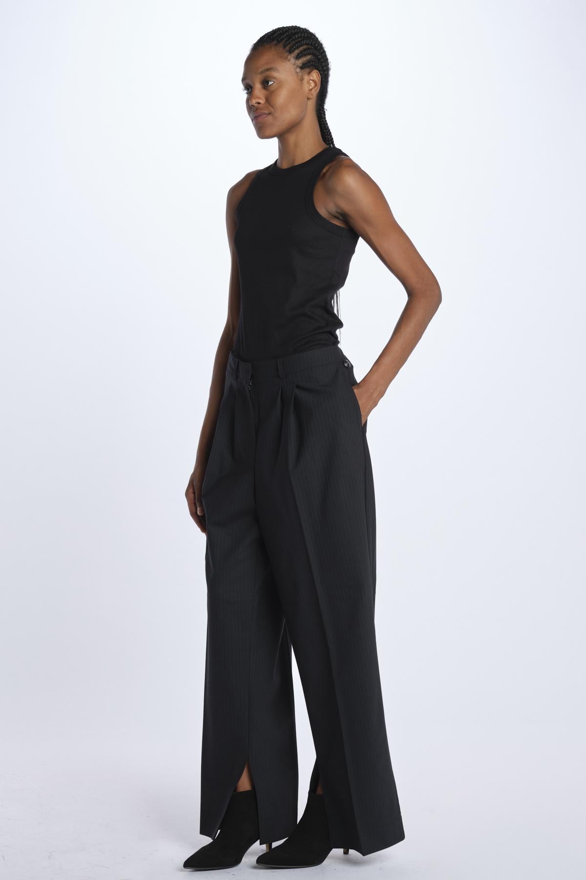 Pantalone RUPERT by Herskind gessato. La modella è alta 174 cm e indossa una 38. Composizione: 53% poliestere, 43% lana vergine, 4% elastan.