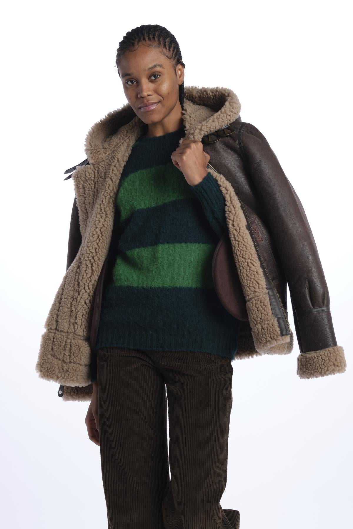 Maglia over sbott. Righe by howlin'. La modella è alta 174 cm e indossa una S. Composizione: 100% local Scottish wool