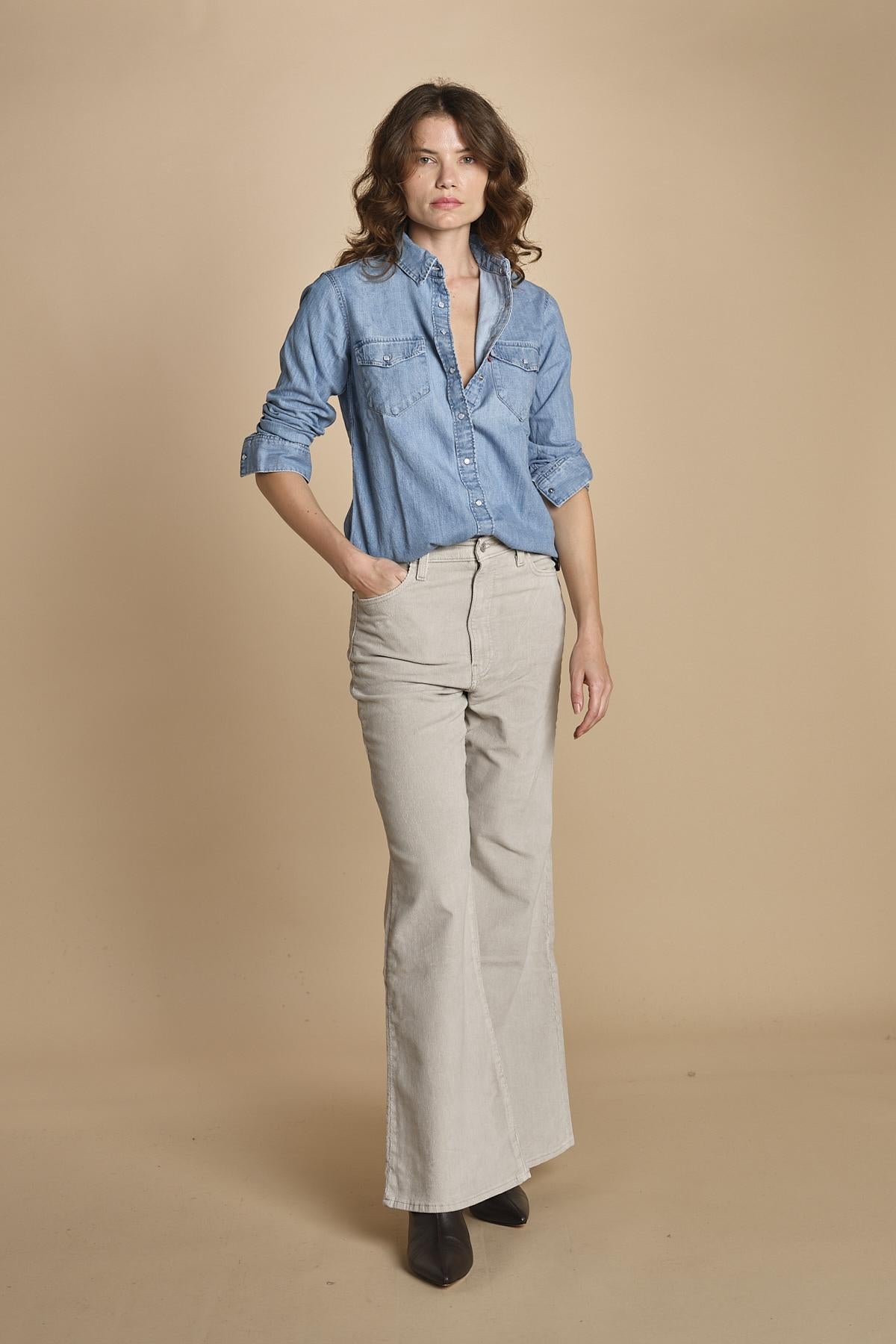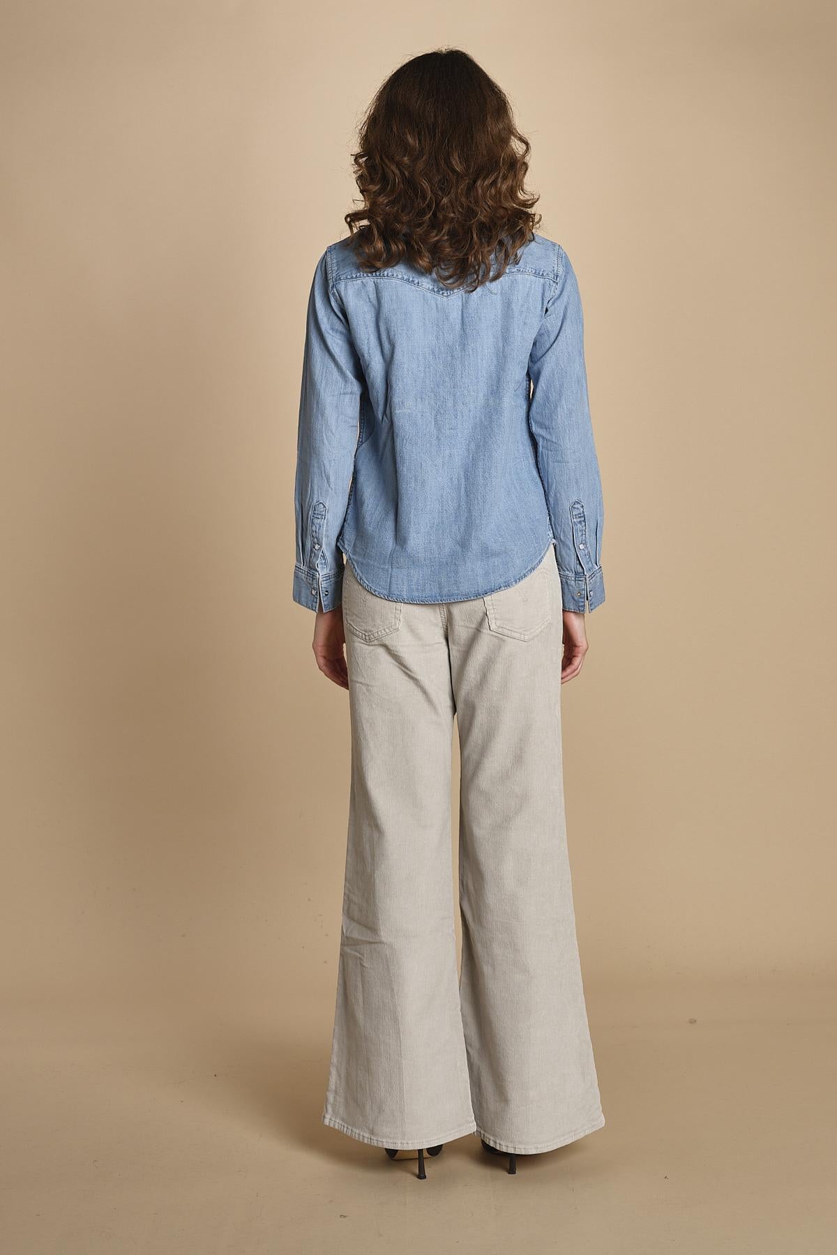 camicia in denim. La modella è alta 176 cm e indossa una taglia S. 100% COTONE