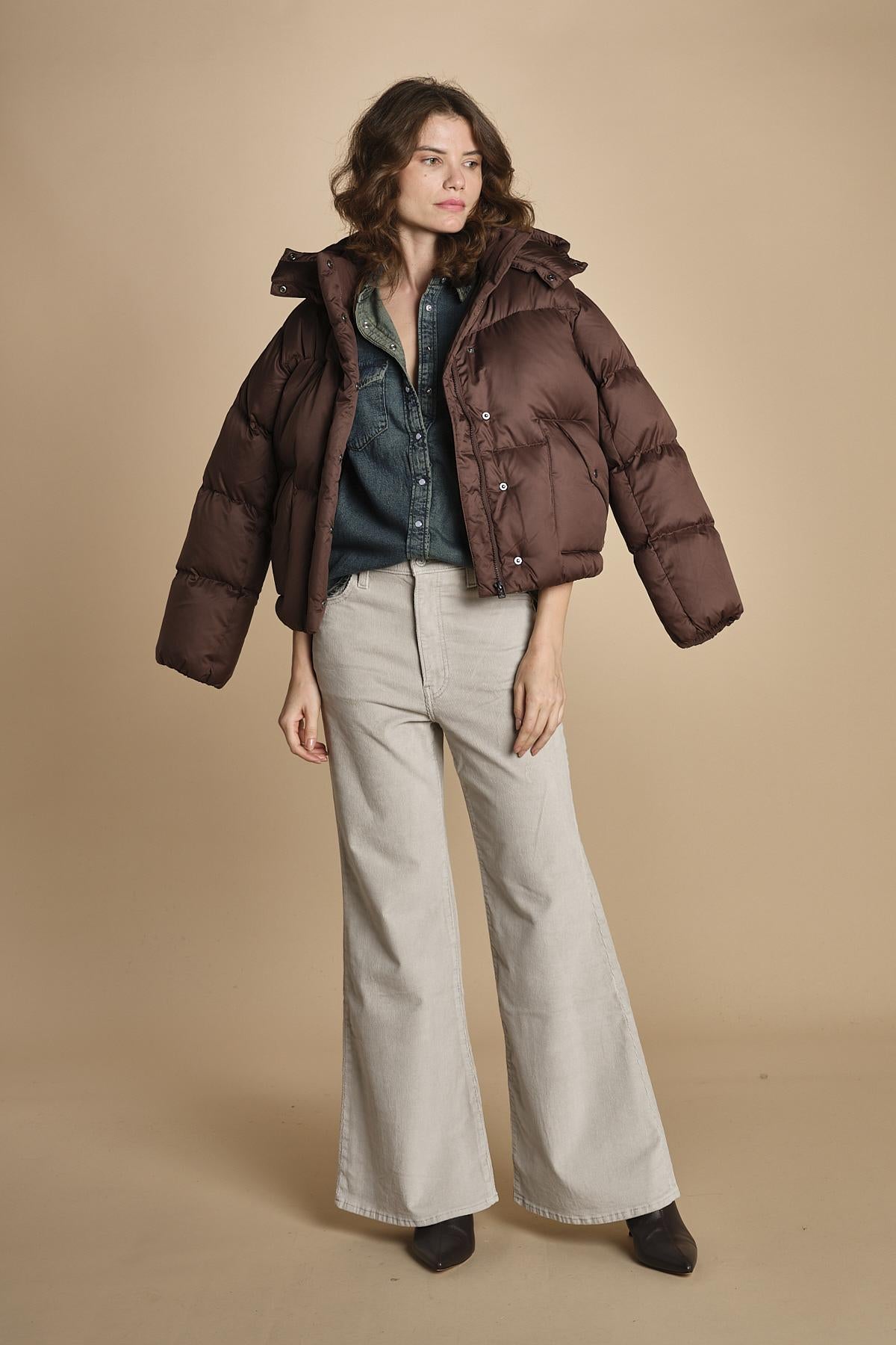 camicia in denim. La modella è alta 176 cm e indossa una taglia S. 100% COTONE