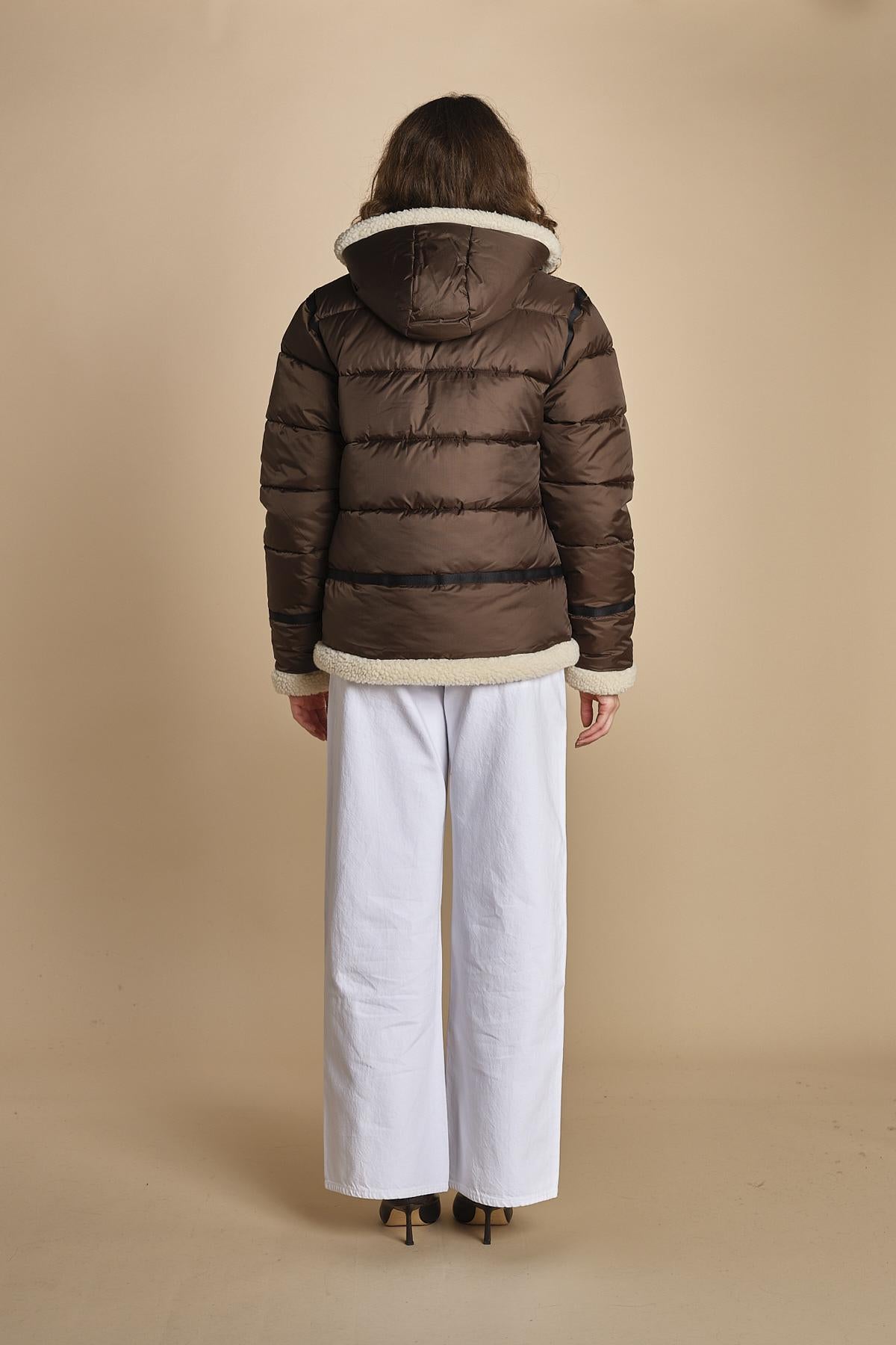 piumino con cappuccio. La modella è alta 176 cm e indossa una taglia S. 100% POLIAMMIDE