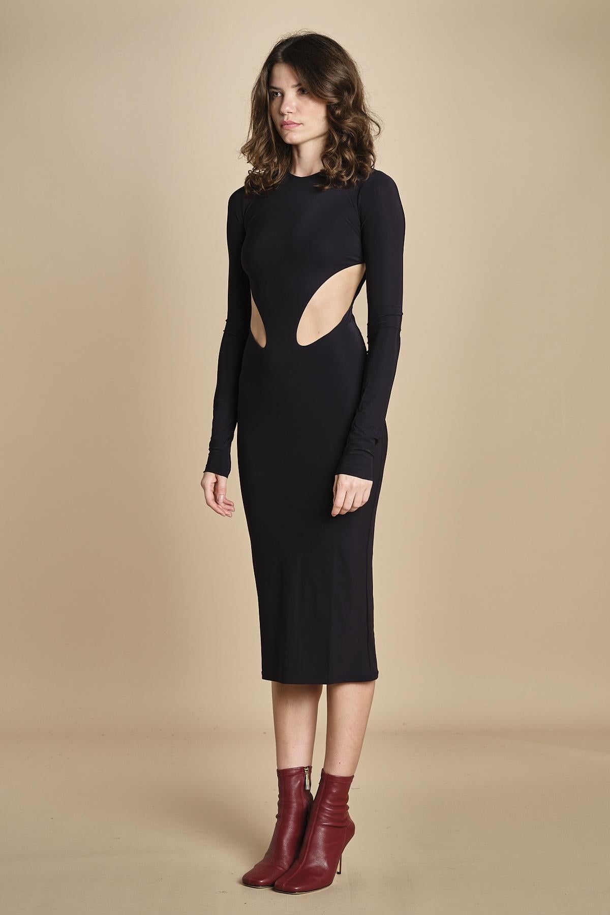 abito sotto il ginocchio con cut out in vita. La modella è alta 176 cm e indossa una taglia 38. 73% POLIAMMIDE 27% ELASTANE