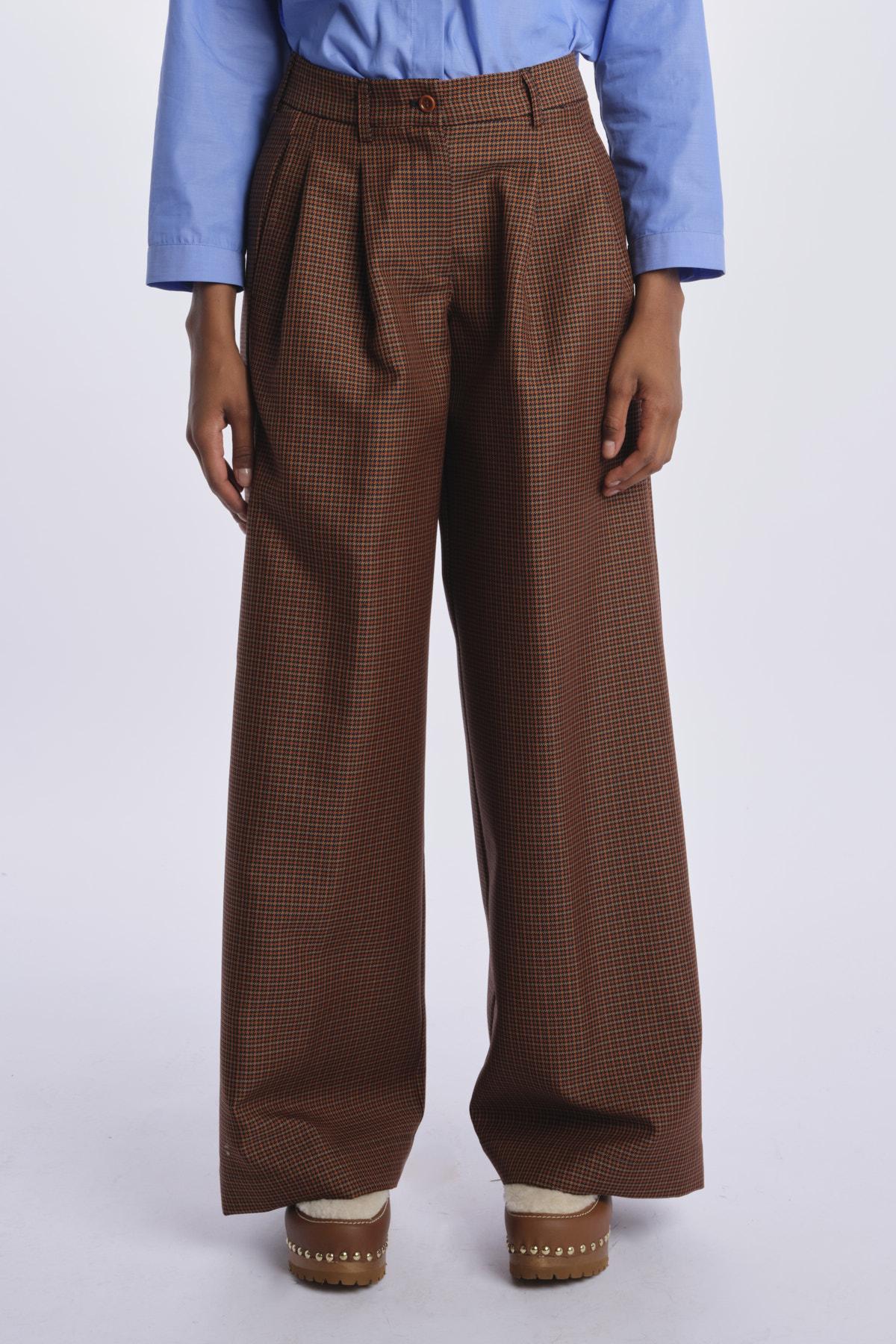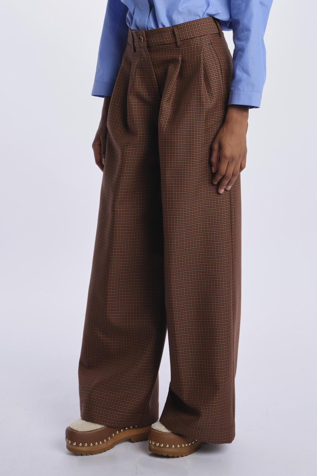 Pantalone by Jejia pied de poule con pinces. La modella è alta 174 cm e indossa la taglia 38. Composizione: 50% Lana, 50% Poliestere.