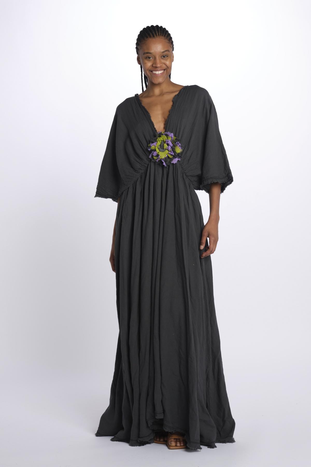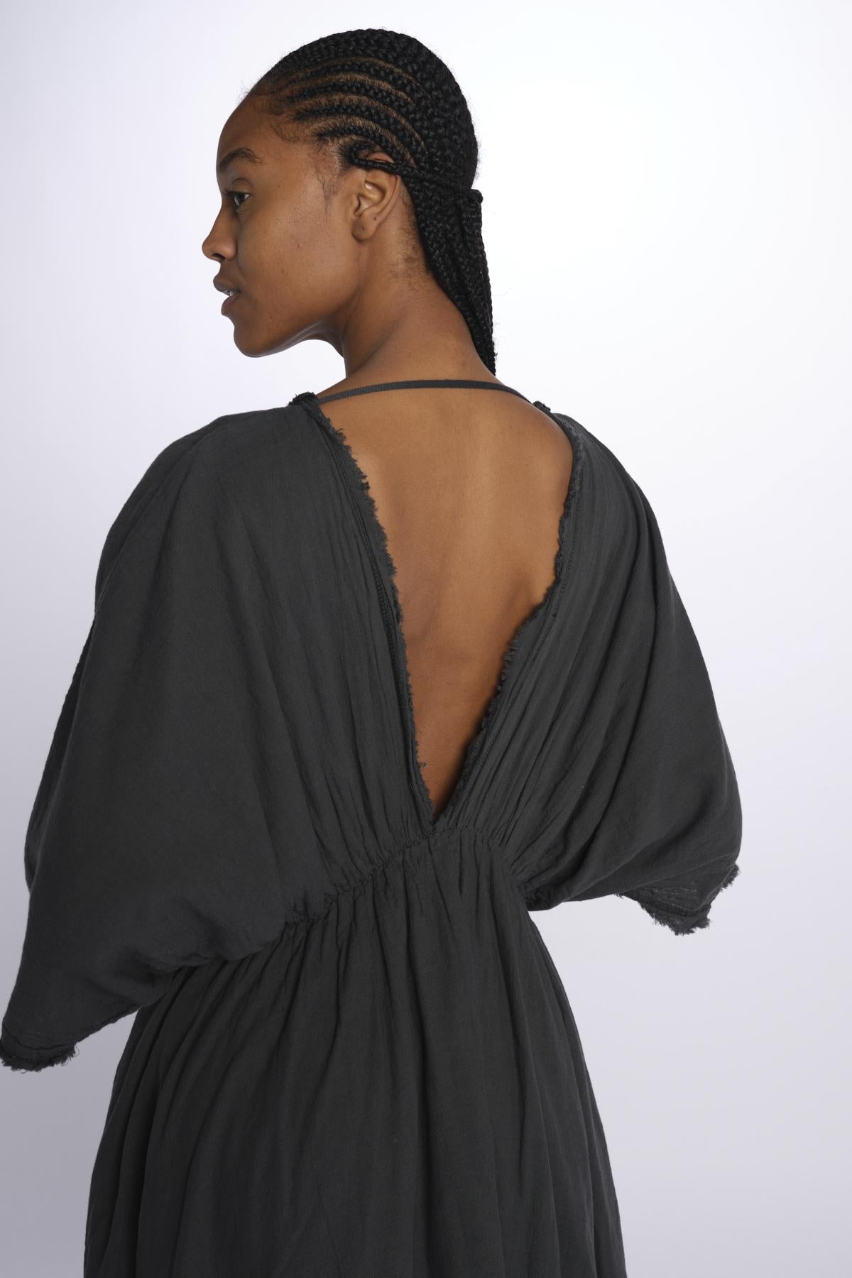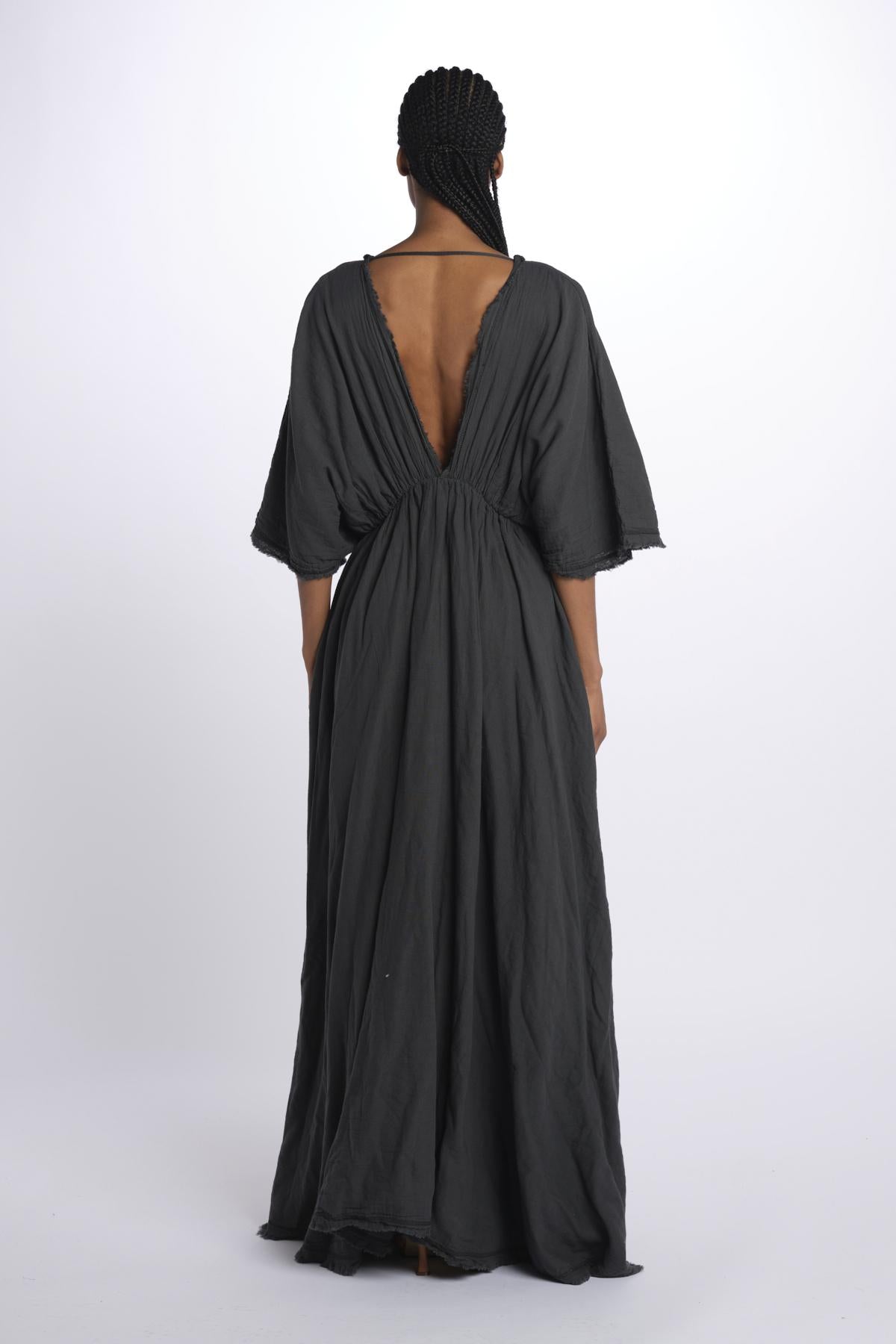 Abito CECILE lungo scollo V davanti dietro by la strega. La modella è alta 174 cm e indossa una taglia unica. Composizione: 100% cotone.