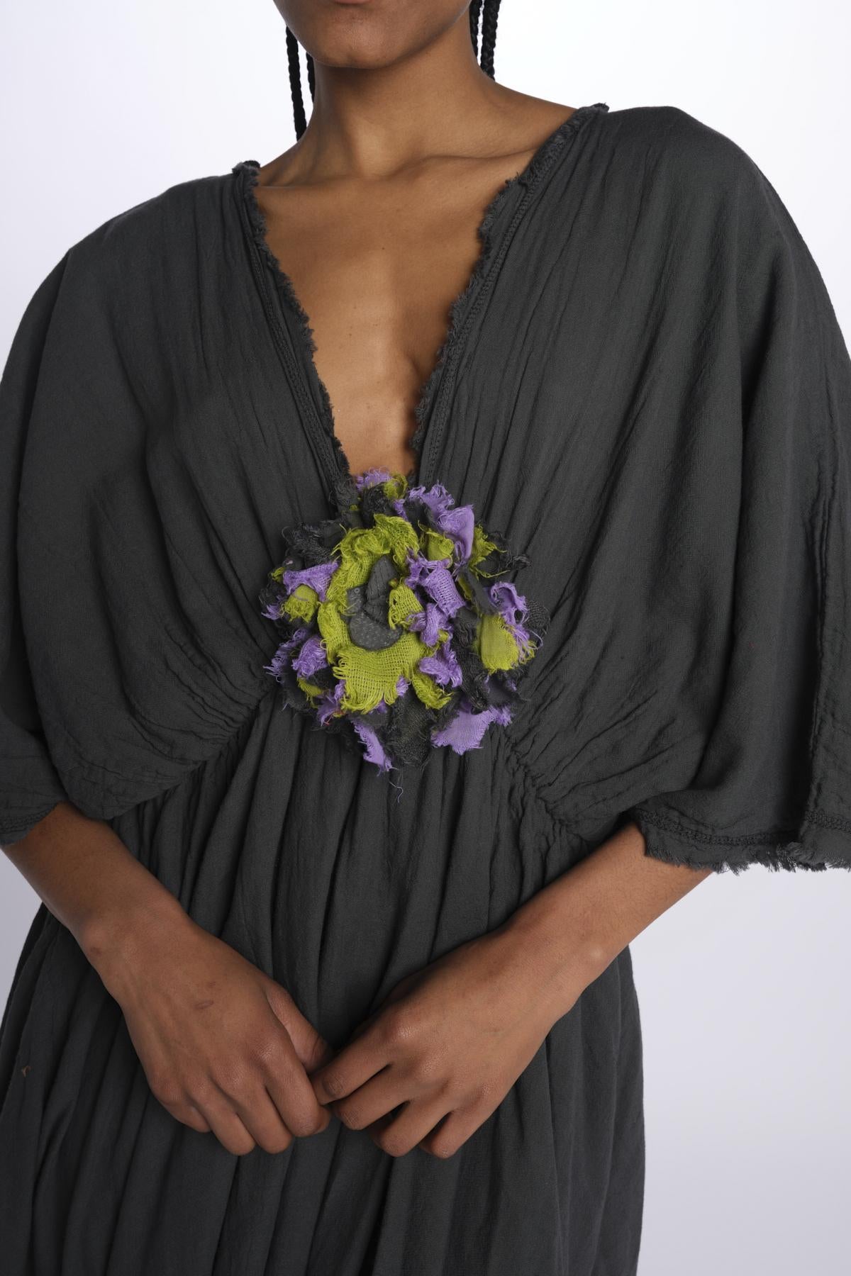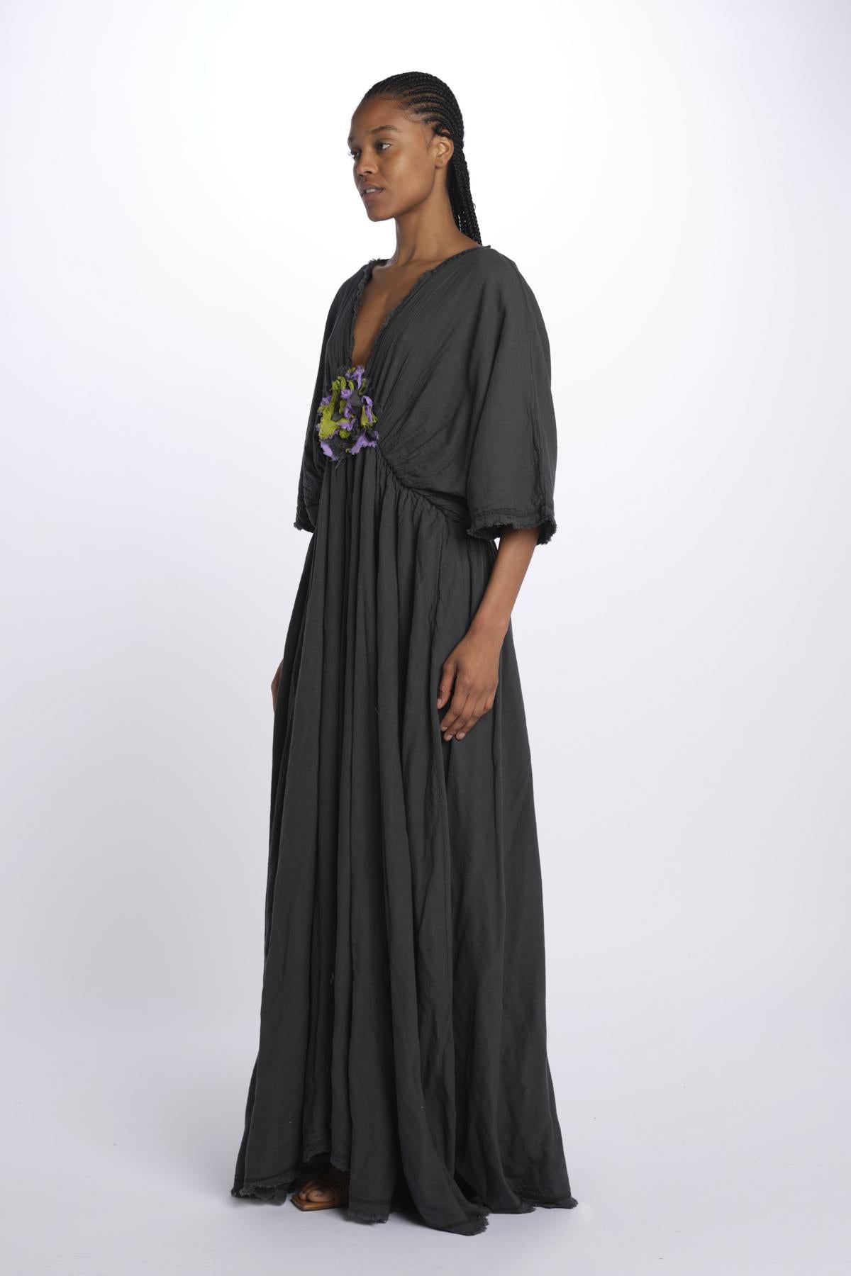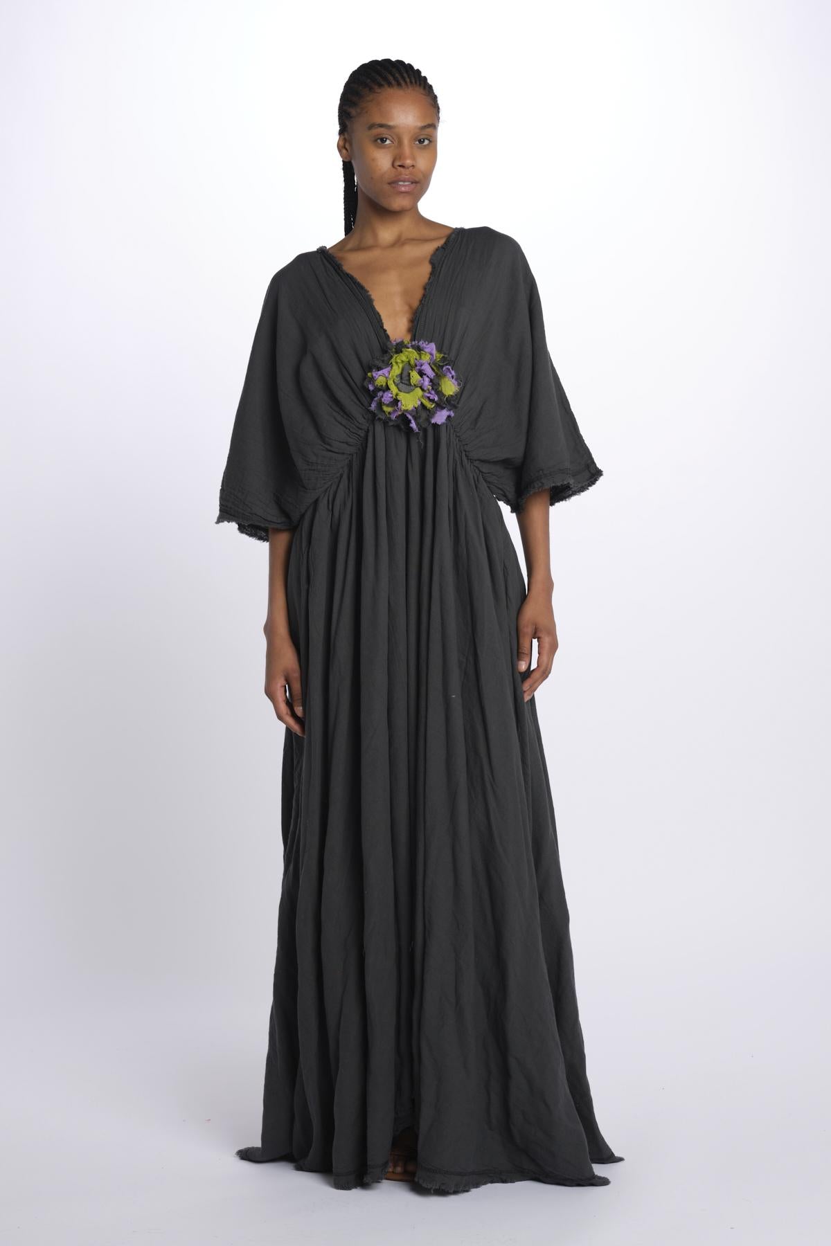 Abito CECILE lungo scollo V davanti dietro by la strega. La modella è alta 174 cm e indossa una taglia unica. Composizione: 100% cotone.