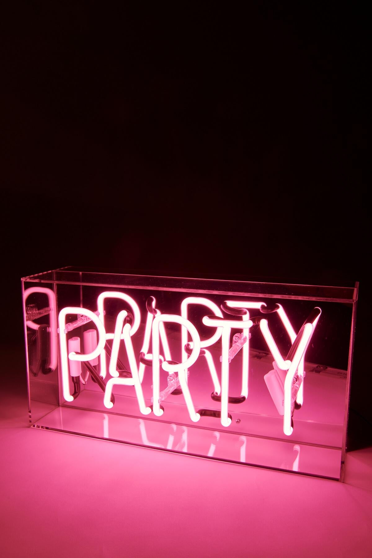 Luce neon Party rosa di Locomocean. Il neon è racchiuso in una scatola acrilica lucida con retro a specchio. Spina adattatore inclusa 12V DC UK e EU Dimensioni: 38 x 19 x 10,5 cm / 15 x 7,5 x 4,1 pollici.