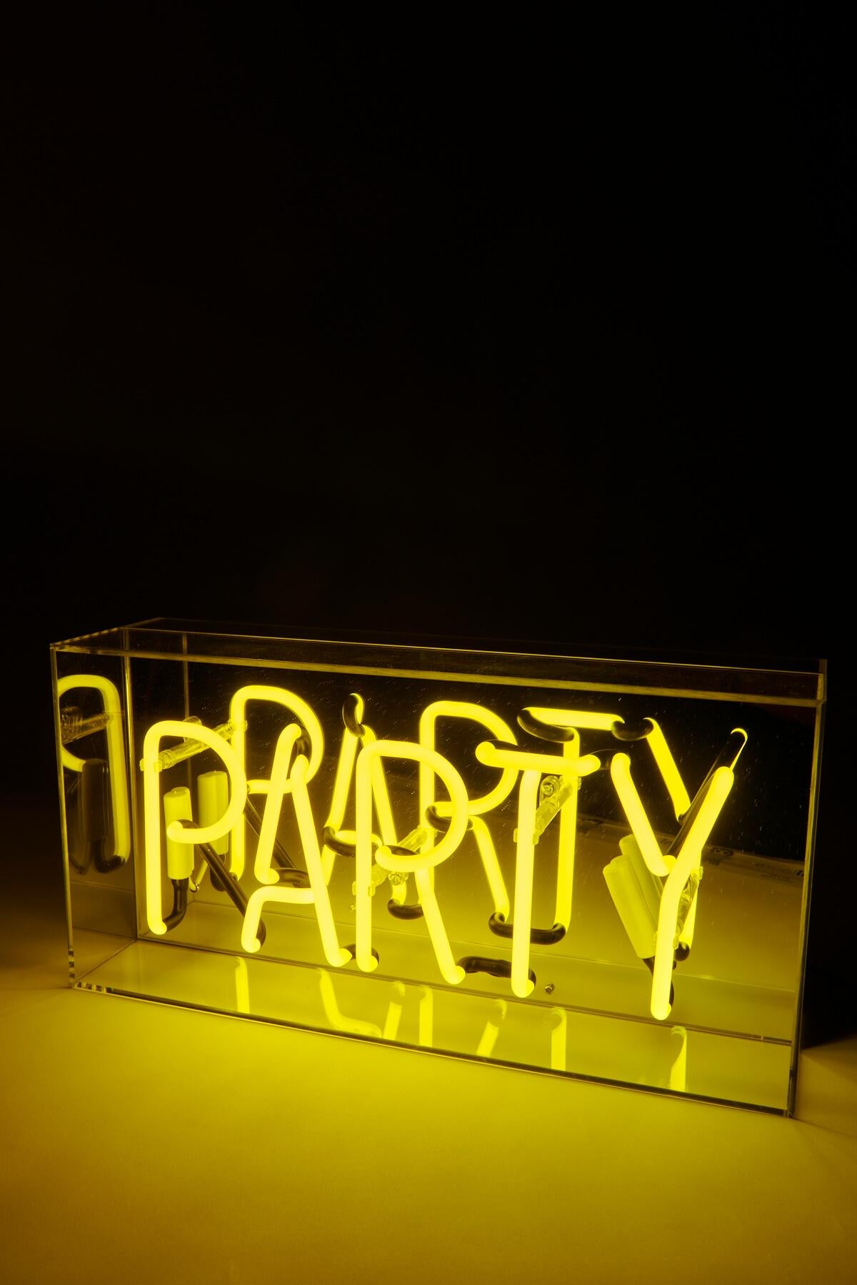 Luce neon Party giallo di Locomocean. Il neon è racchiuso in una scatola acrilica lucida con retro a specchio. Spina adattatore inclusa 12V DC UK e EU Dimensioni: 38 x 19 x 10,5 cm / 15 x 7,5 x 4,1 pollici