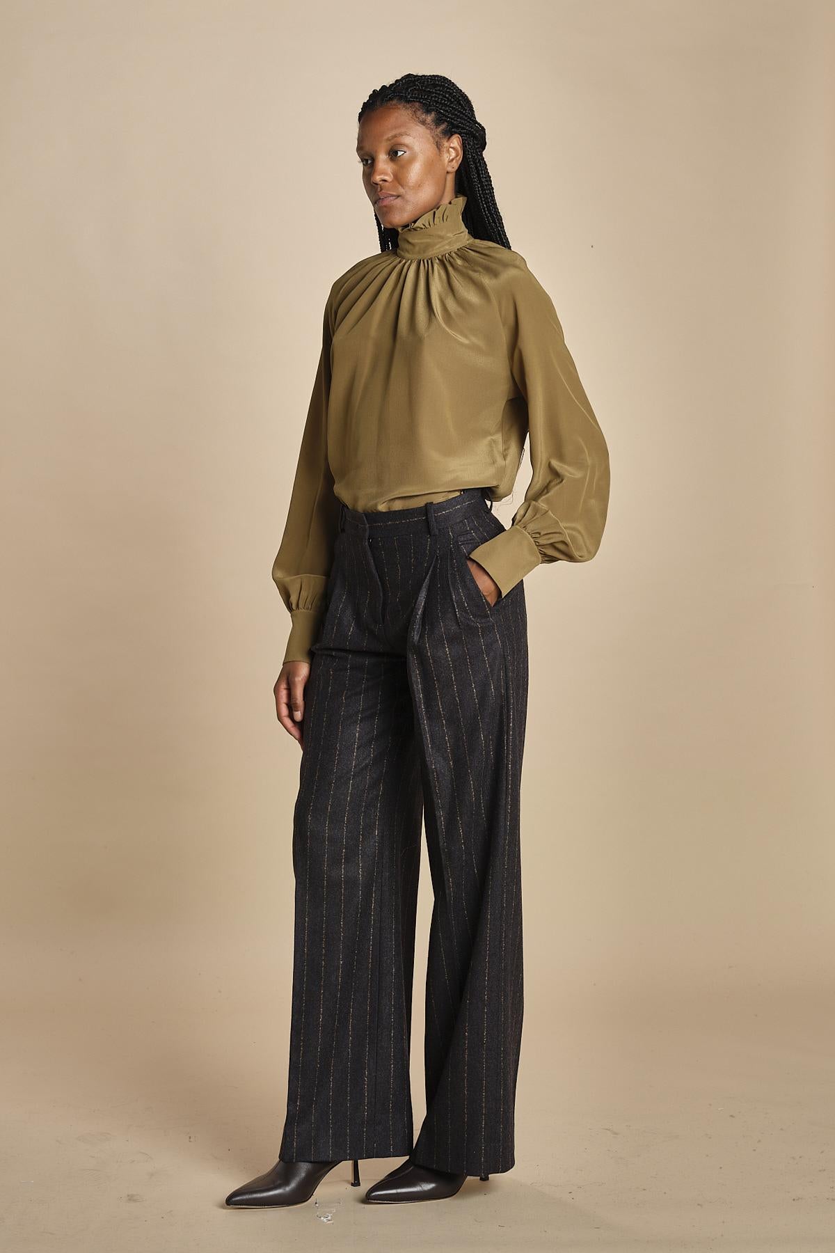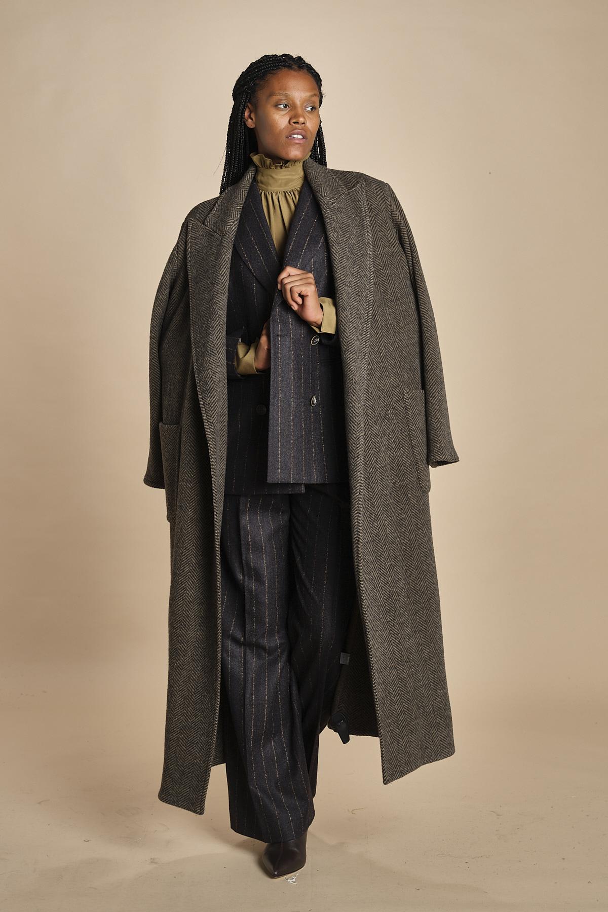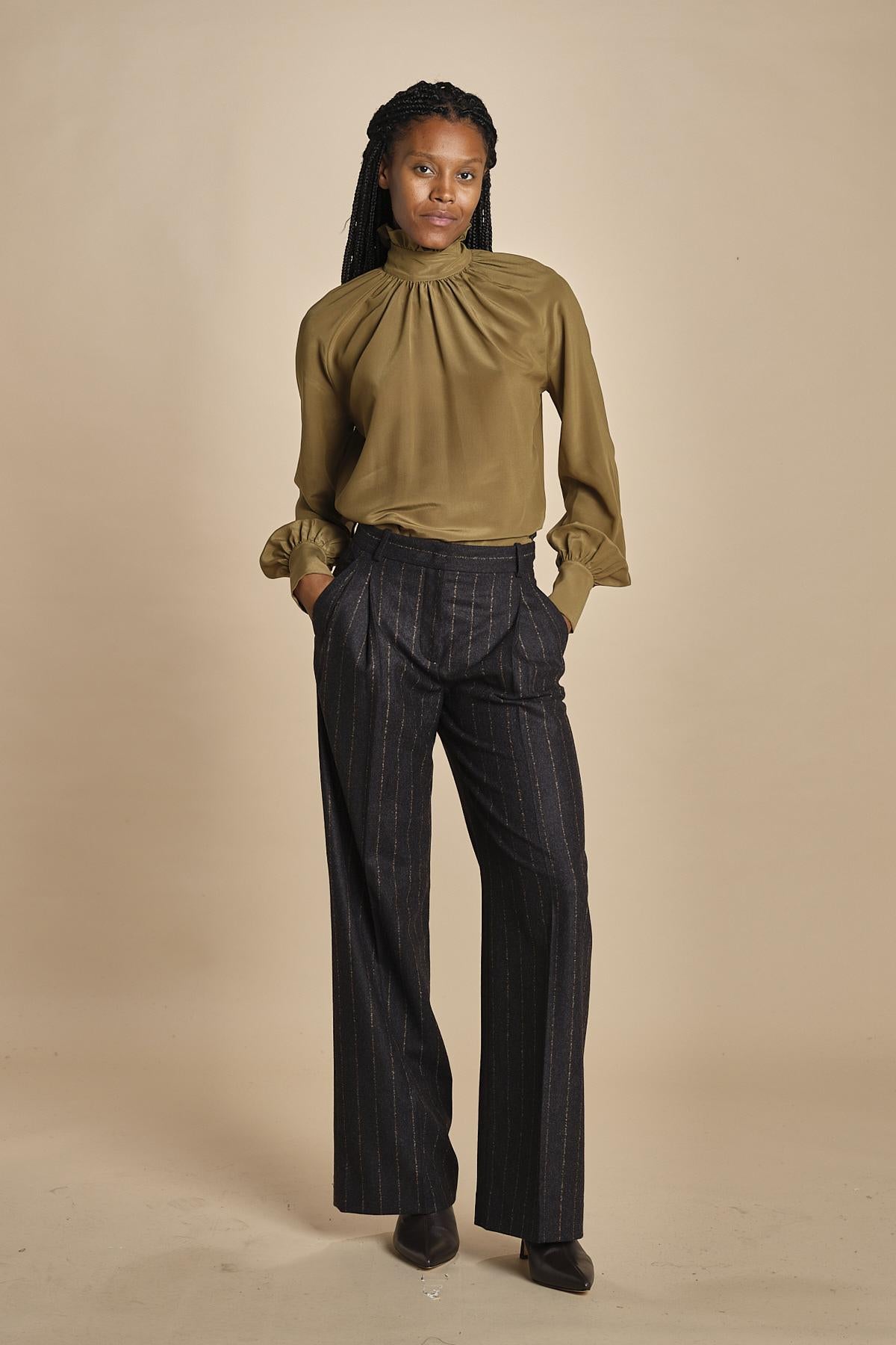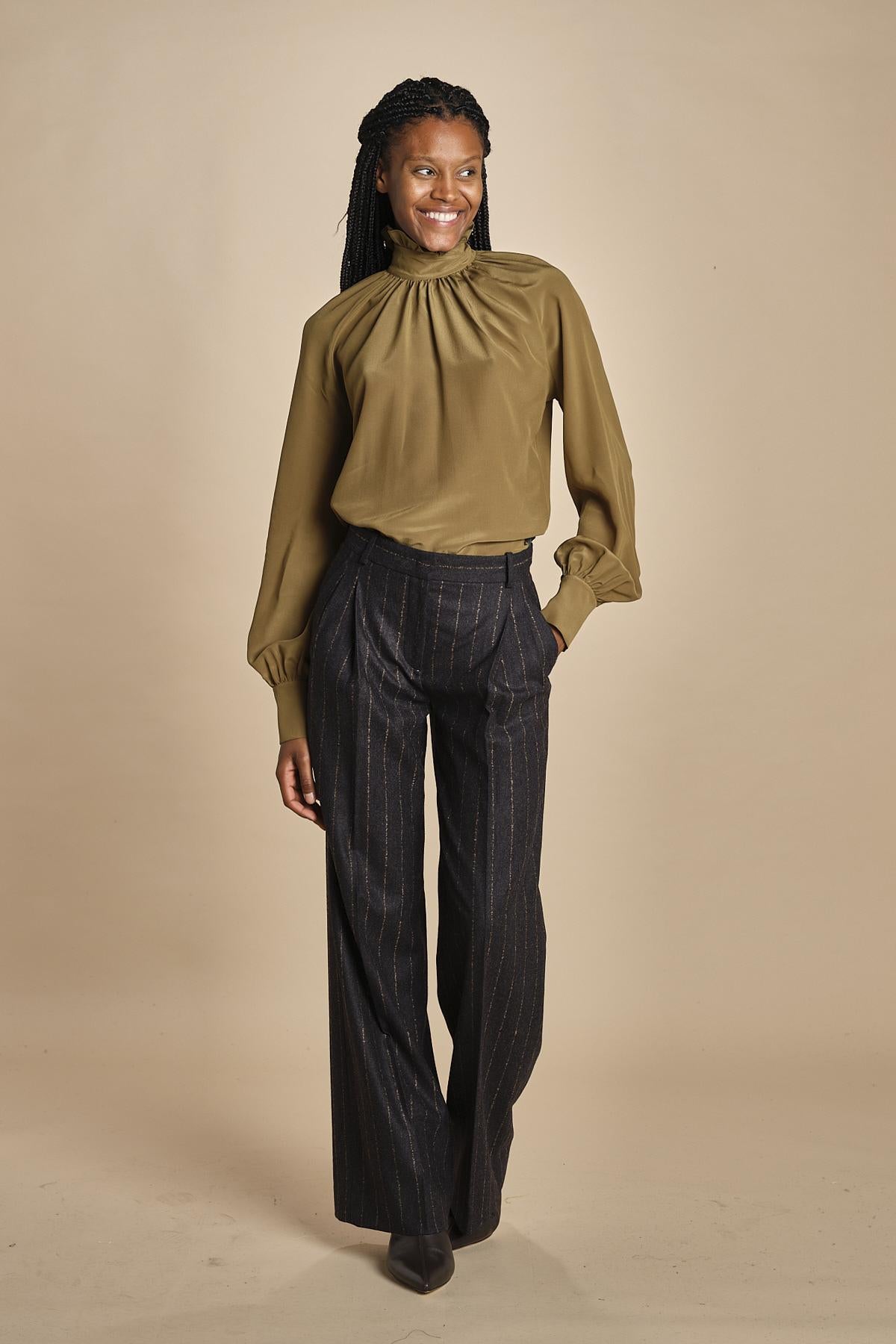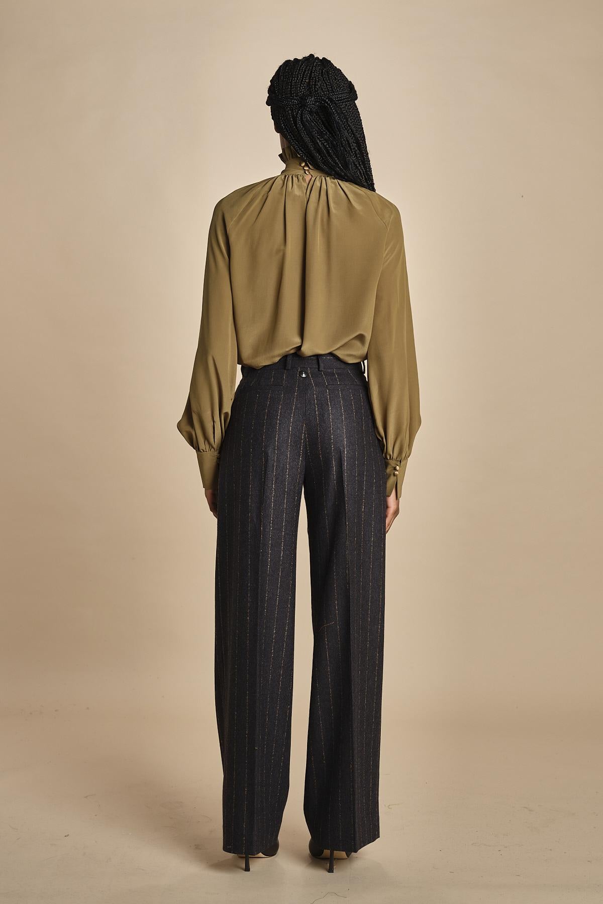 pantalone gessato con pinces by quelledue. La modella è alta 174 cm e indossa una taglia 38. Composizione: 92% lana vergine, 7% cashmere, 1% poliammide.