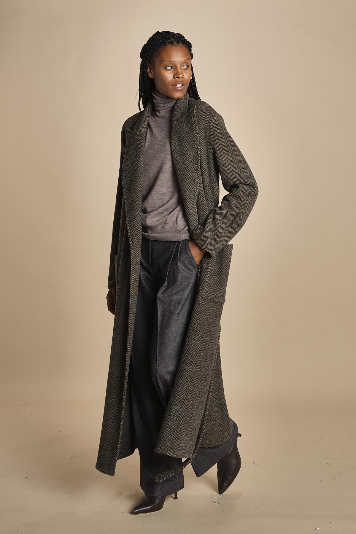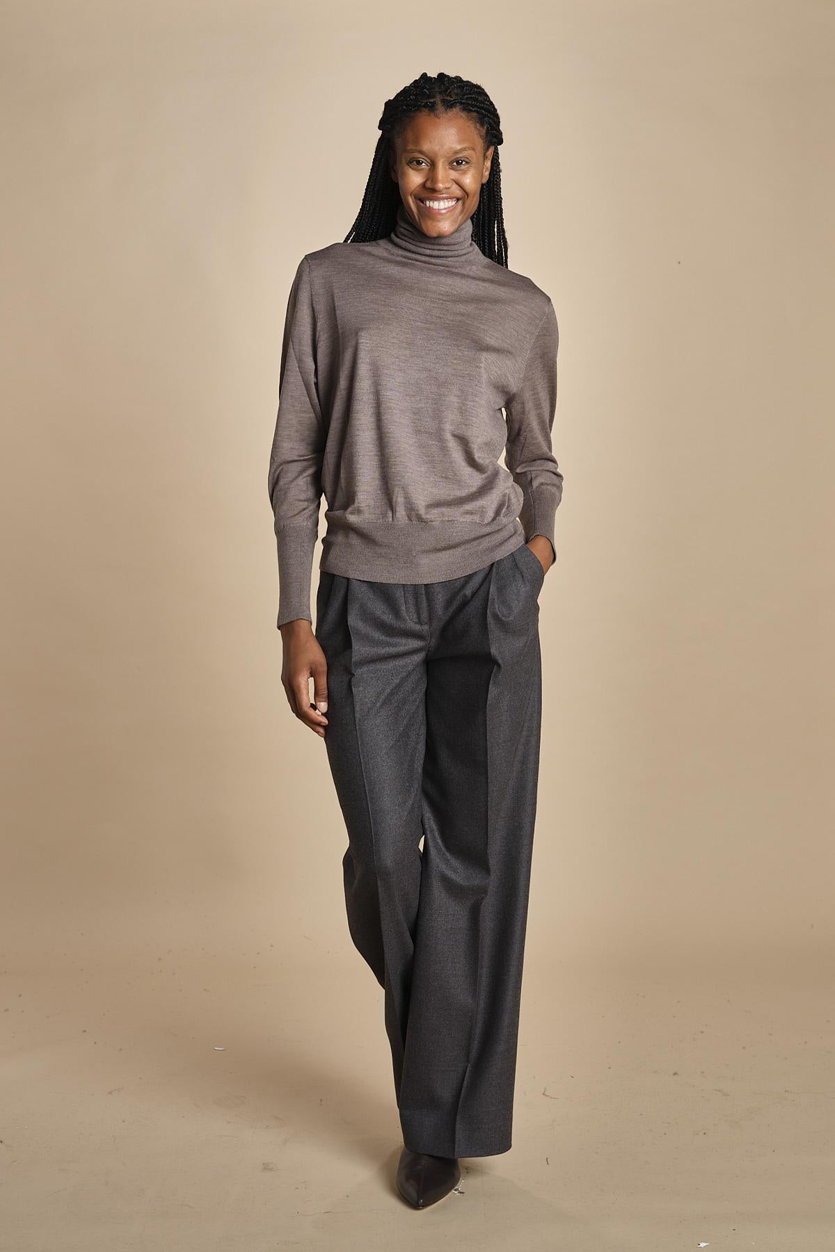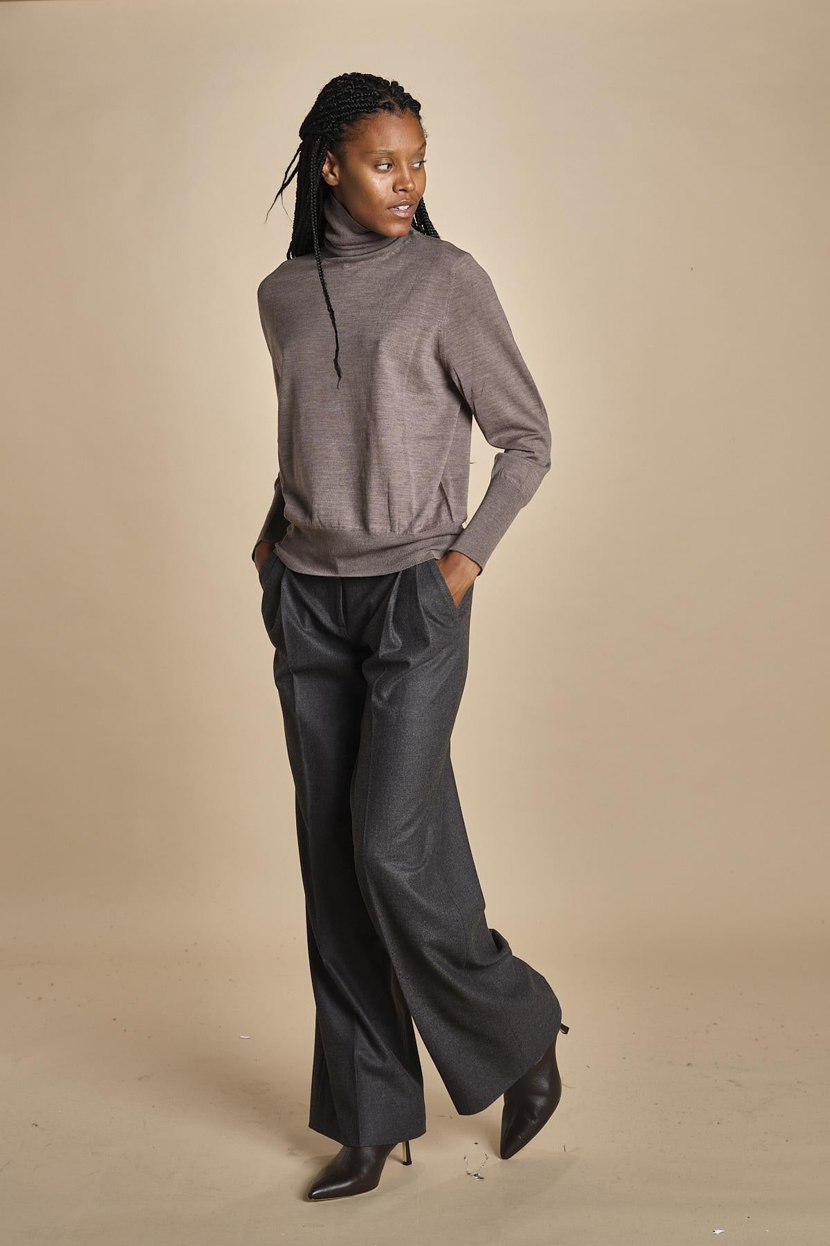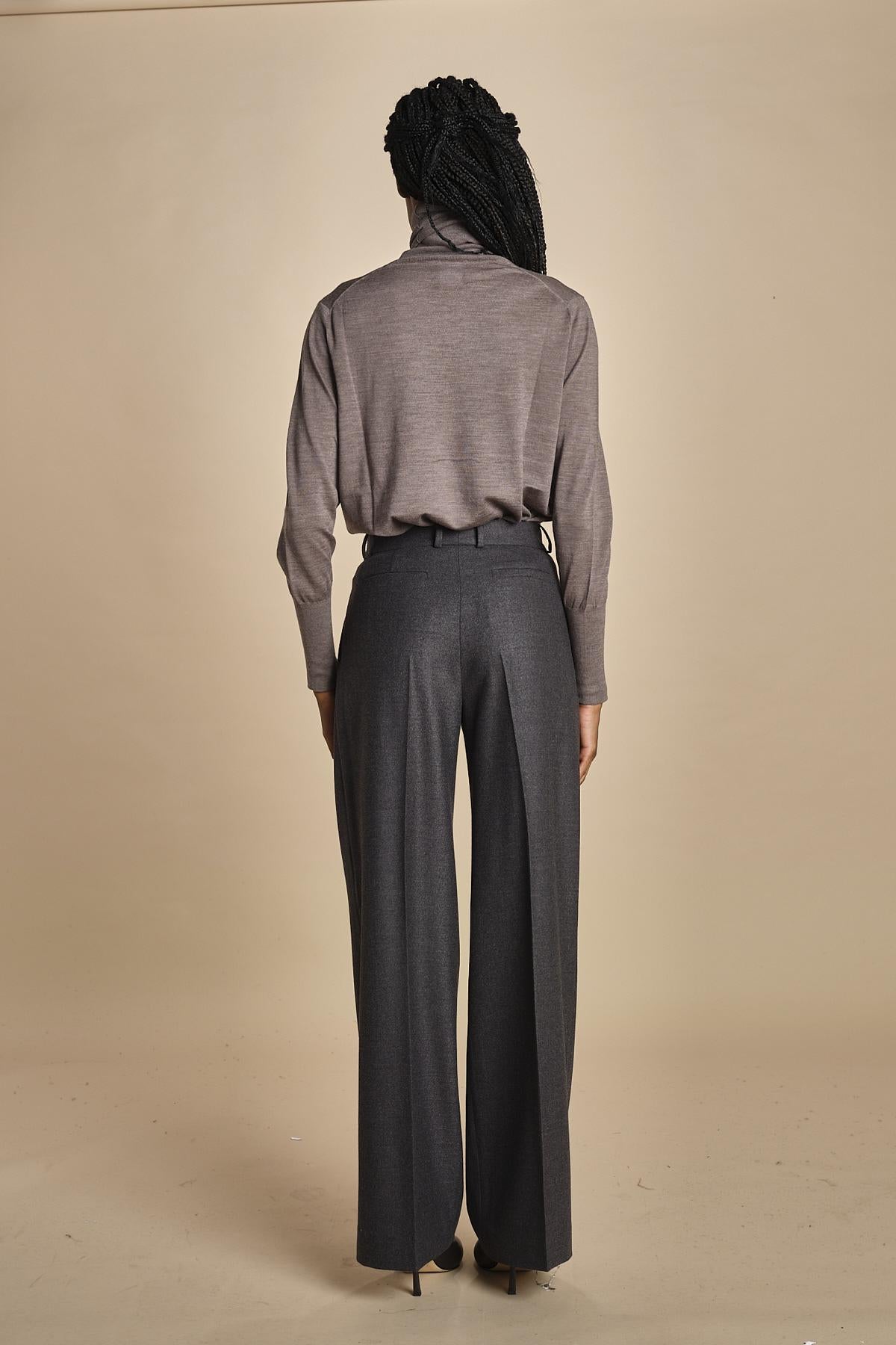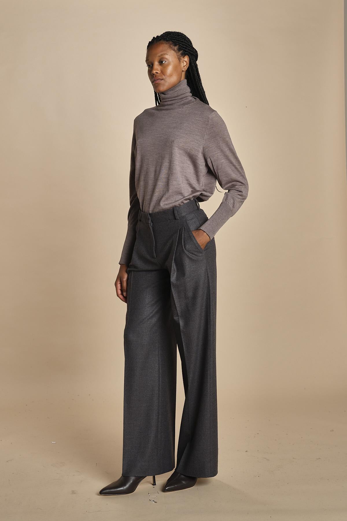 pantalone con pinces in flanella by quelledue. La modella è alta 174 cm e indossa una taglia 38. Composizione: 97% lana vergine, 3% elastan.