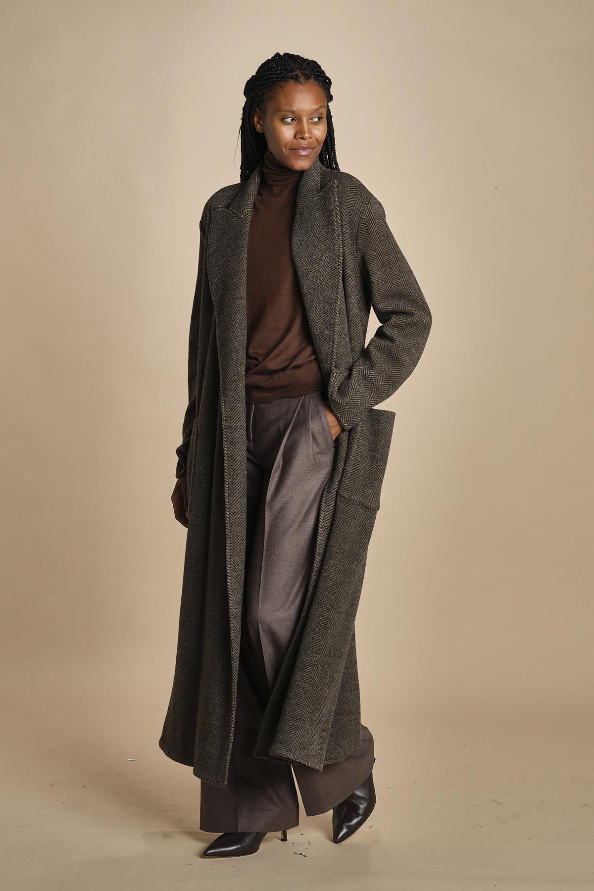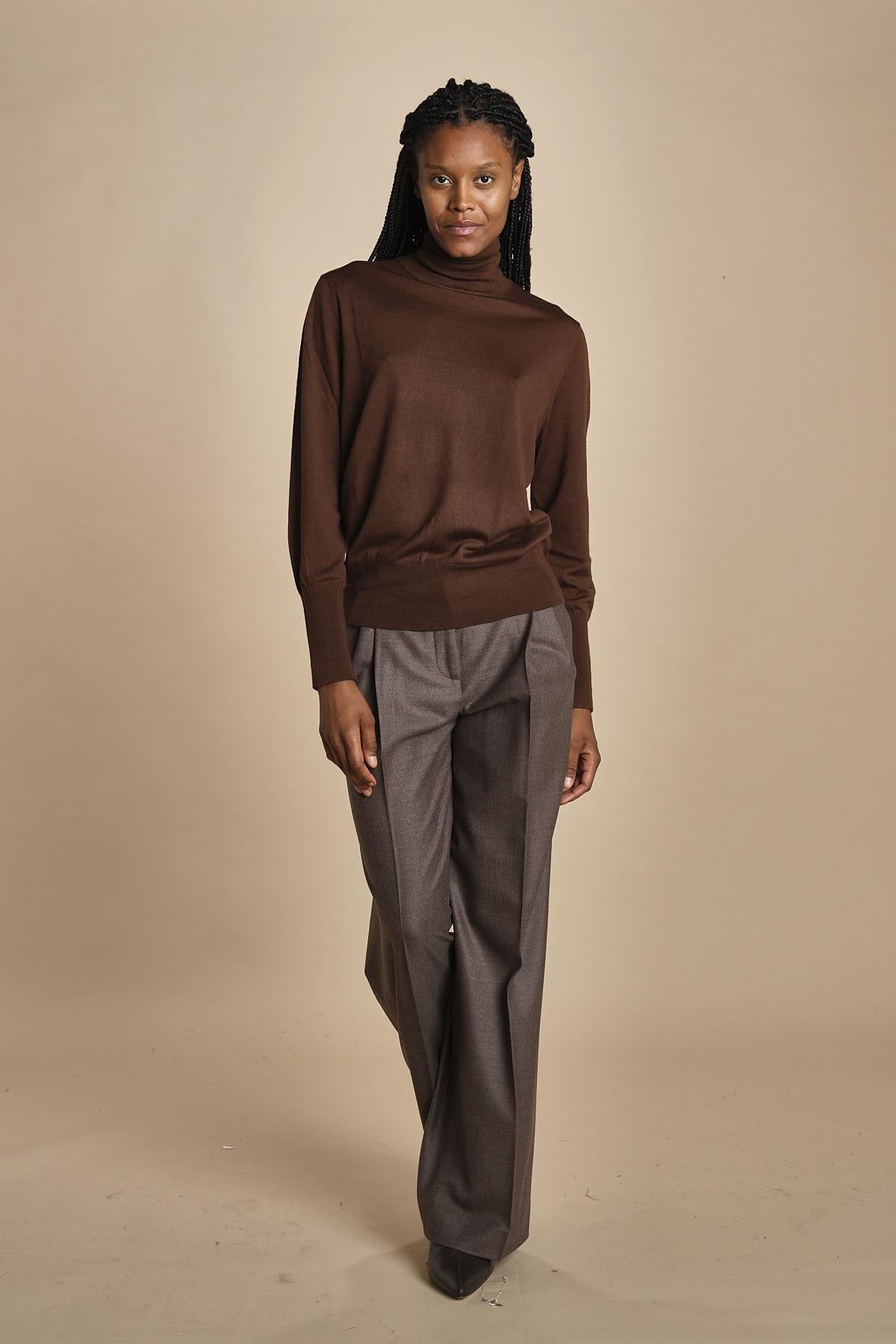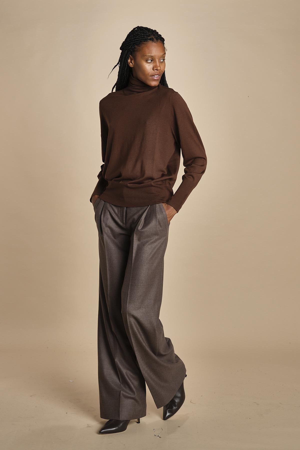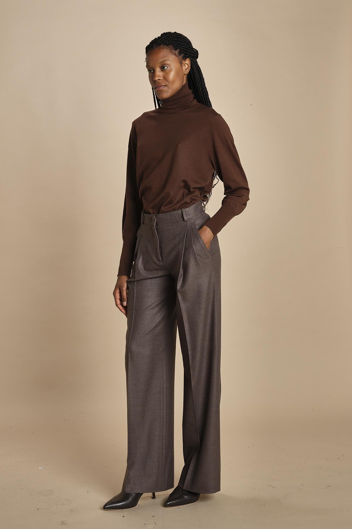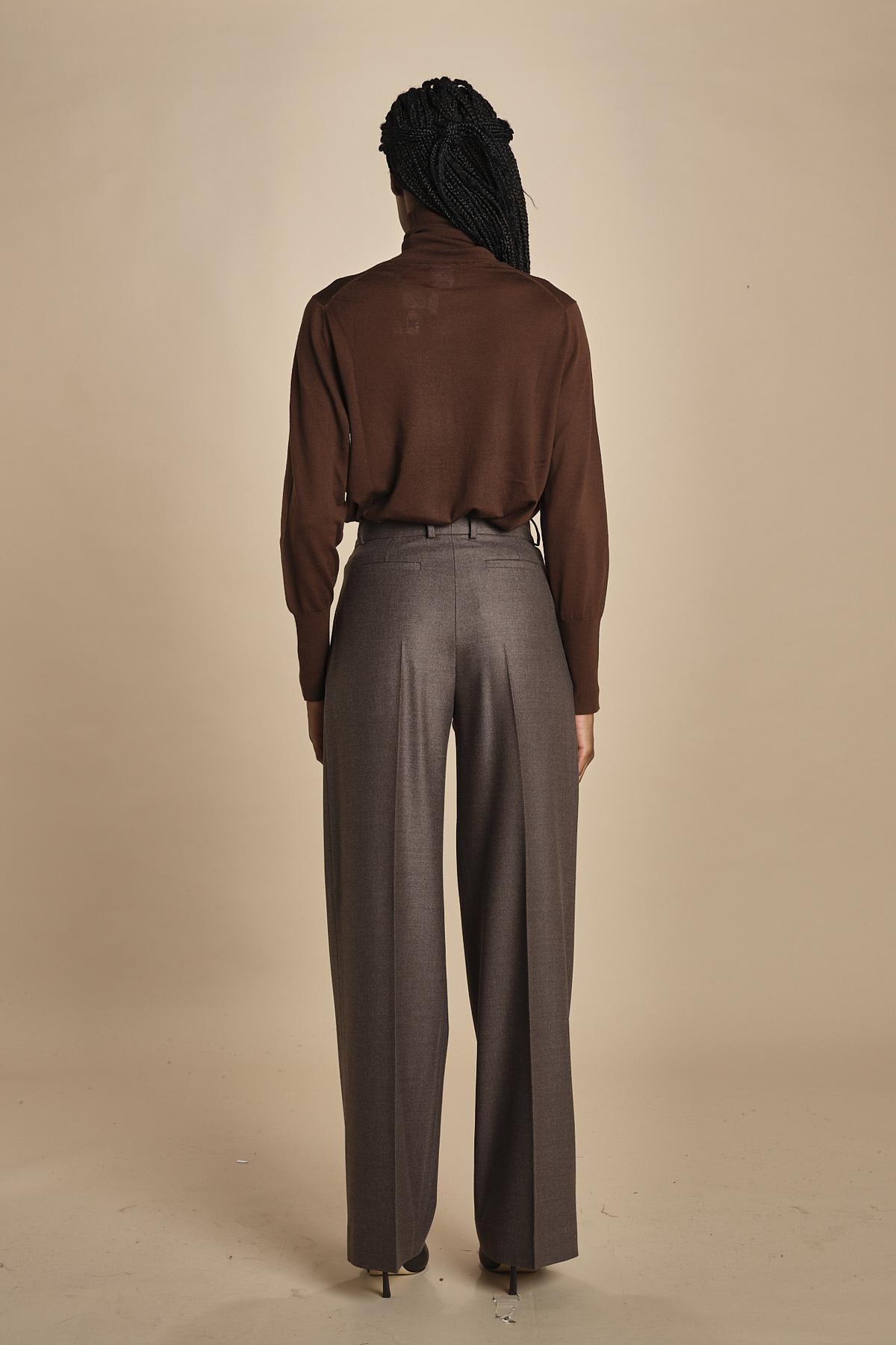 pantalone in flanella con pinces by quelledue. La modella è alta 174 cm e indossa una taglia 38. Composizione: 97% lana vergine, 3% elastan.
