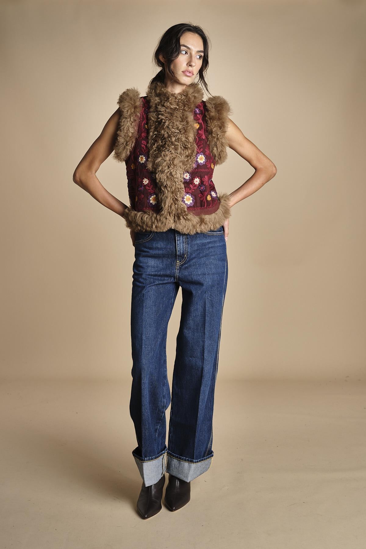 gilet ricamato con mongolia. La modella è alta 180 cm e indossa una taglia XS. 100% COTONE
