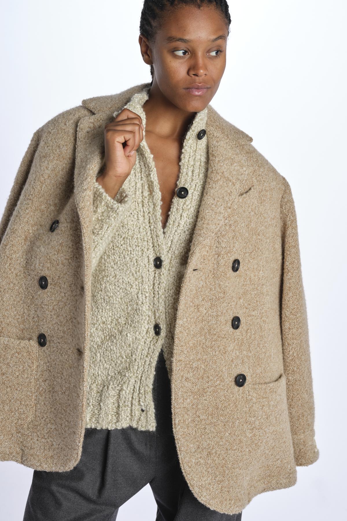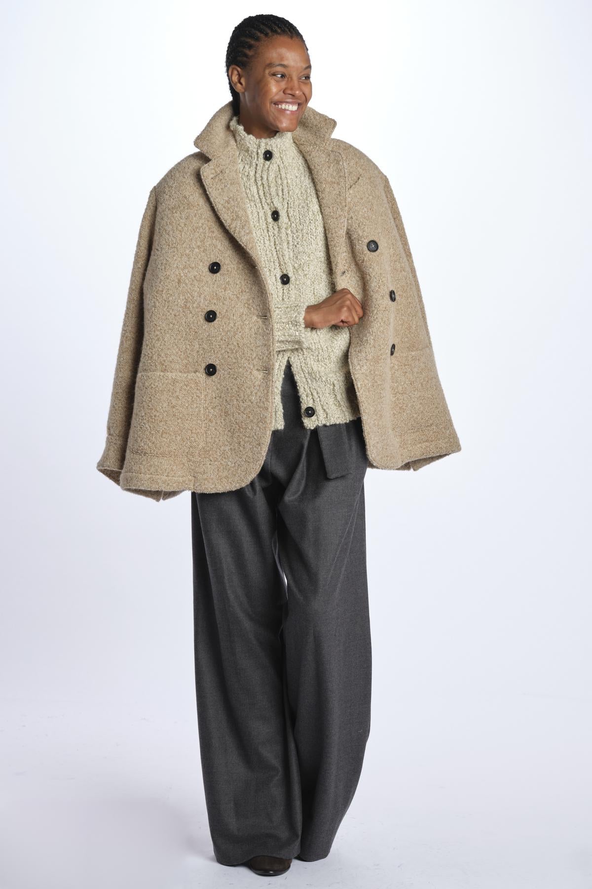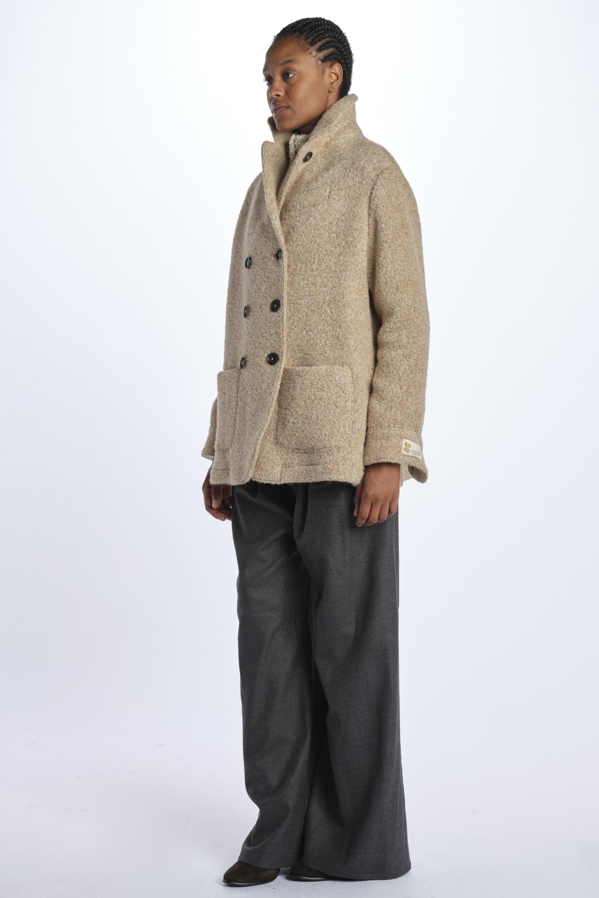 Peacoat MILY by massimo alba cashmere bouclè. La modella è alta 174 cm e indossa una taglia XS. Composizione: 46% alpaca, 46% lana vergine, 11% nylon.