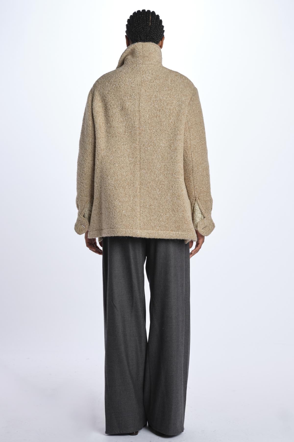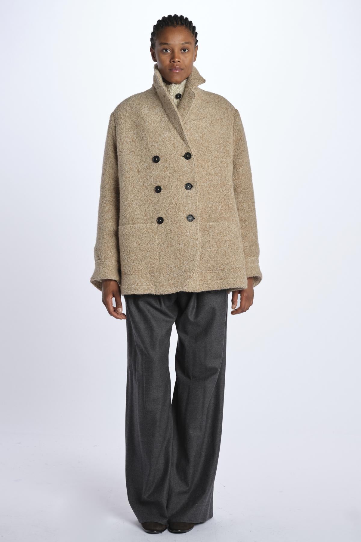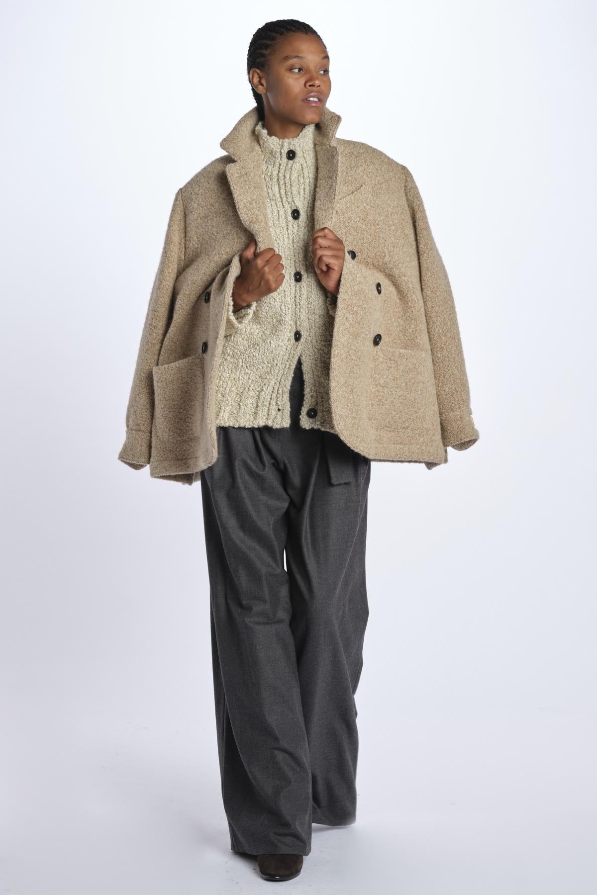 Peacoat MILY by massimo alba cashmere bouclè. La modella è alta 174 cm e indossa una taglia XS. Composizione: 46% alpaca, 46% lana vergine, 11% nylon.