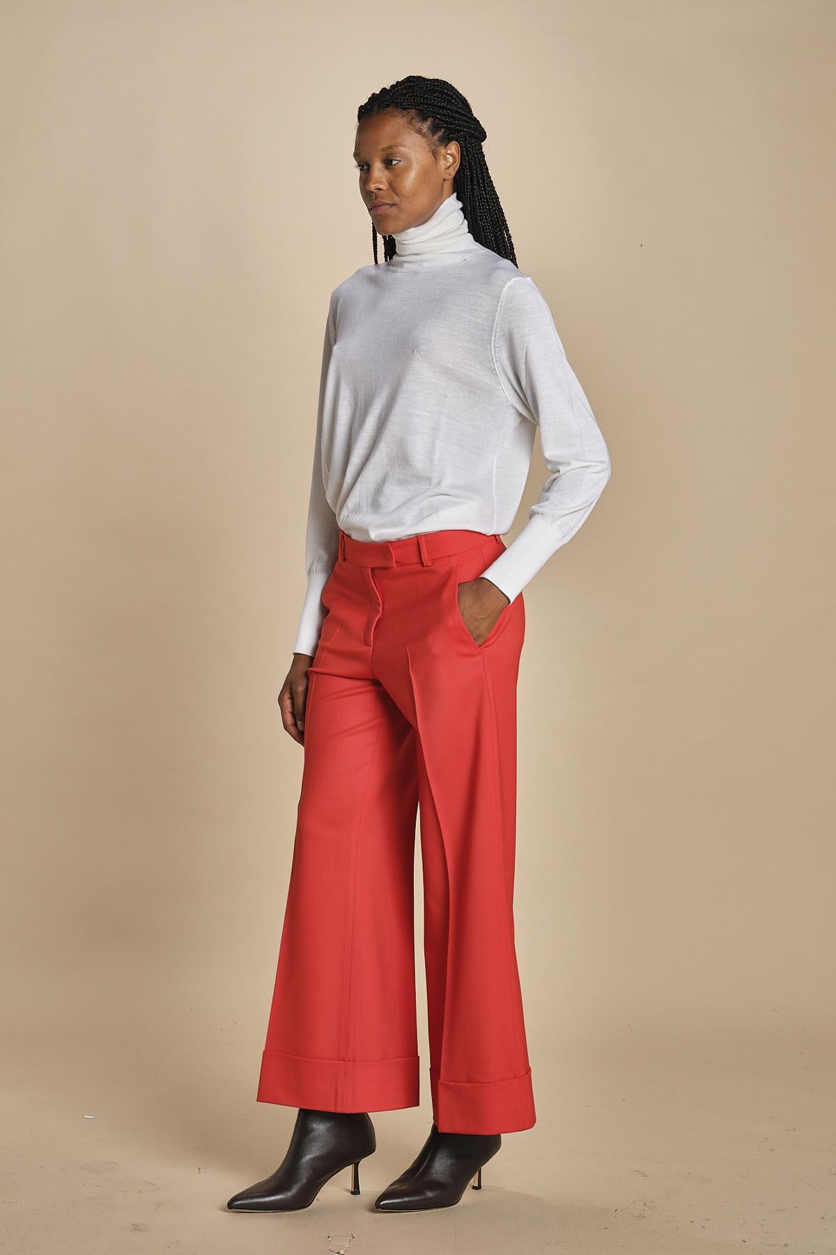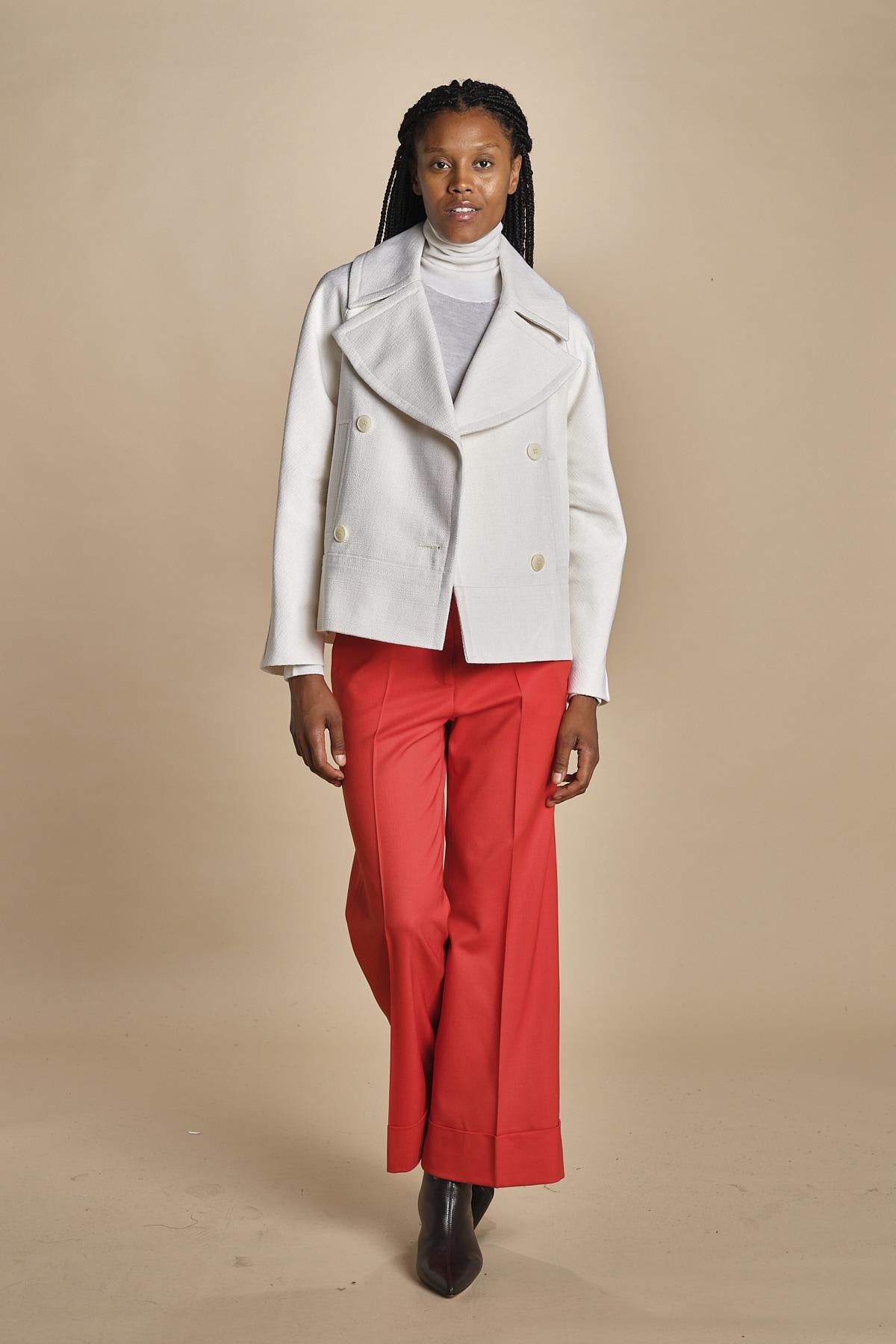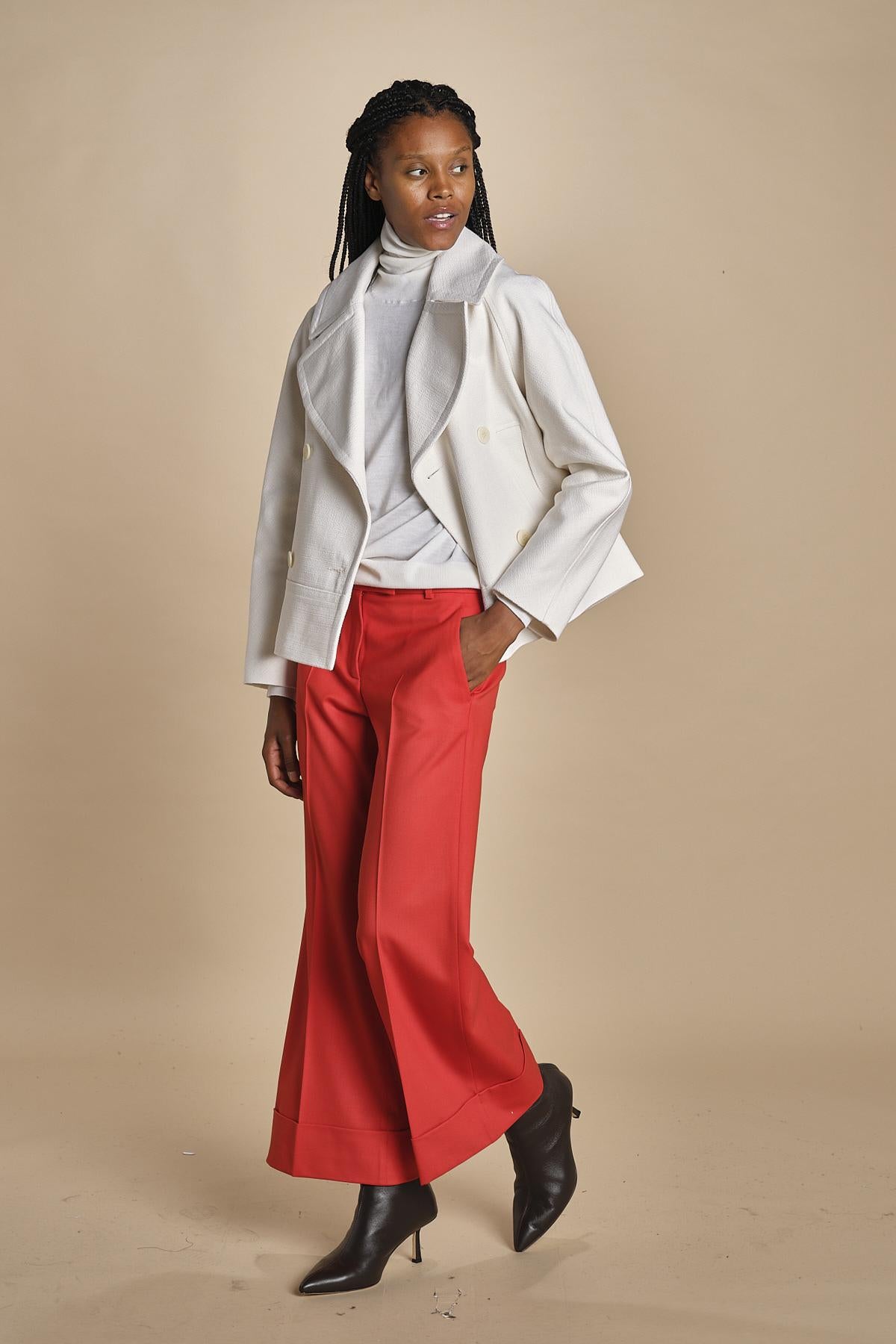 pantalone cropped con risvolto in gabardina by quelledue. La modella è alta 174 cm e indossa una taglia 40. Composizione: 97% lana vergine, 3% lycra.