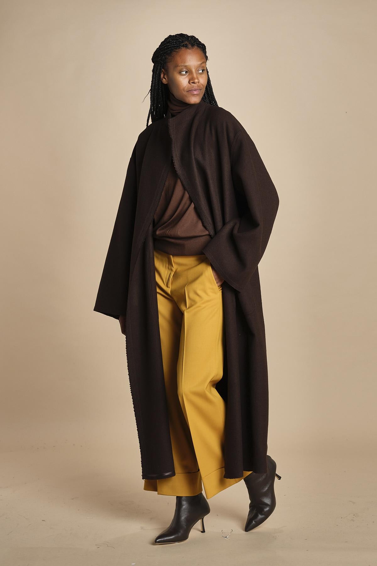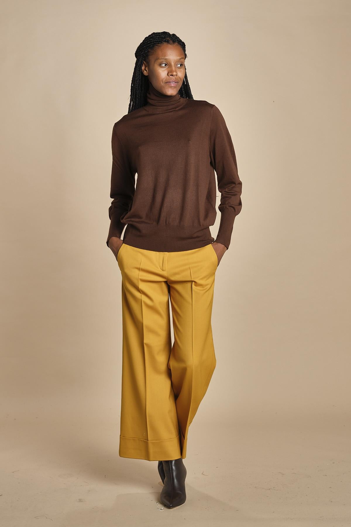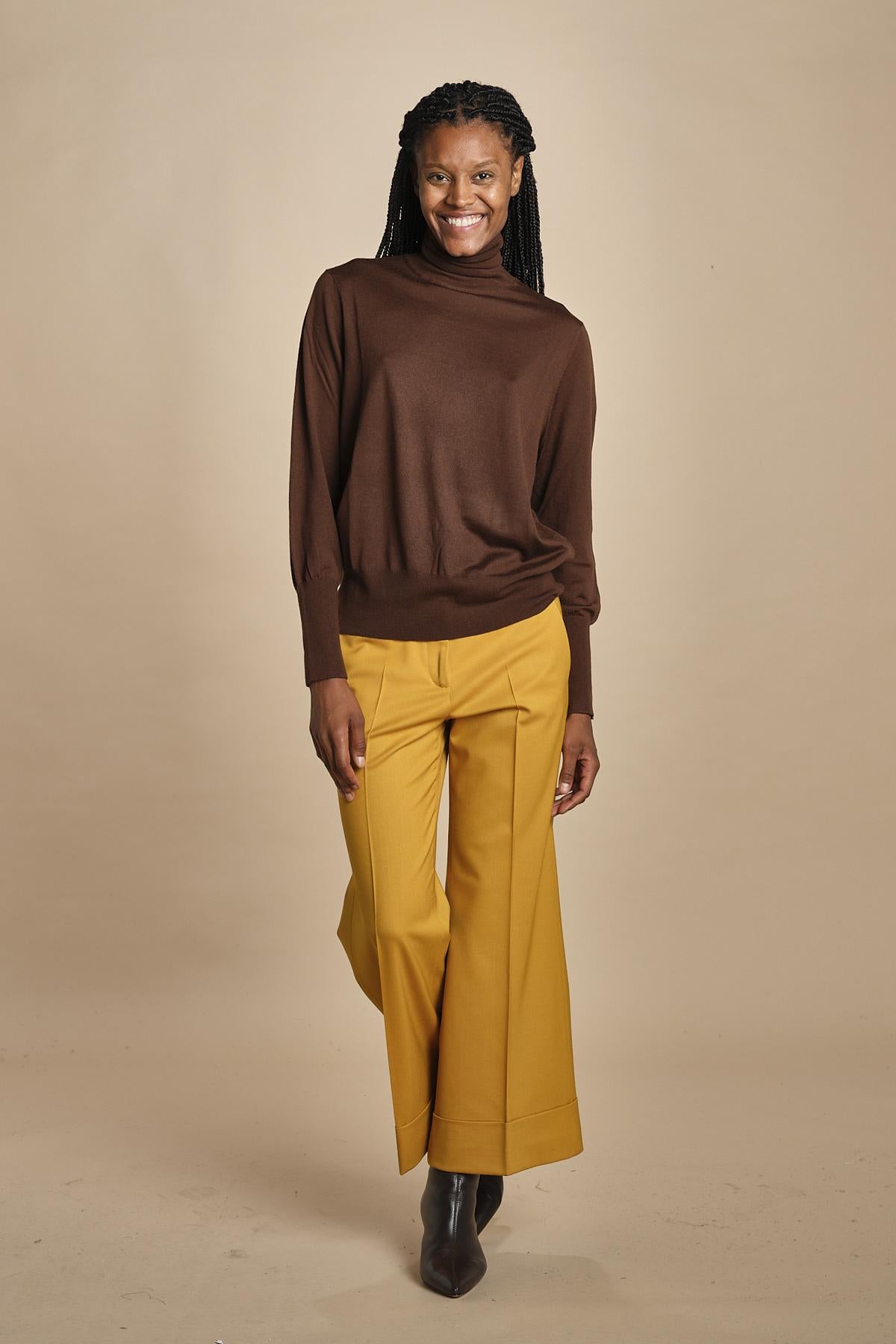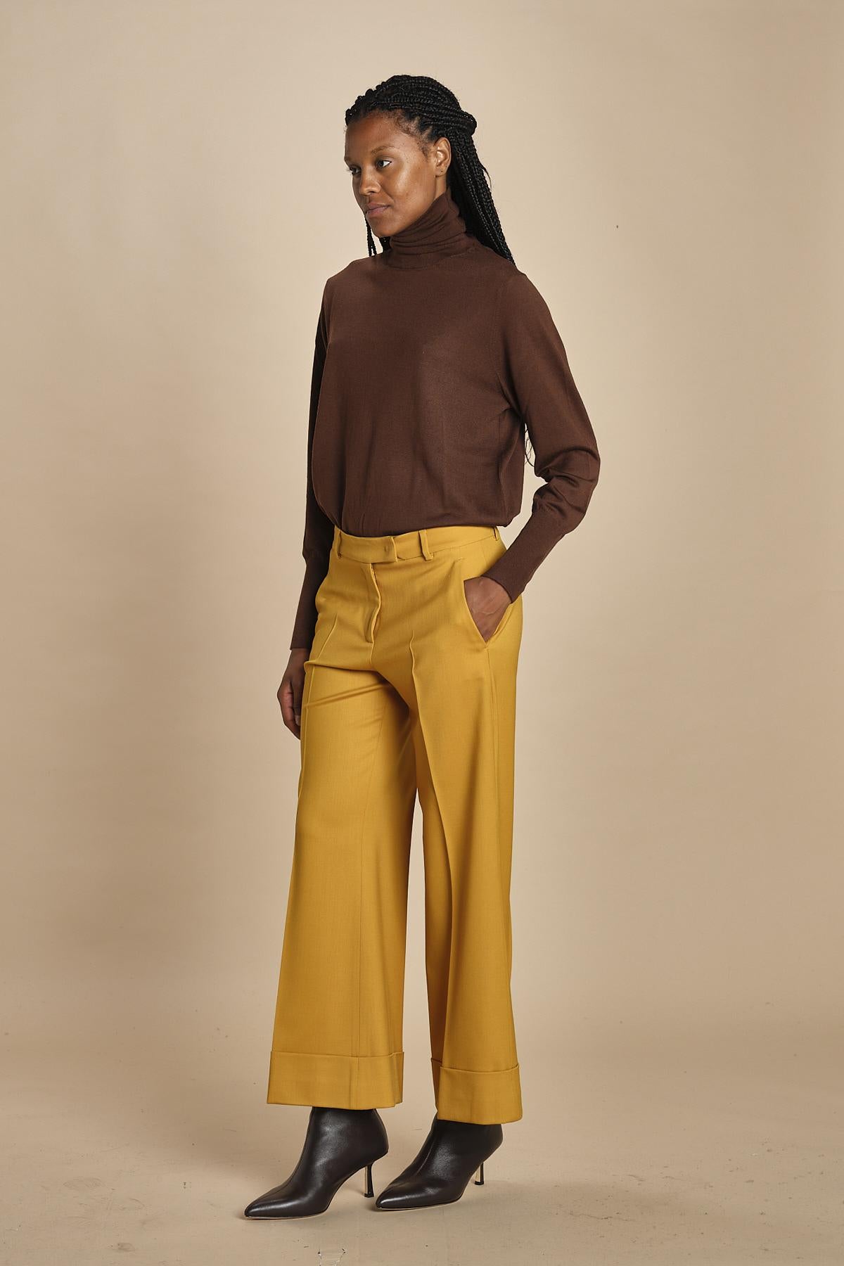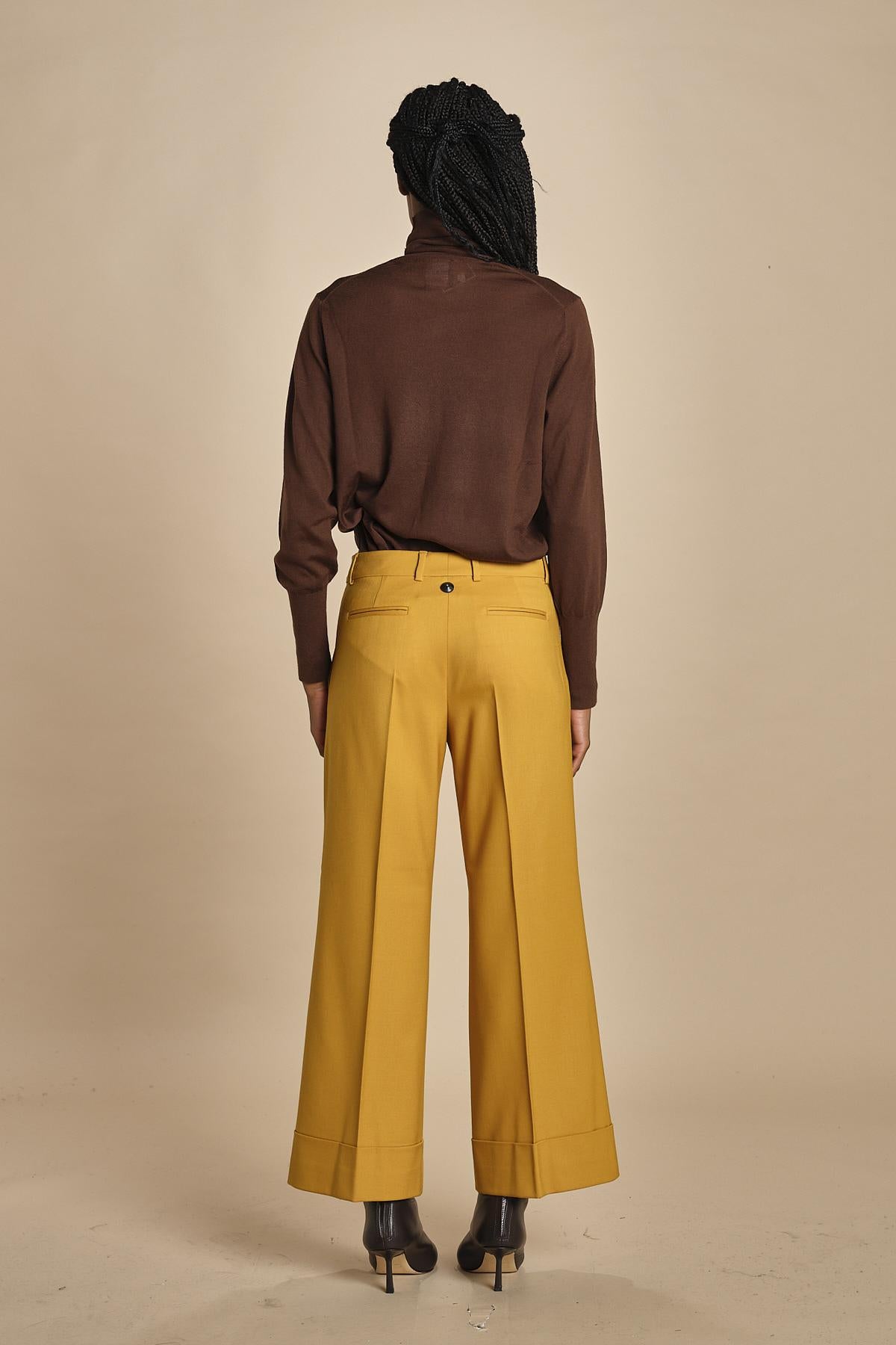 pantalone cropped con risvolto in gabardina by quelledue. La modella è alta 174 cm e indossa una taglia 40. Composizione: 97% lana vergine, 3% lycra.