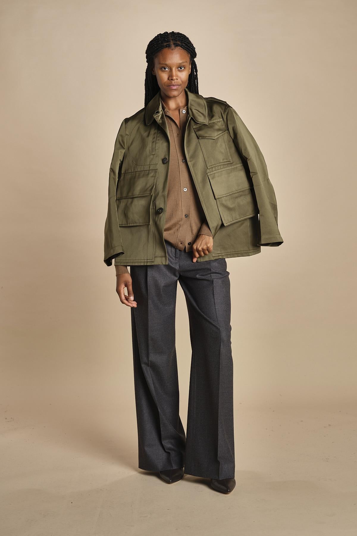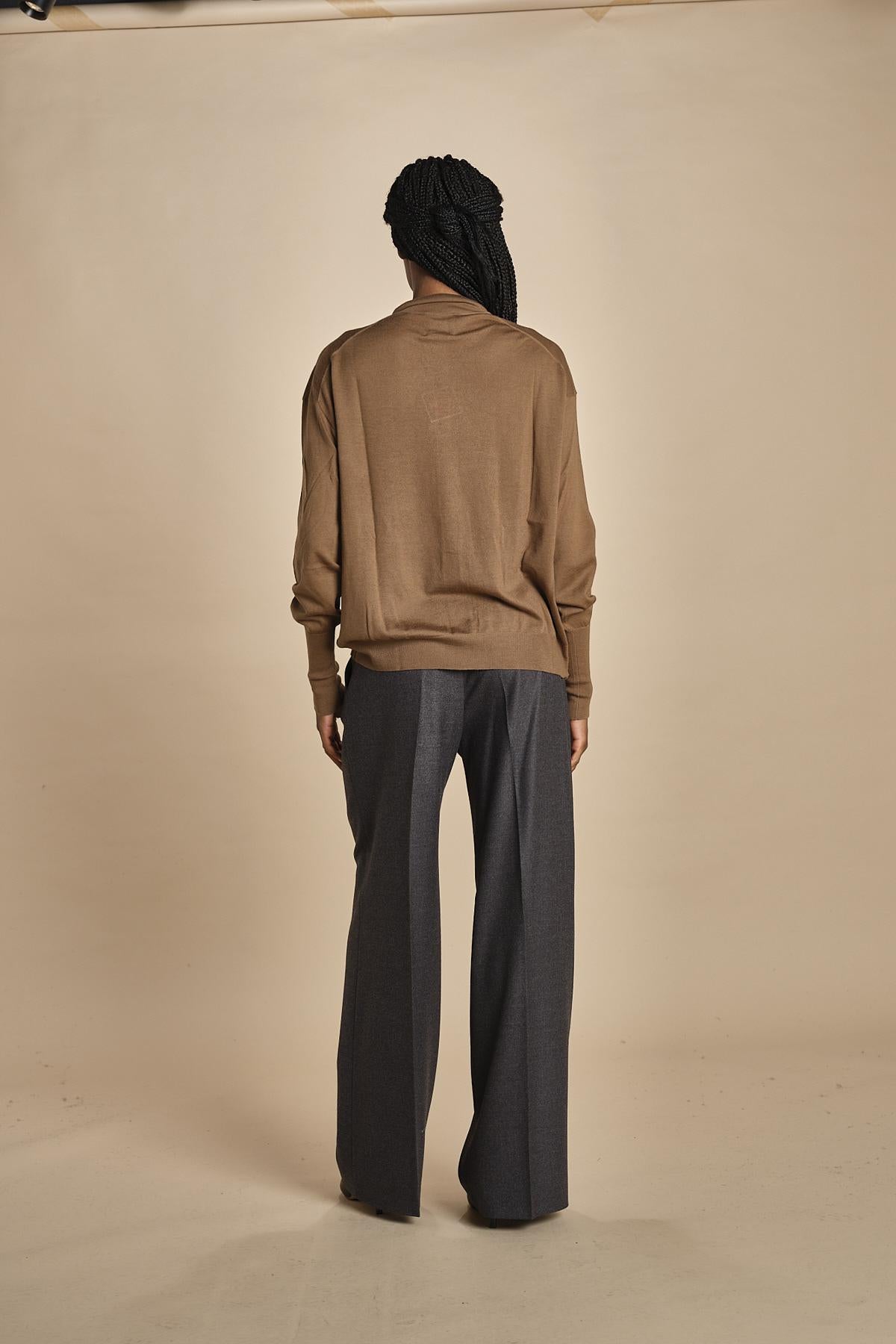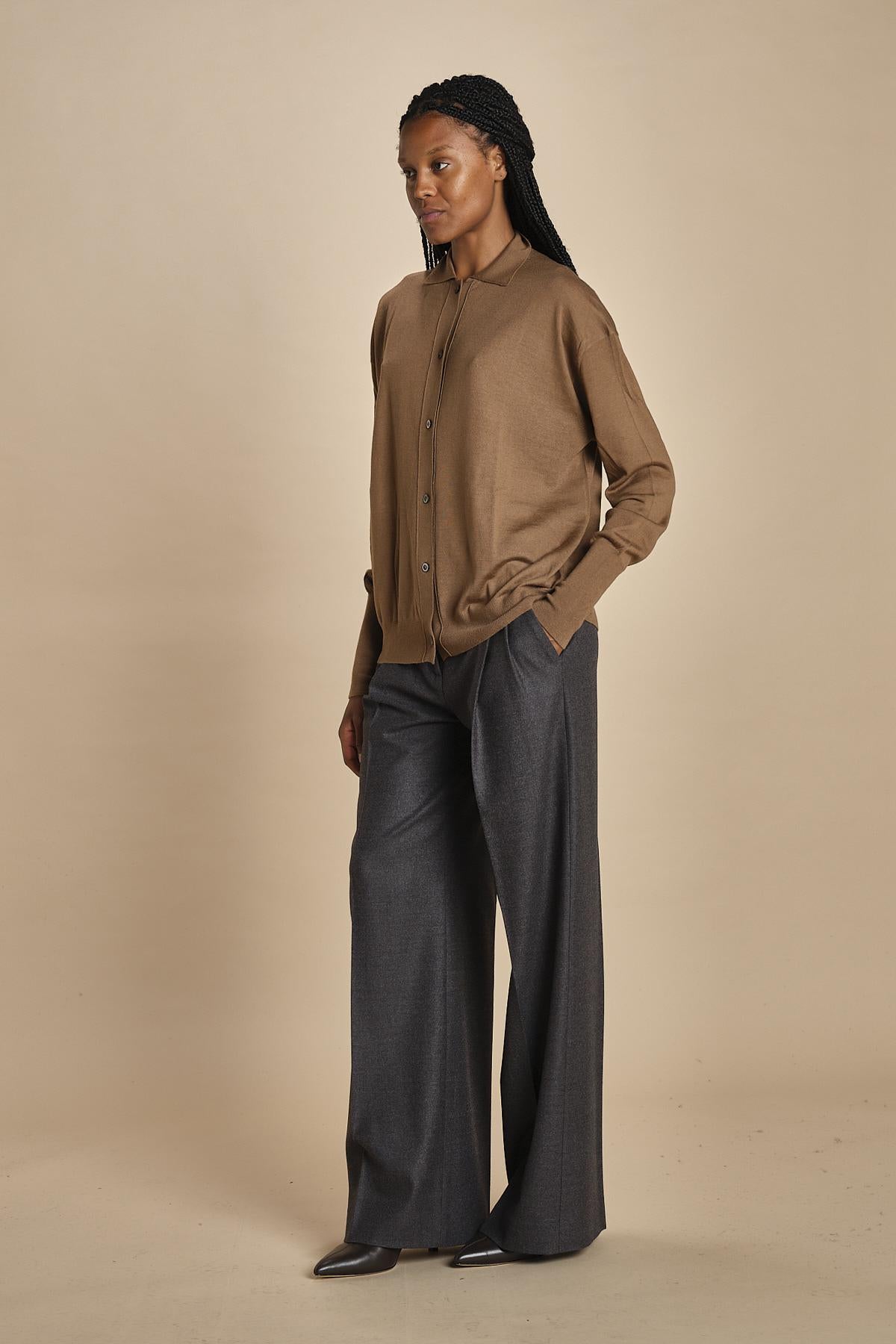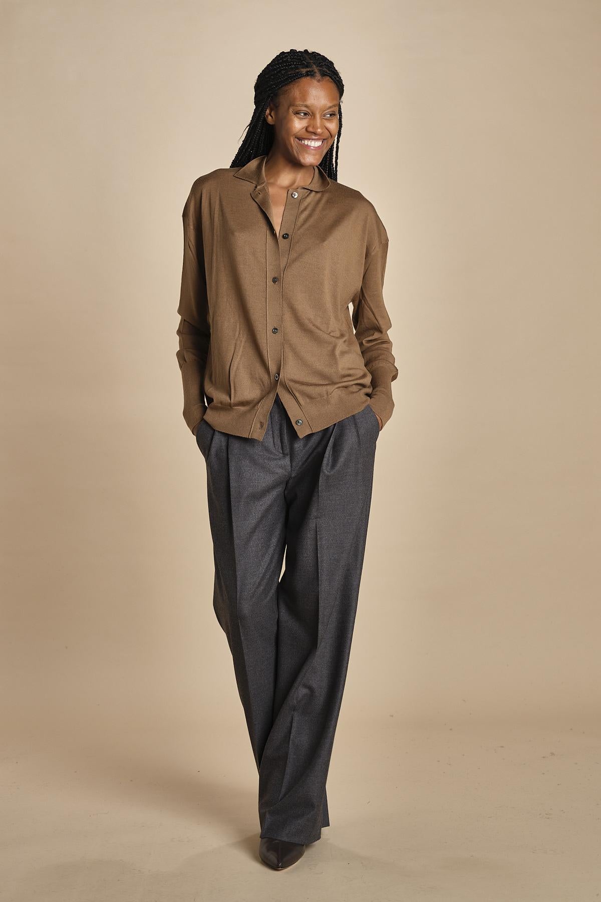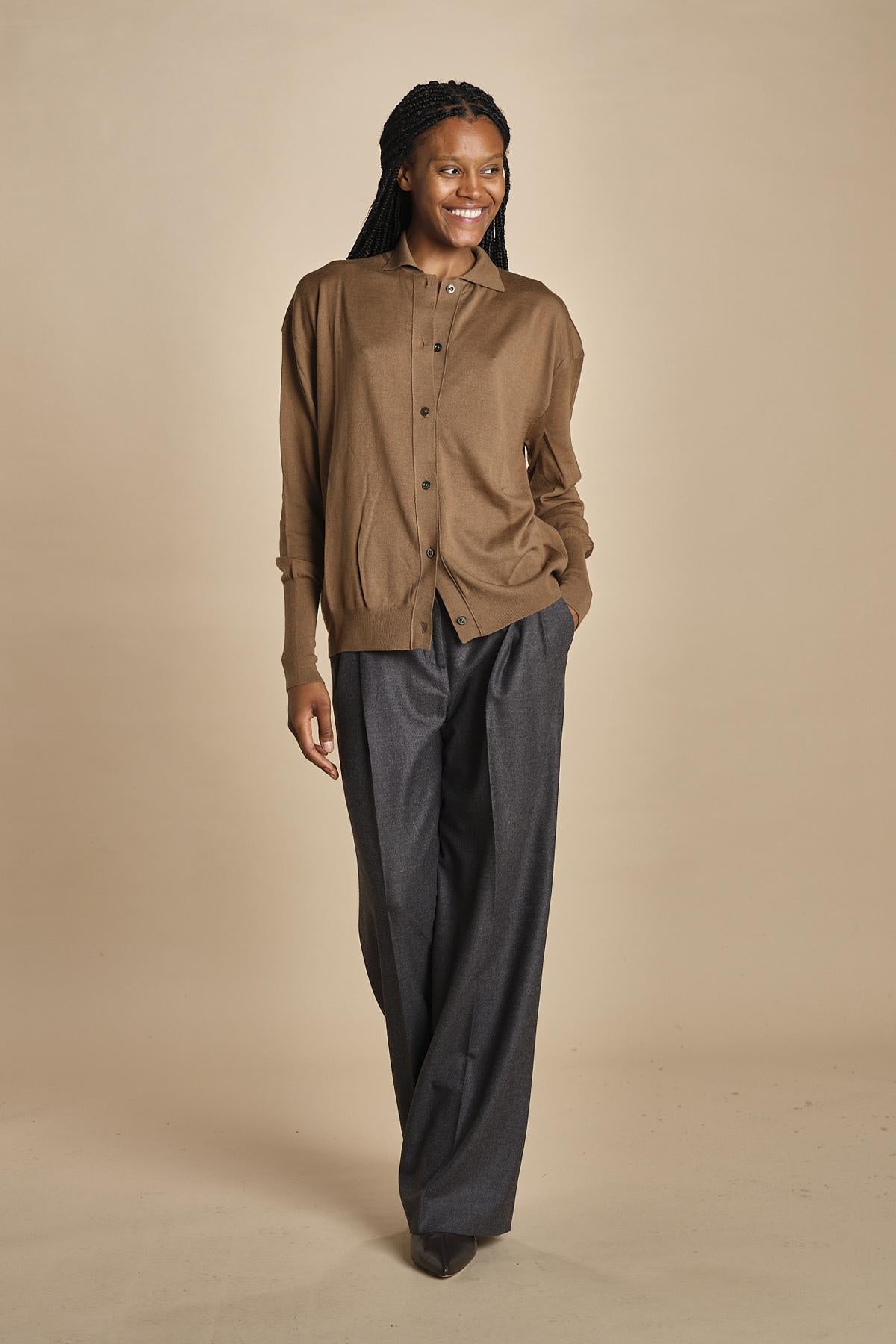 camicia over in merino. La modella è alta 174 cm e indossa una taglia S/M. Composizione: 100% lana merino
