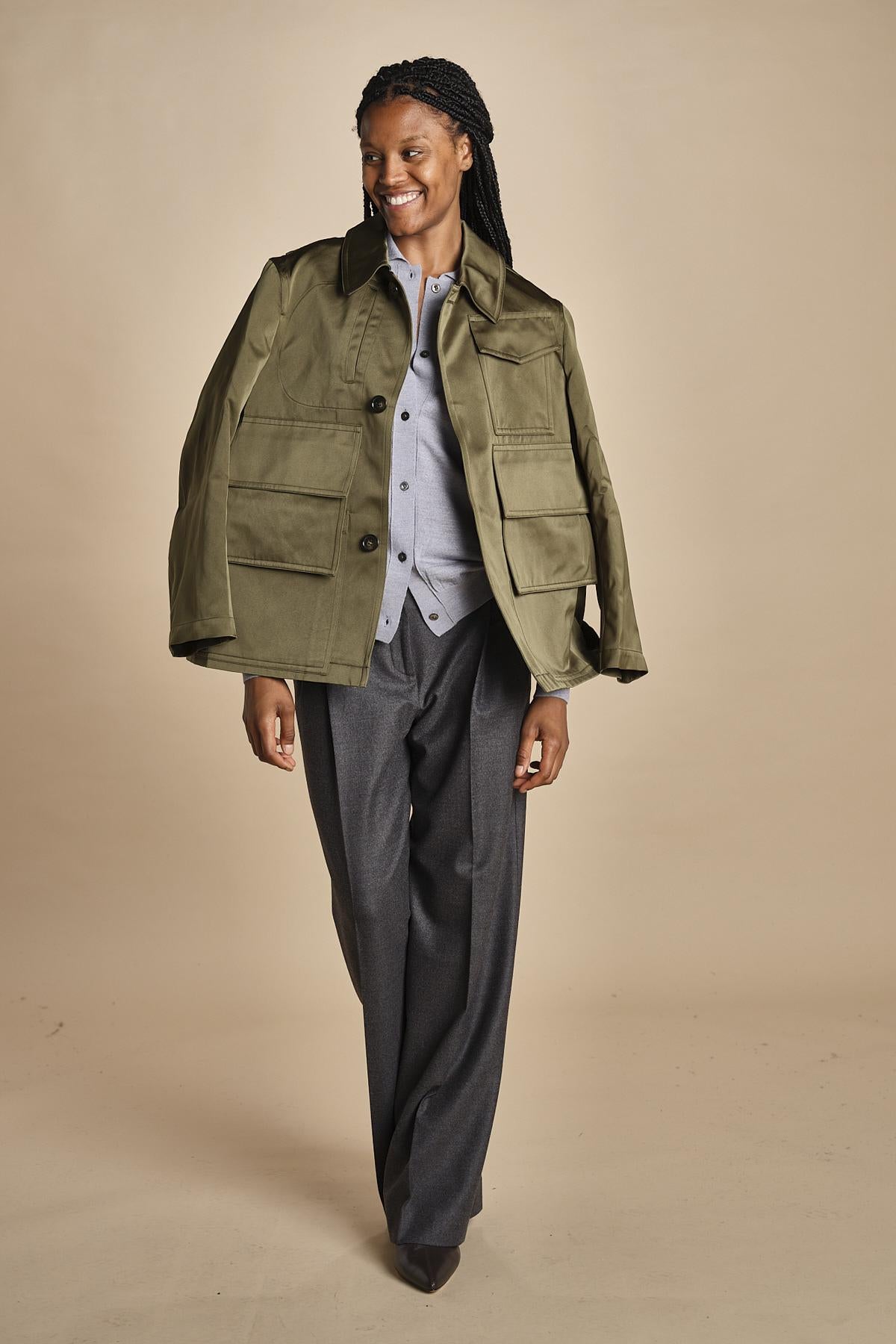 camicia over in merino. La modella è alta 174 cm e indossa una taglia S/M. Composizione: 100% lana merino