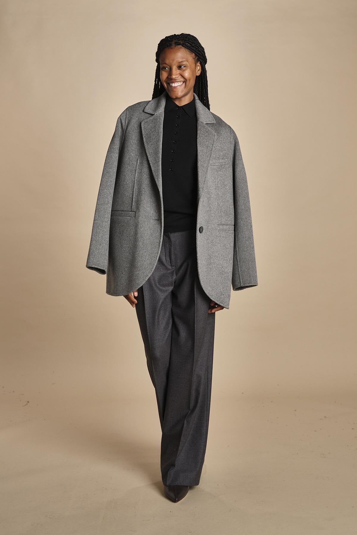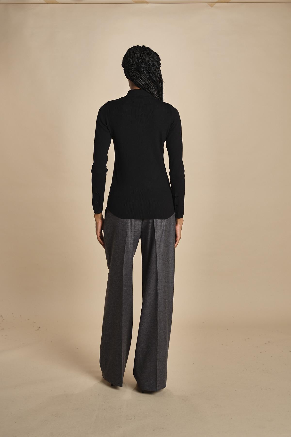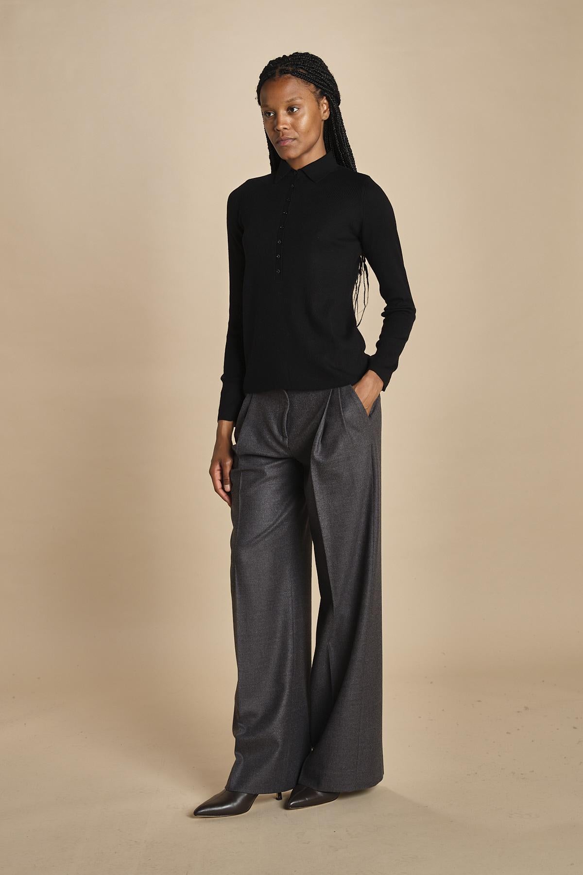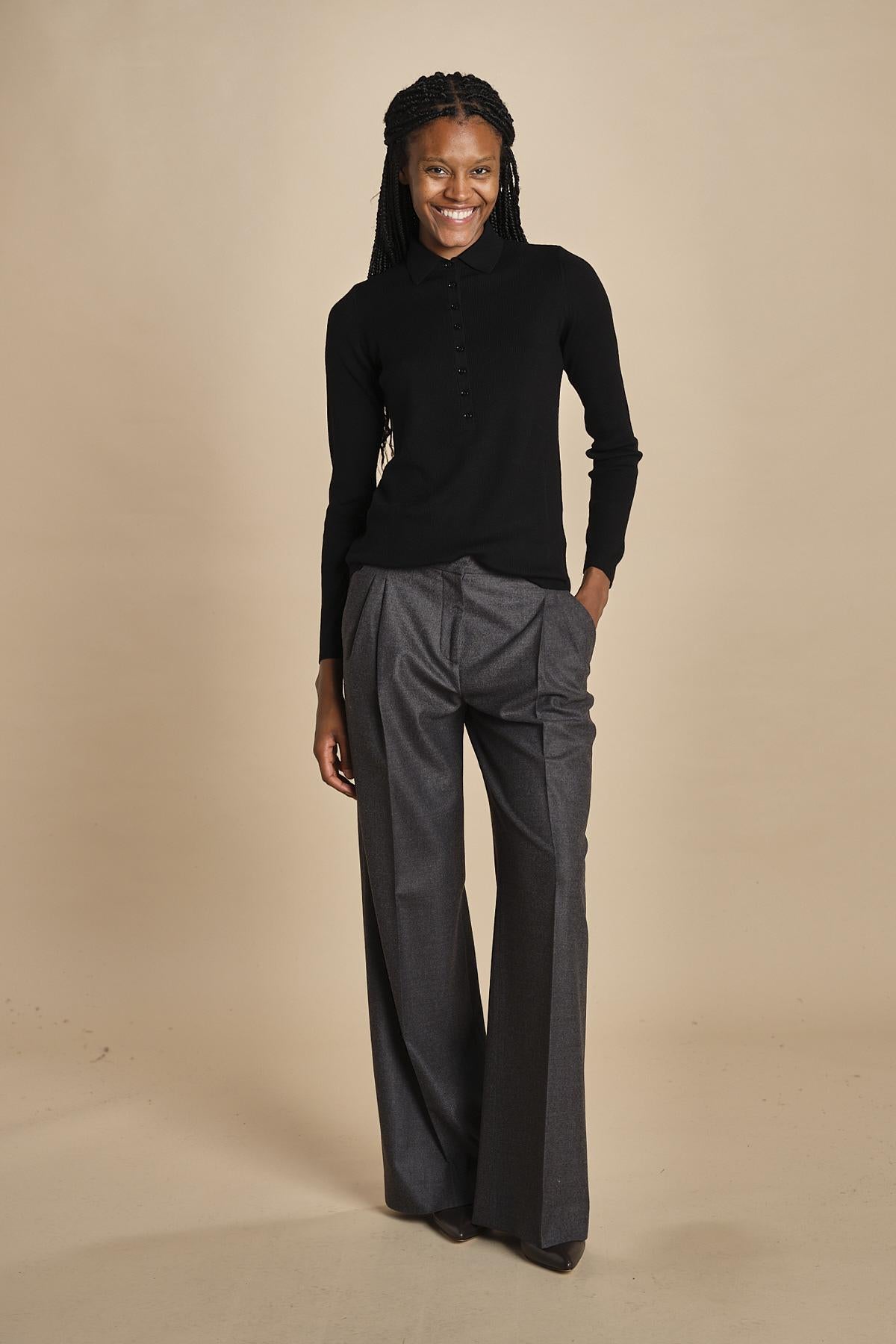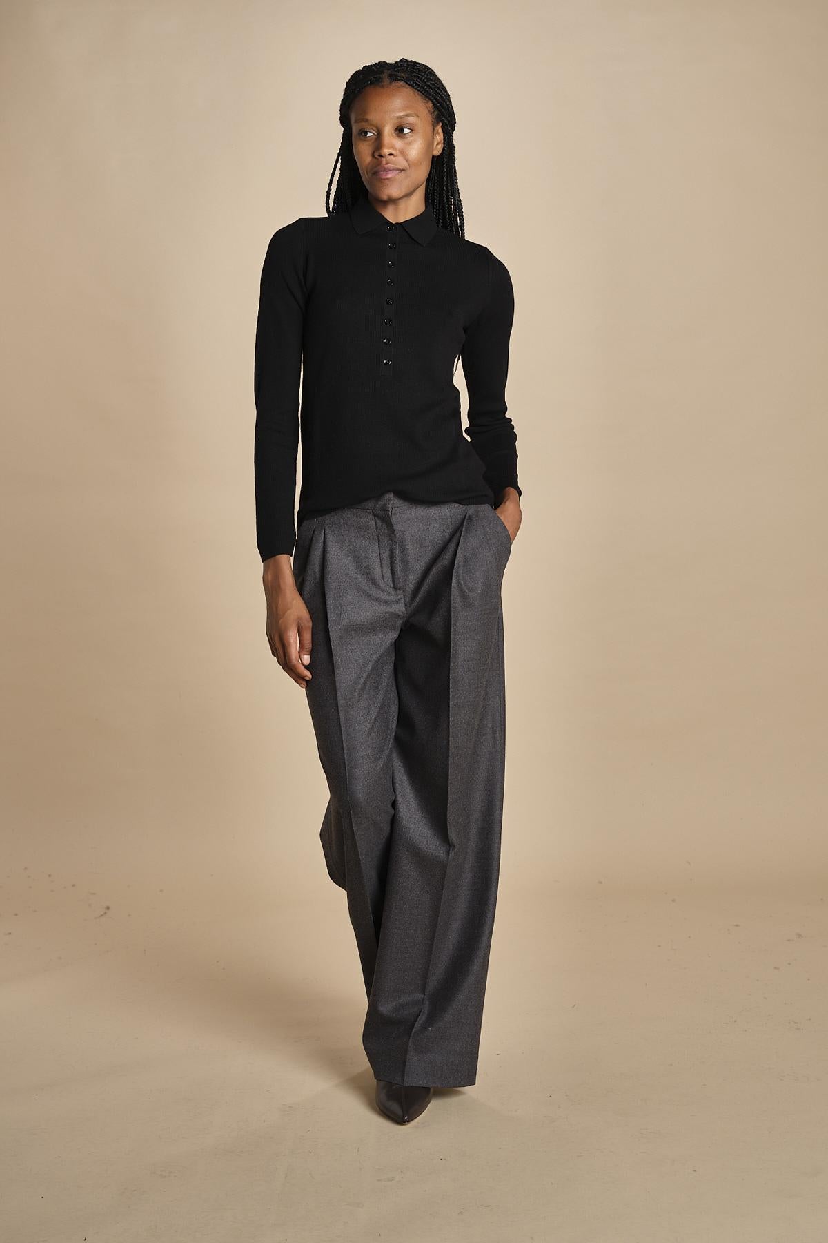 polo a costine in merino. La modella è alta 174 cm e indossa una taglia S. Composizione: 100% lana merino