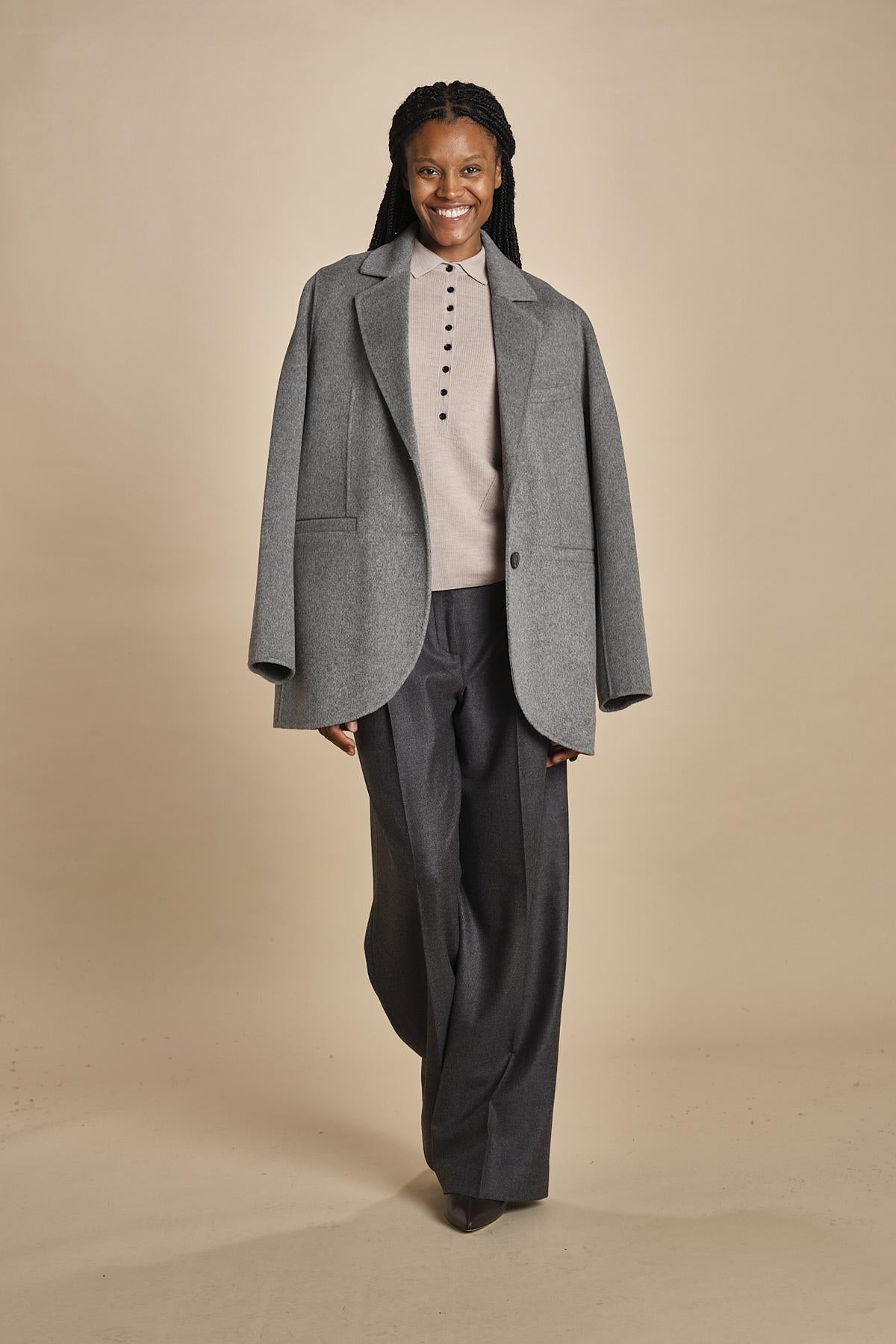 polo a costine in merino. La modella è alta 174 cm e indossa una taglia S. Composizione: 100% lana merino