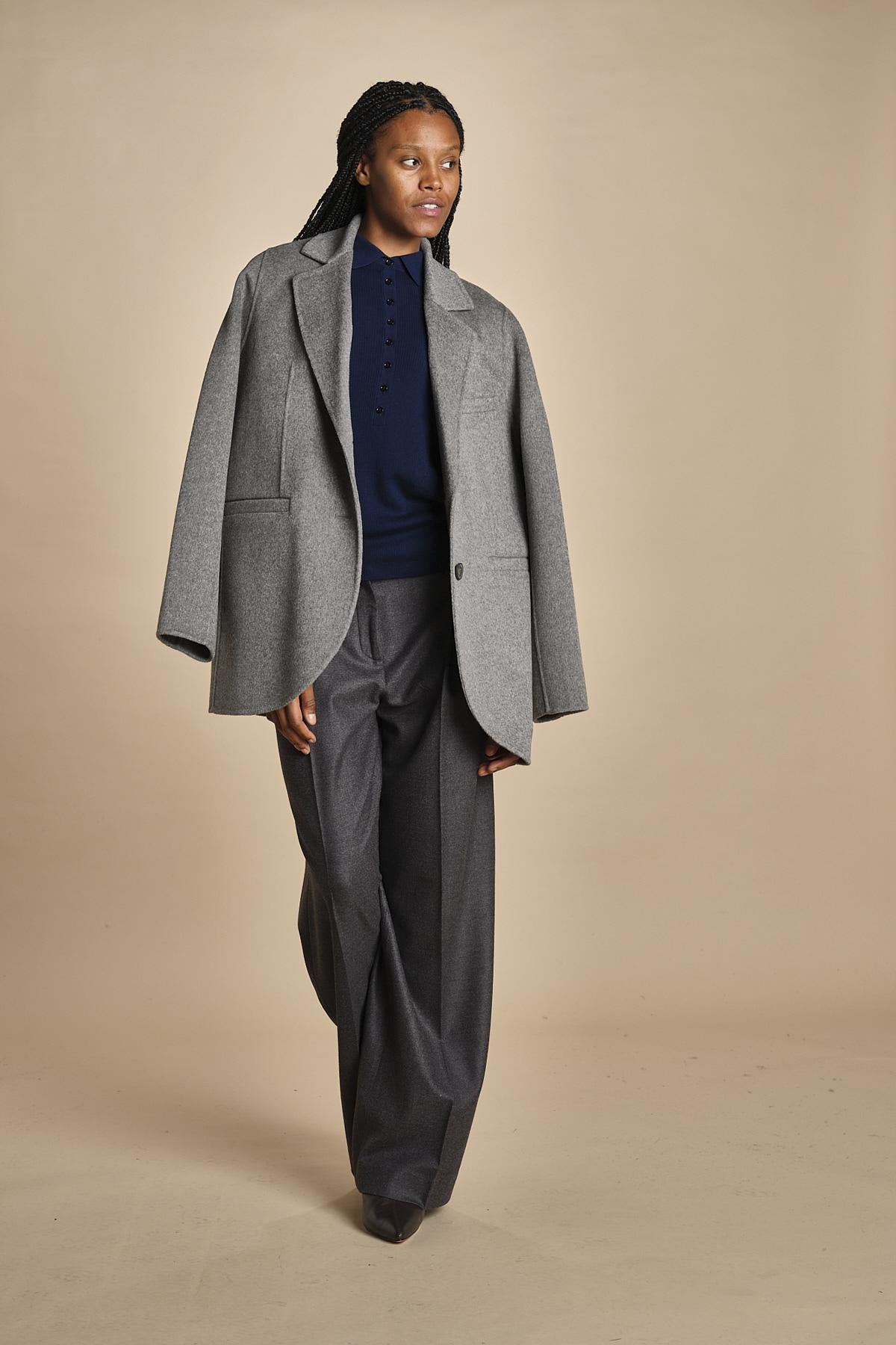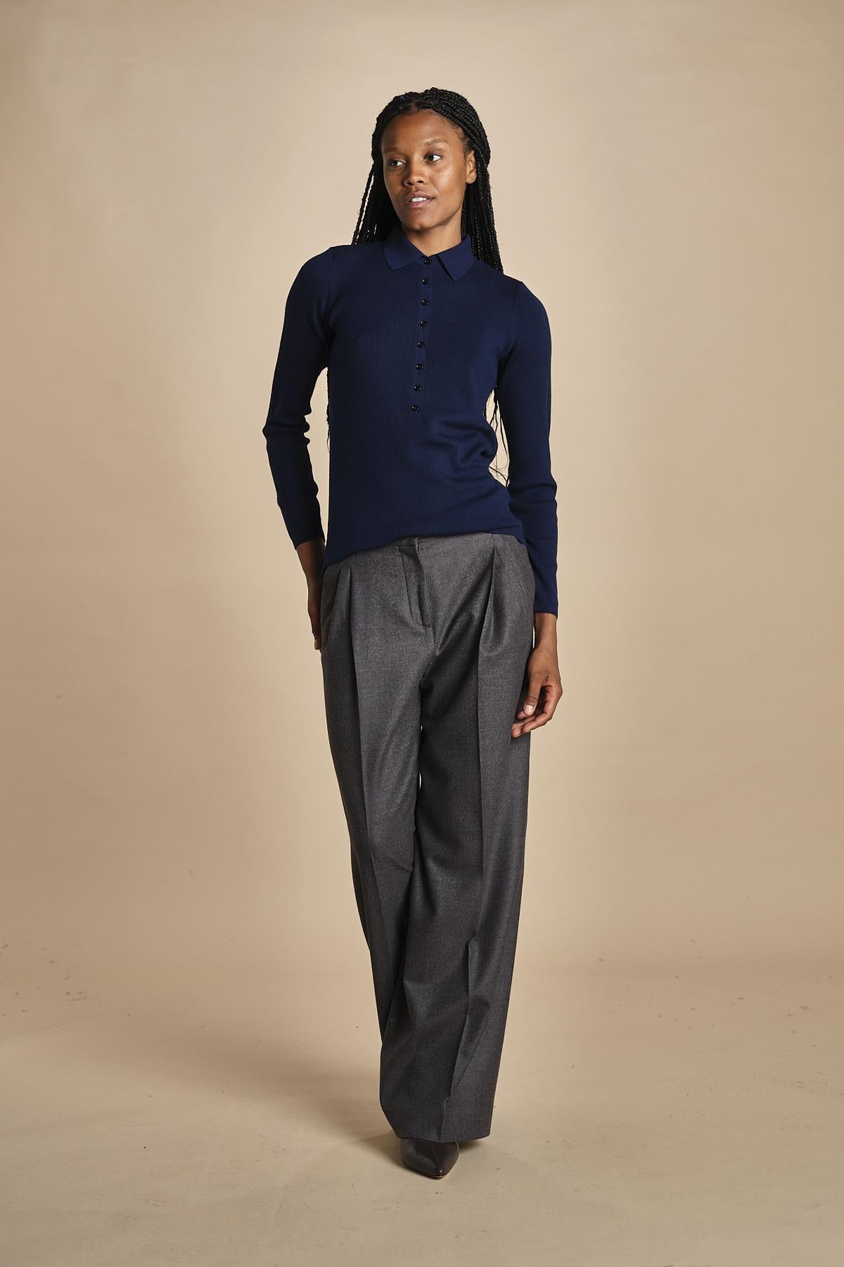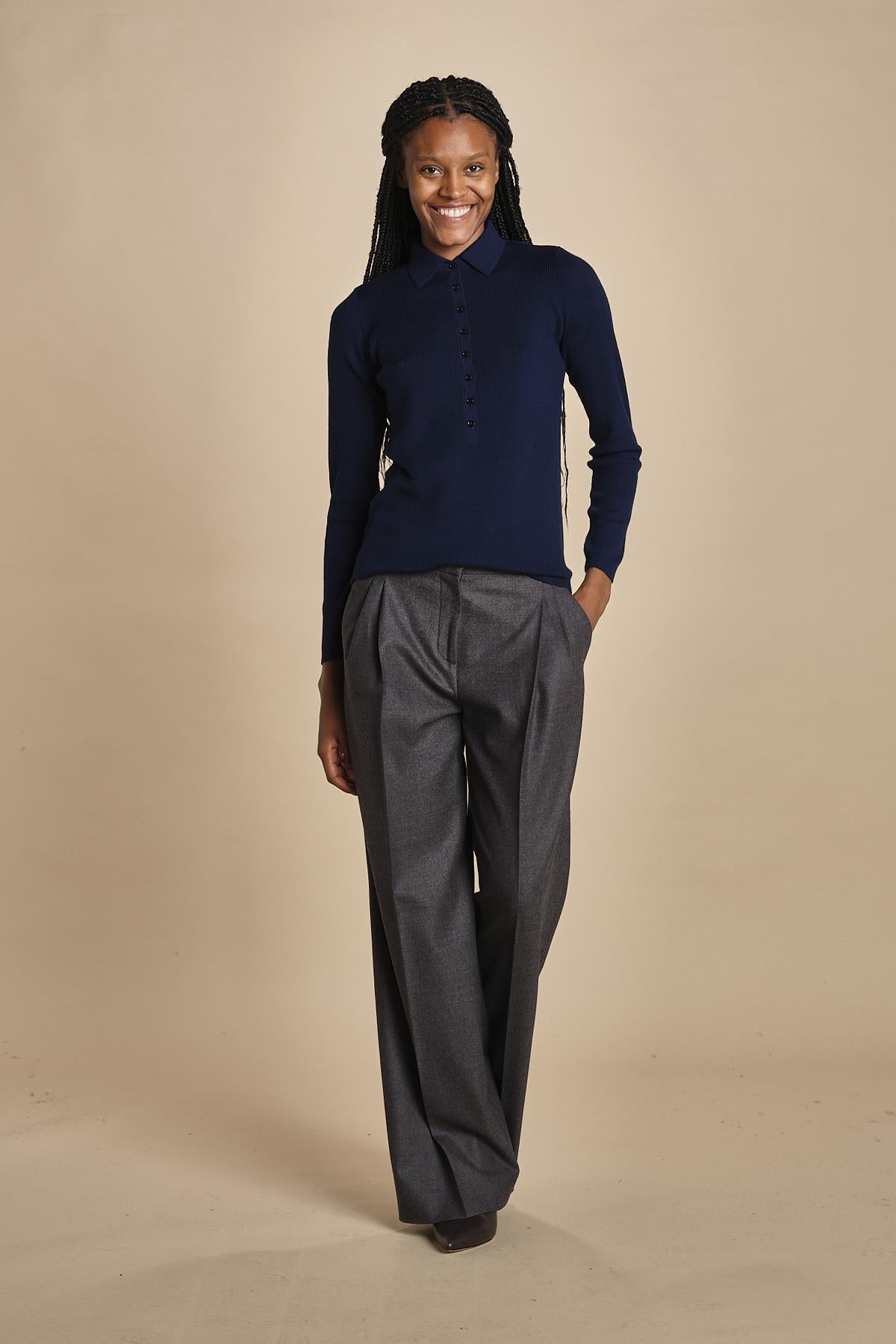 polo a costine in merino. La modella è alta 174 cm e indossa una taglia S. Composizione: 100% lana merino