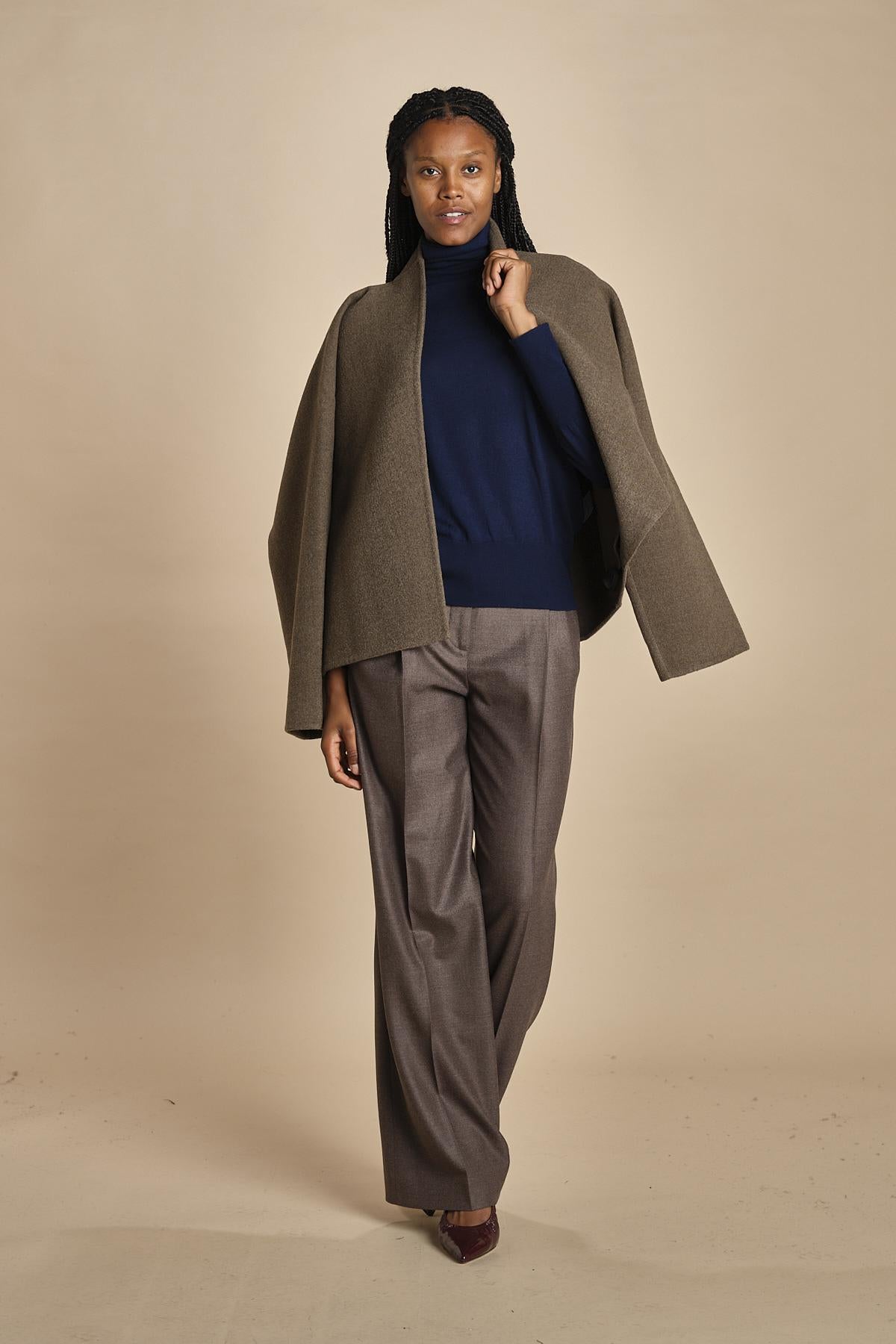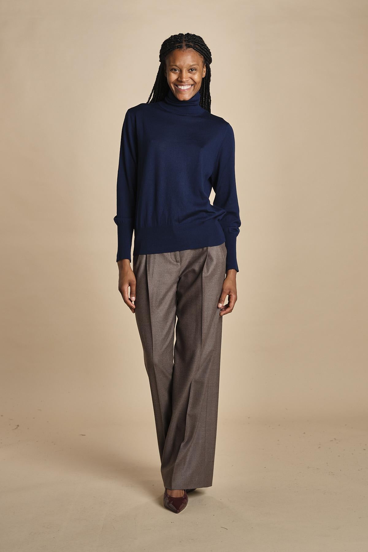 dolcevita over in merinos. La modella è alta 174 cm e indossa una taglia S. Composizione: 100% lana merino