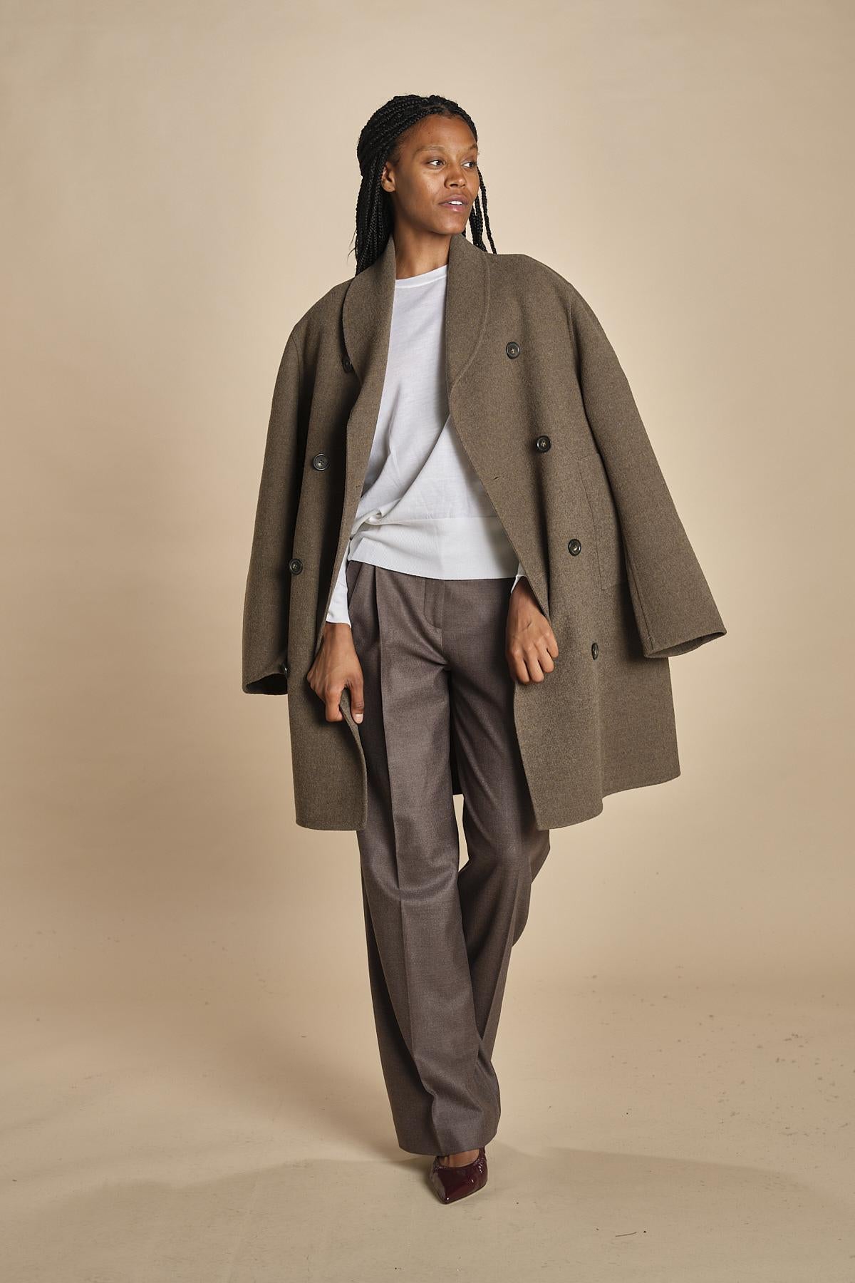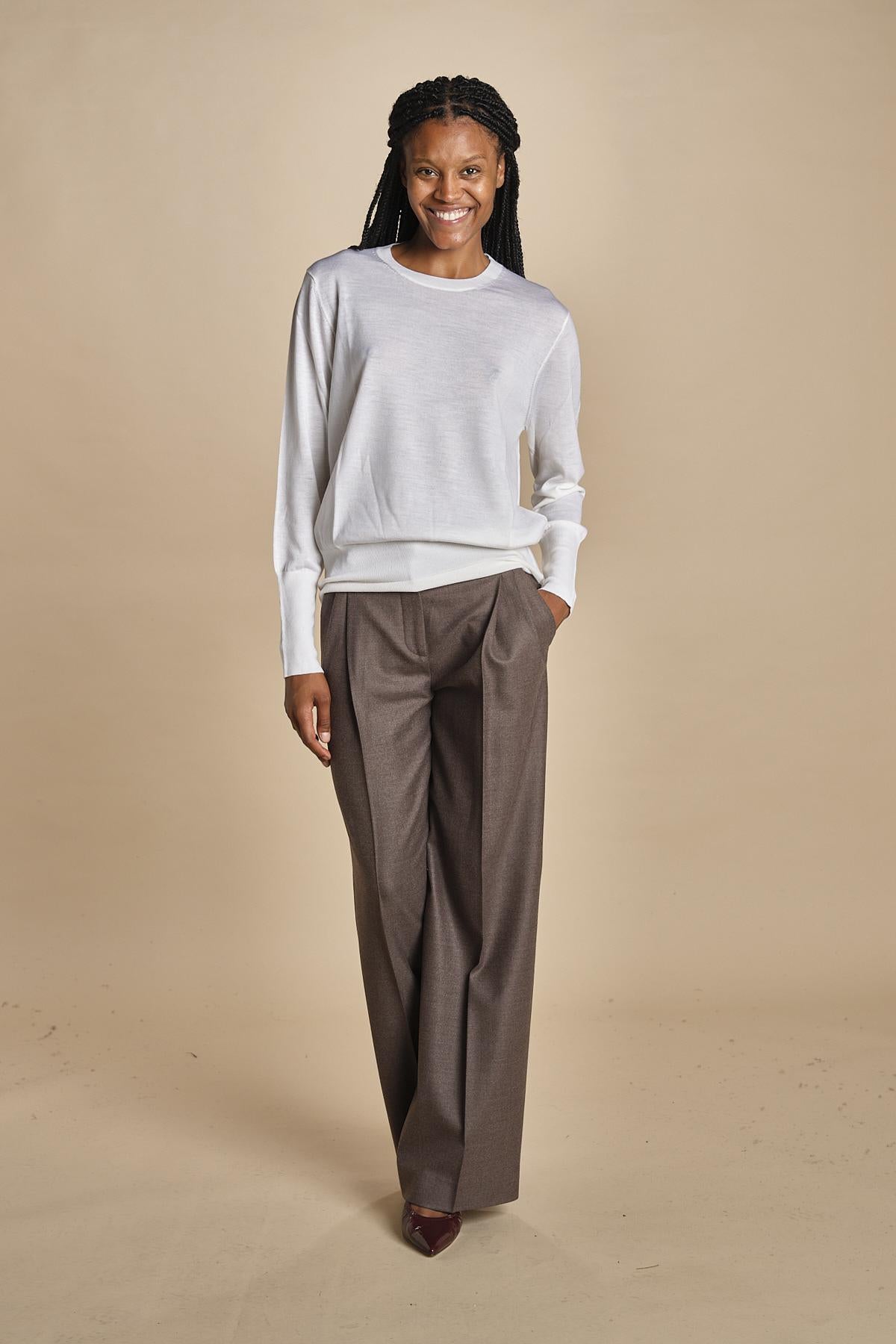 girocollo over in merino. La modella è alta 174 cm e indossa una taglia S. Composizione: 100% lana merino