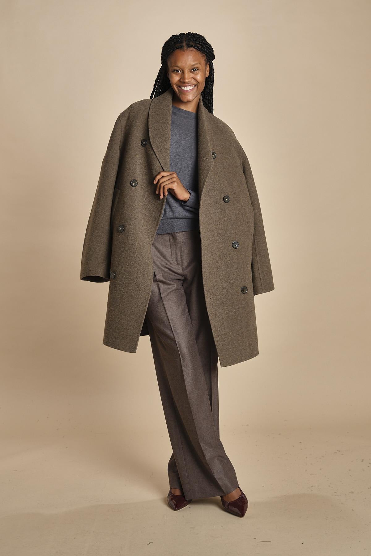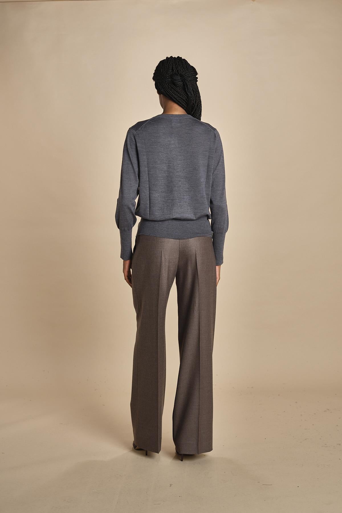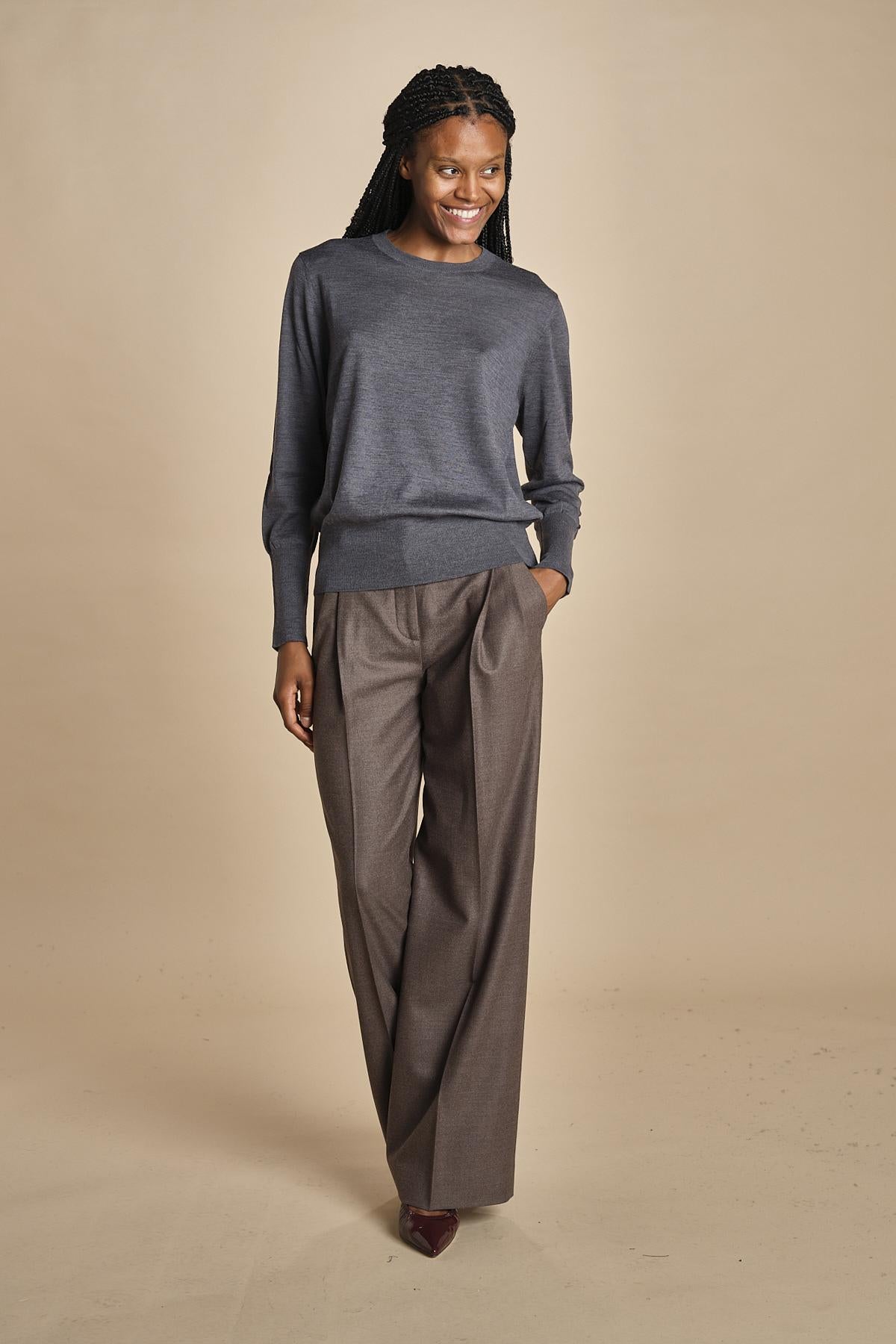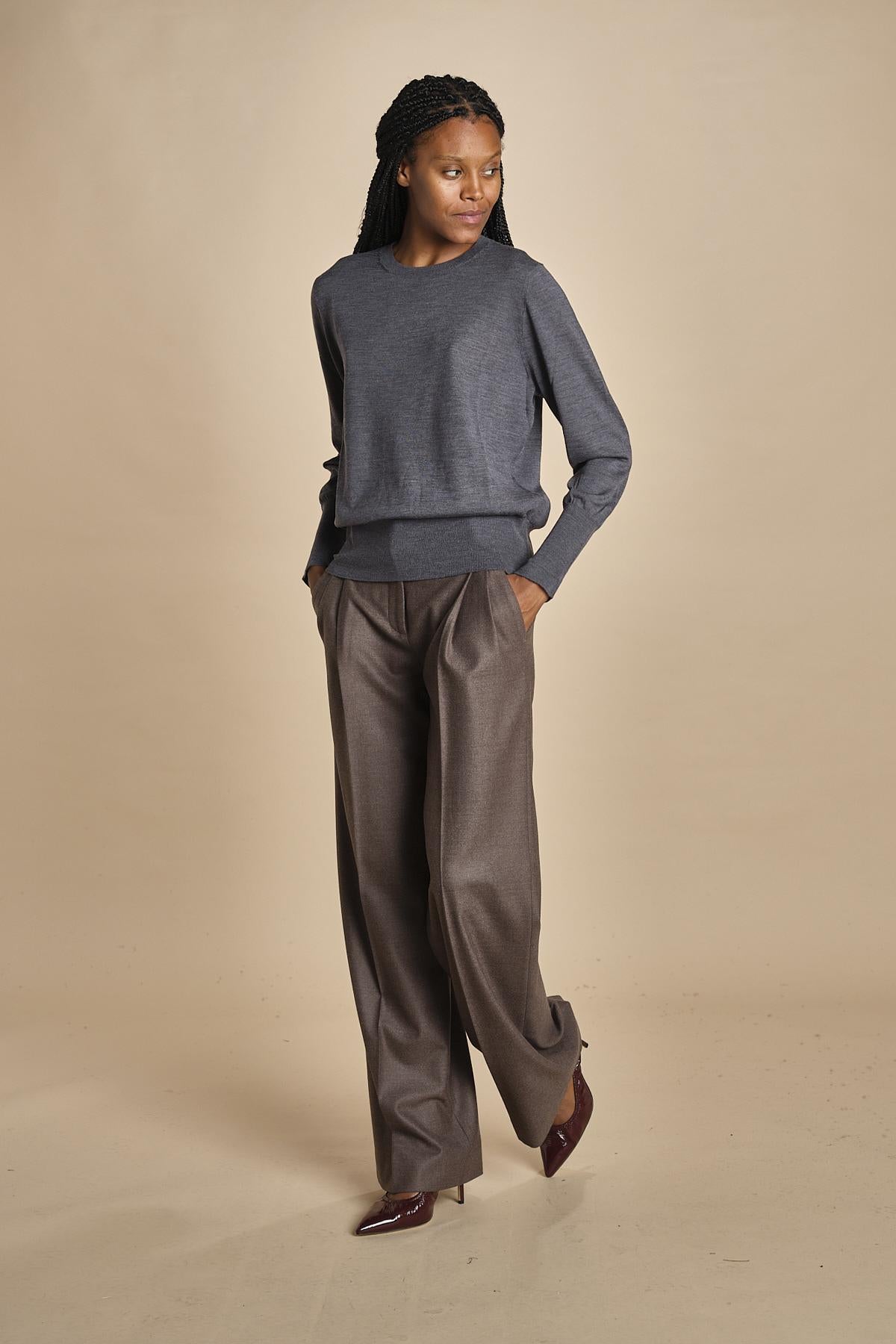 girocollo over in merino. La modella è alta 174 cm e indossa una taglia S. Composizione: 100% lana merino